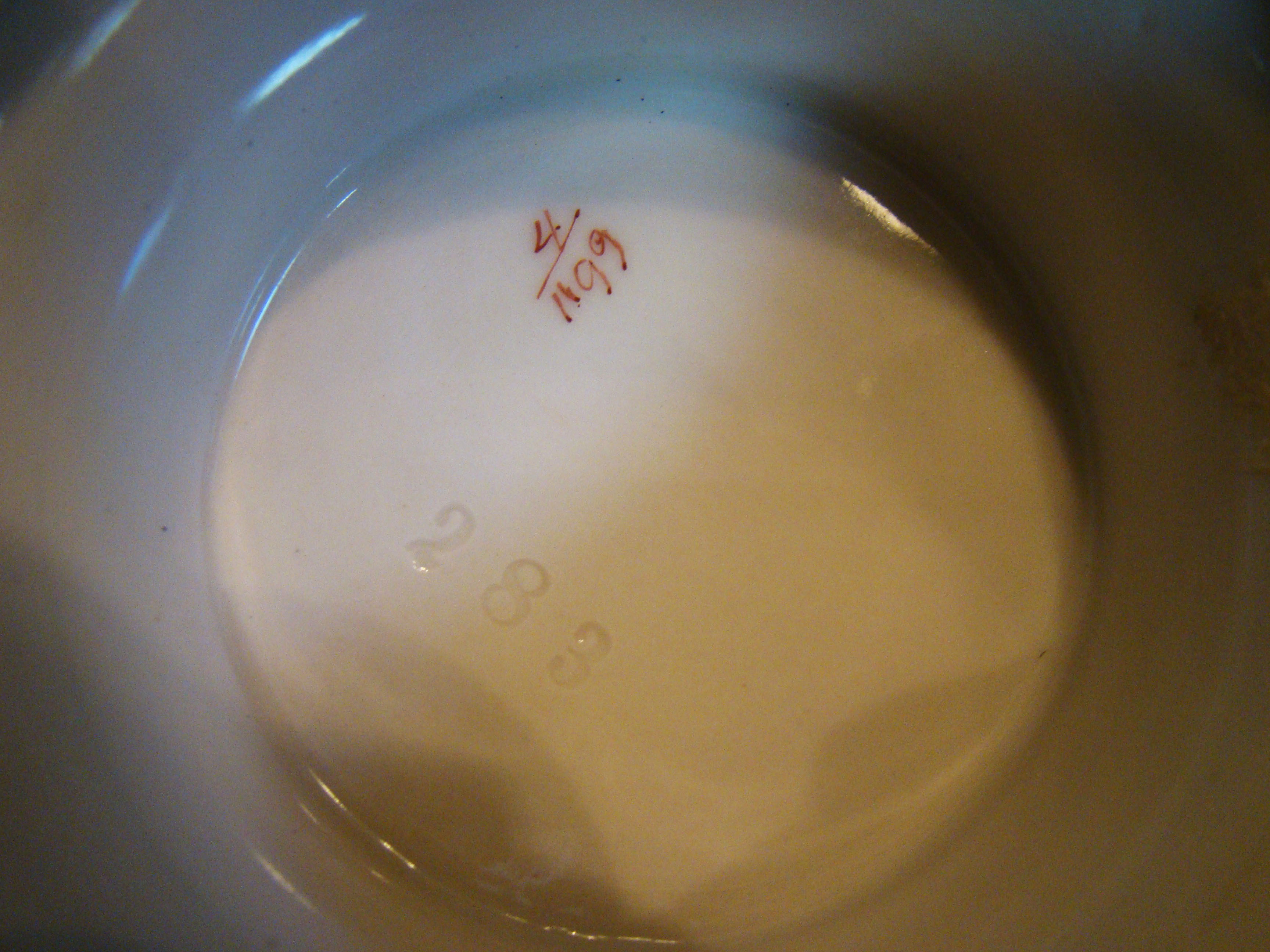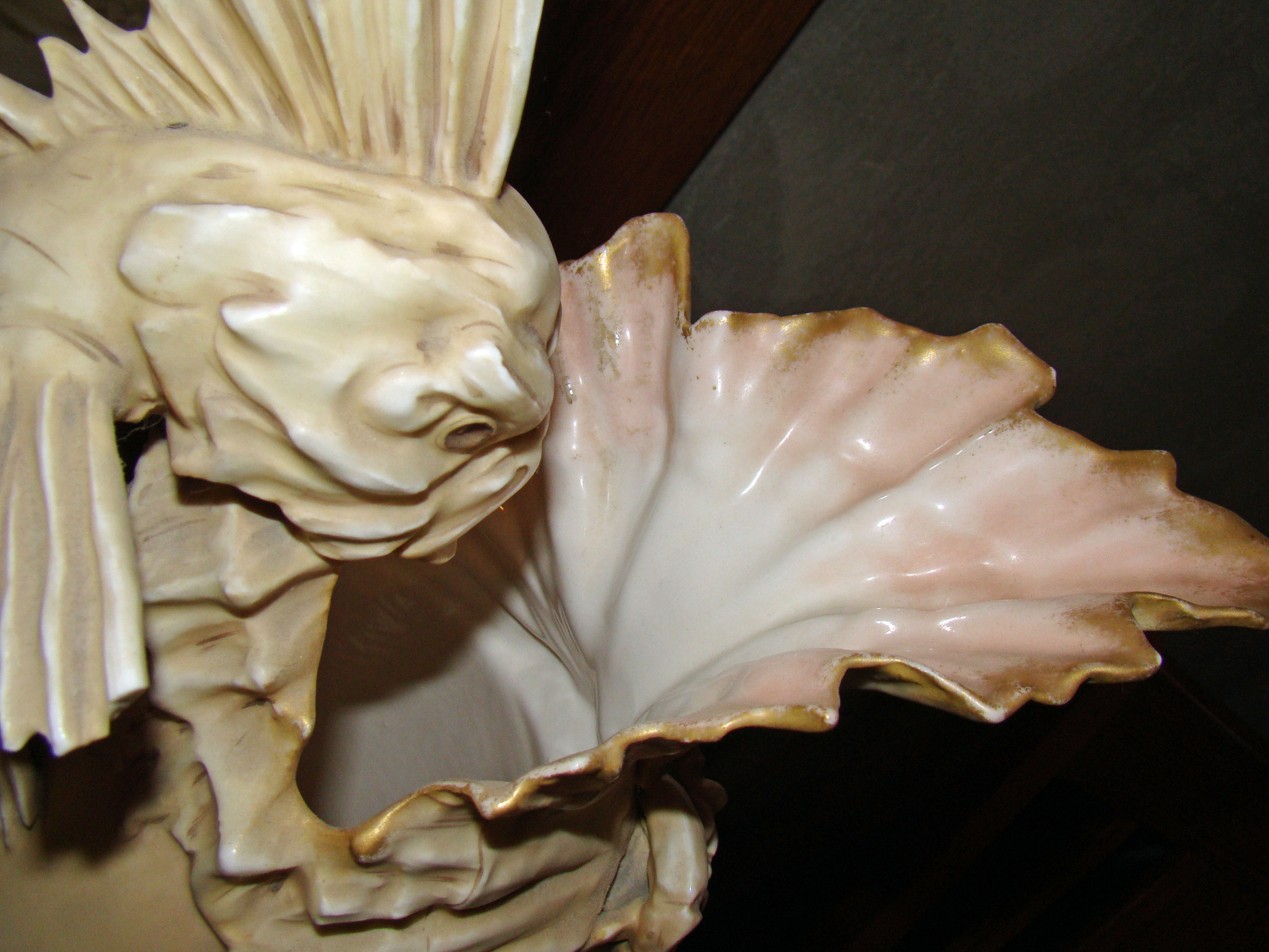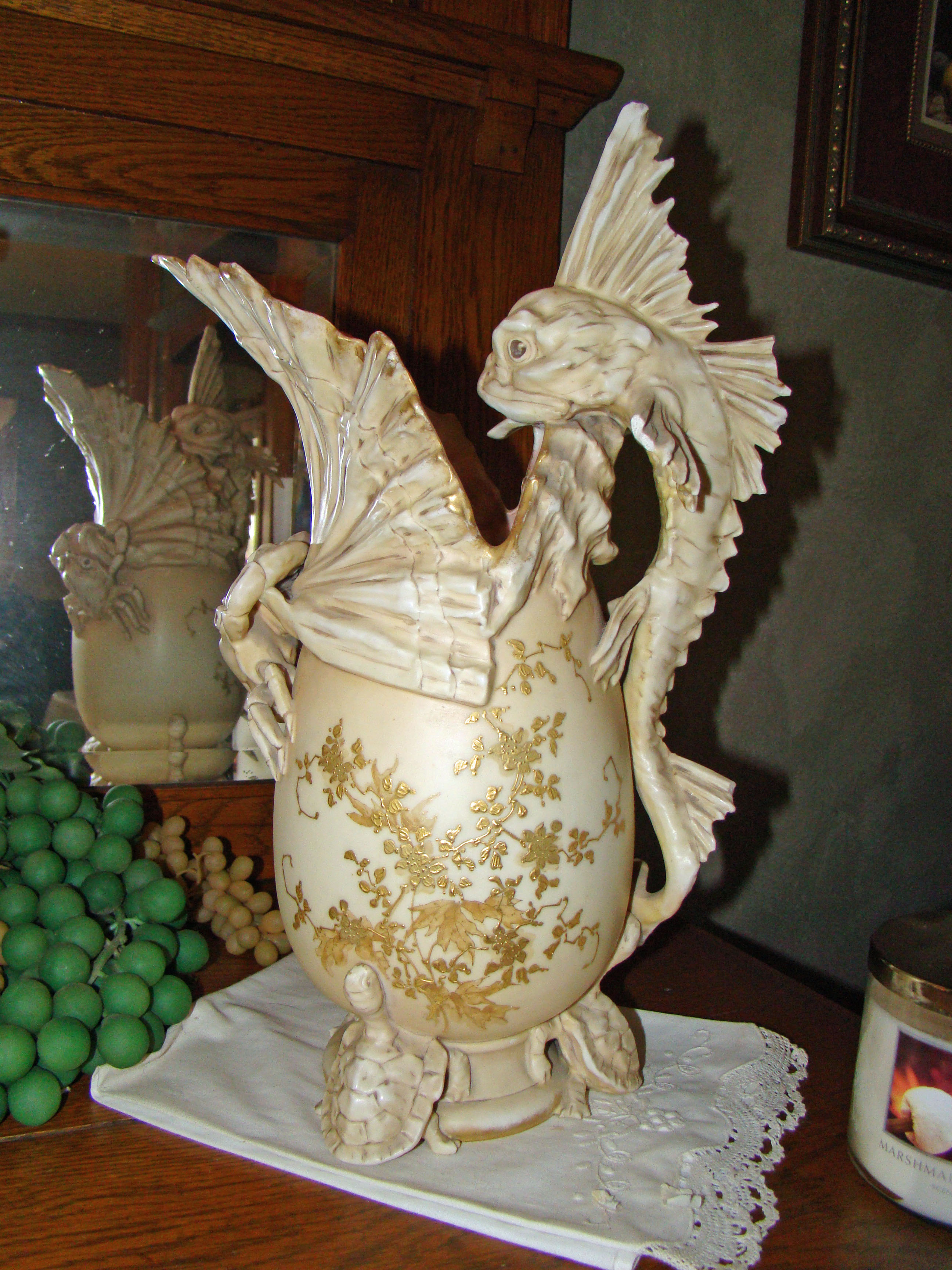 I know very little about this pitcher. It is something my grandparents bought over 60 years ago and they told me it was old at the time they got it. The only marks are on the bottom. A stamped in "283" and red hand-written numbers, as you can see in the photo. It stands about 16" tall and is about 10" at its widest. There are raised gold flowers painted on both sides. The inside of the shell "spout" is a muted pink. It is VERY ornate with crabs, shells, turtles and fish. I've done lots of research and haven't found another pitcher like this so I'm hoping some of you can help. Thank you!