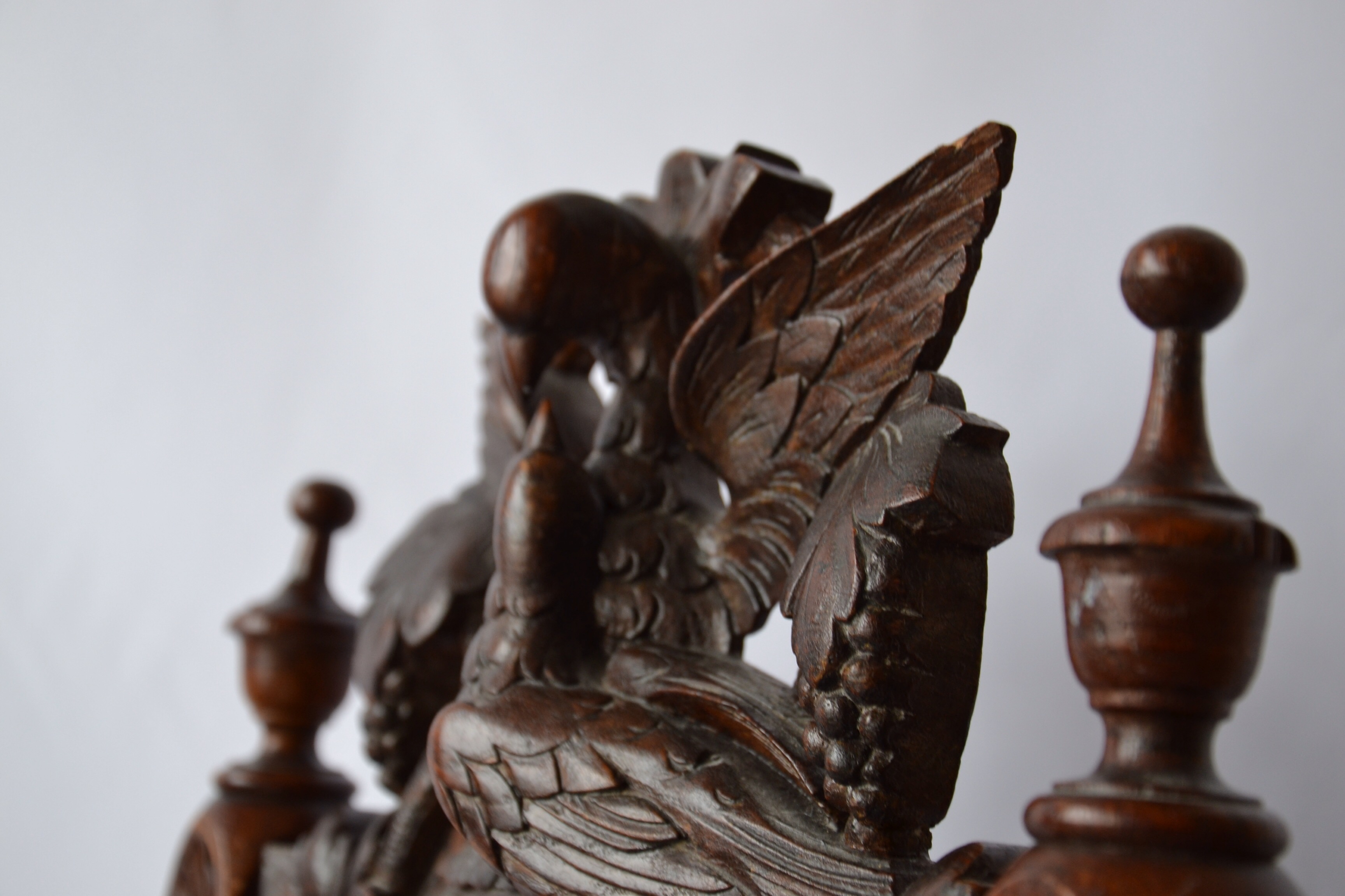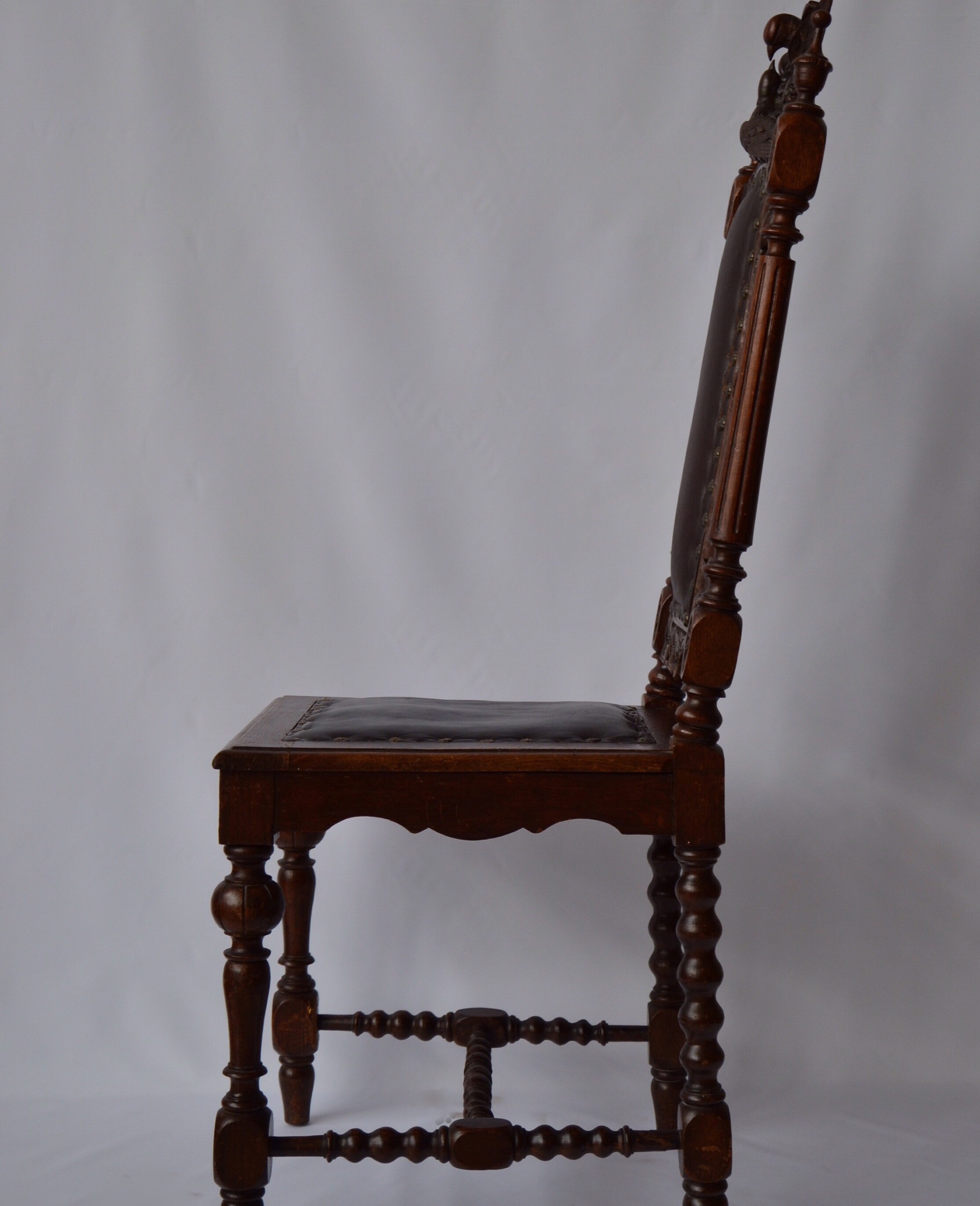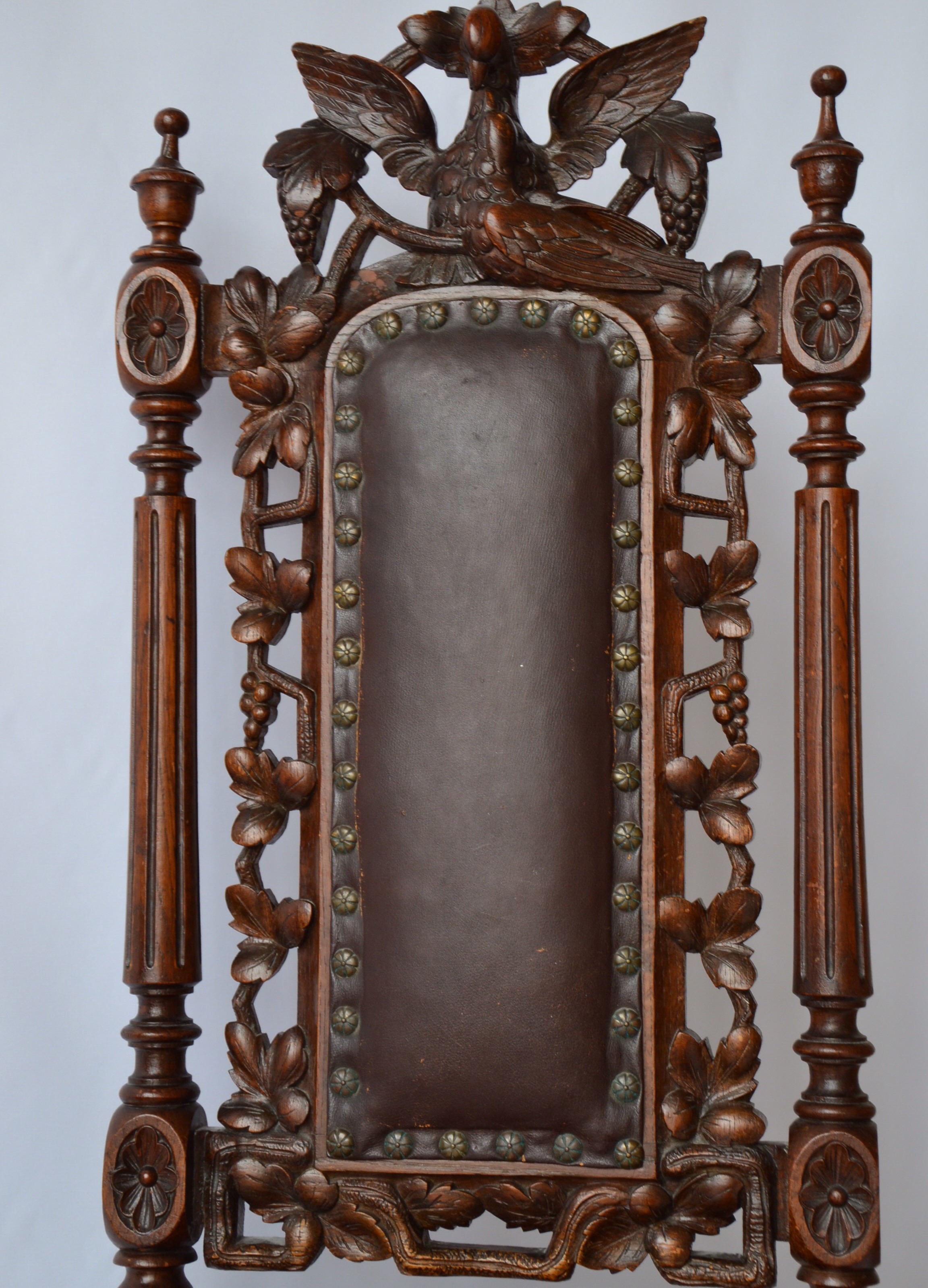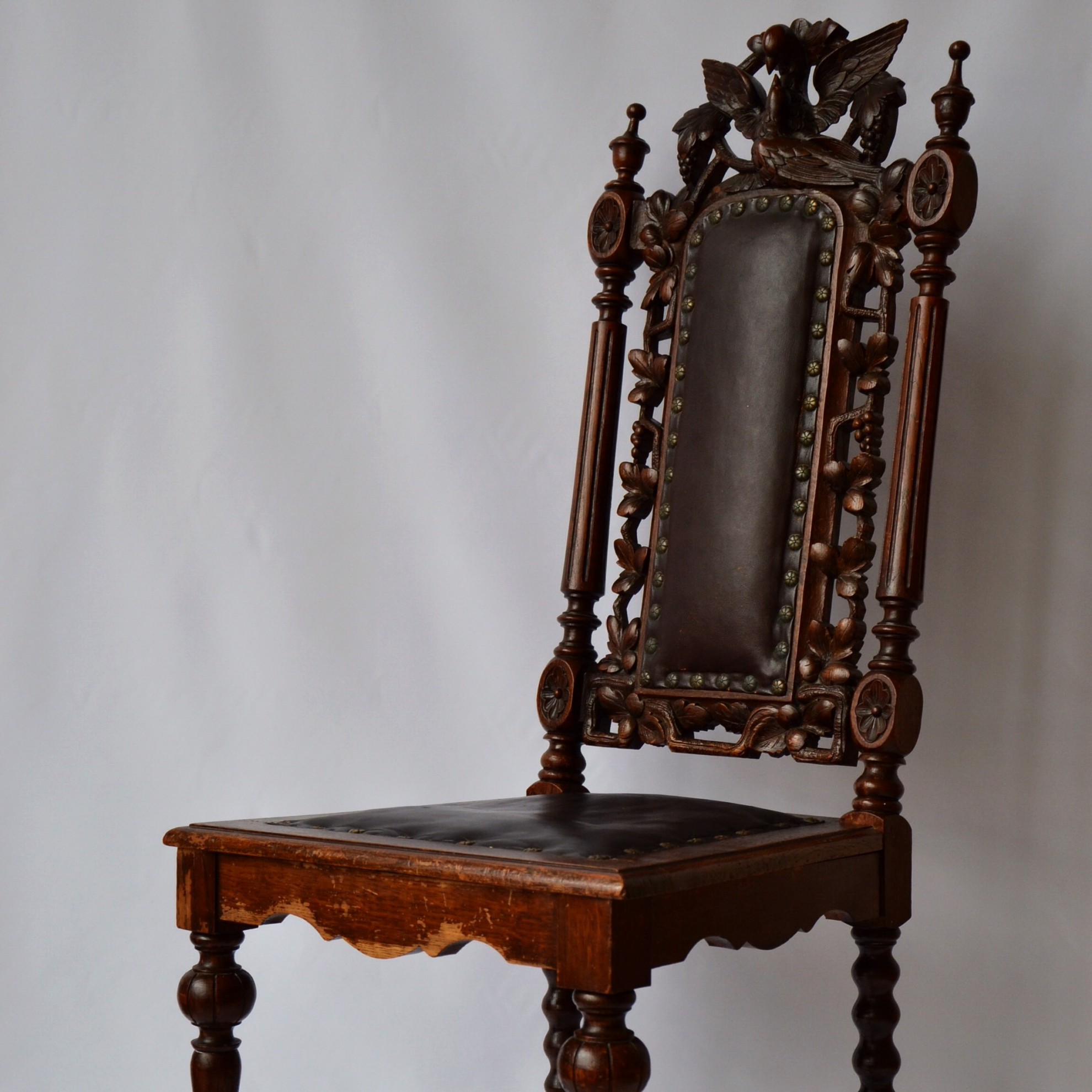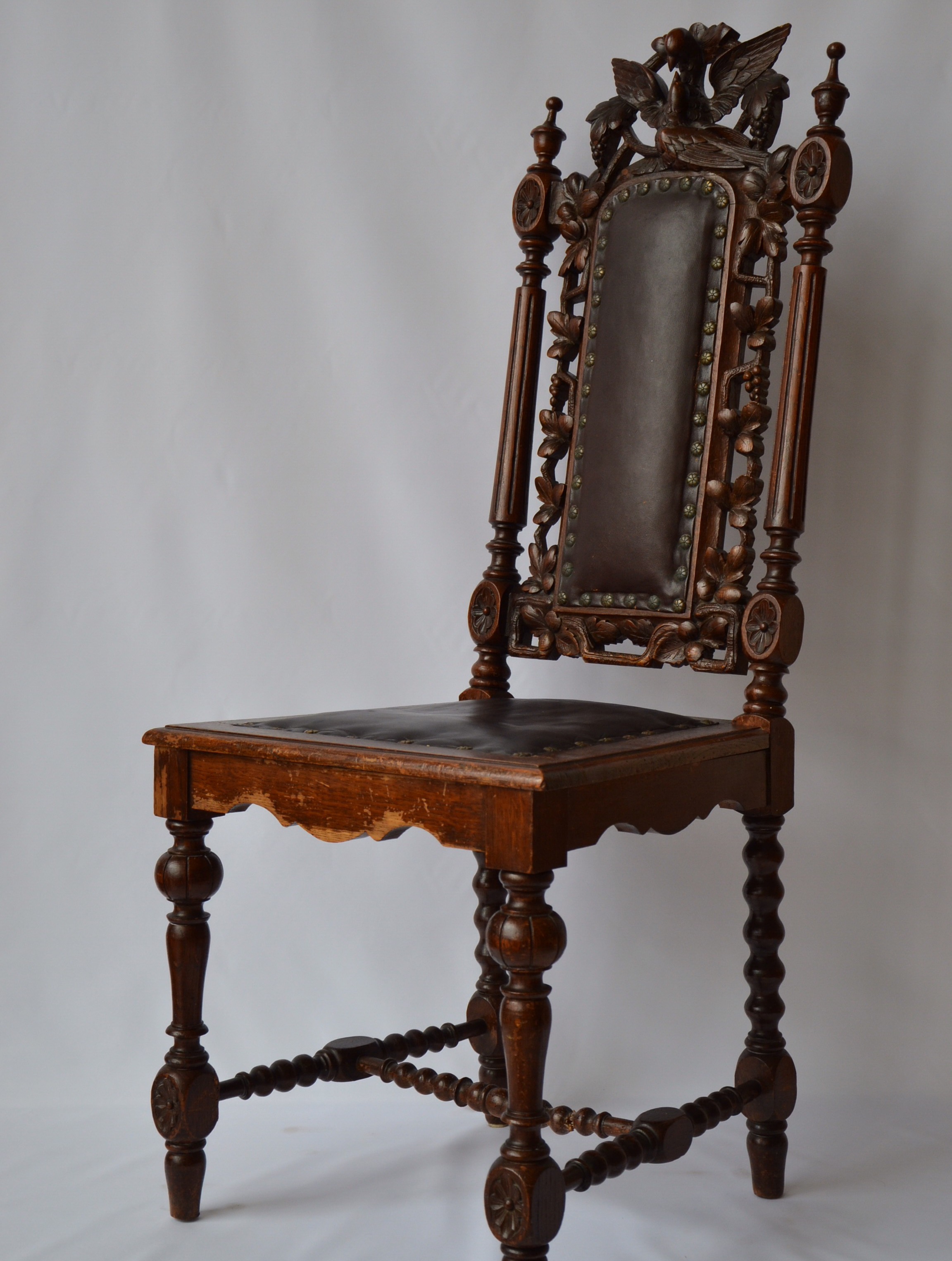 I have 4 of these old chairs. Someone told me they could be from 18th-19th century. Made from wood. Good condition. One has a broken bird decor.