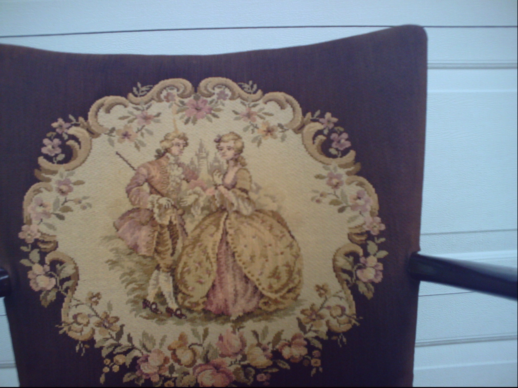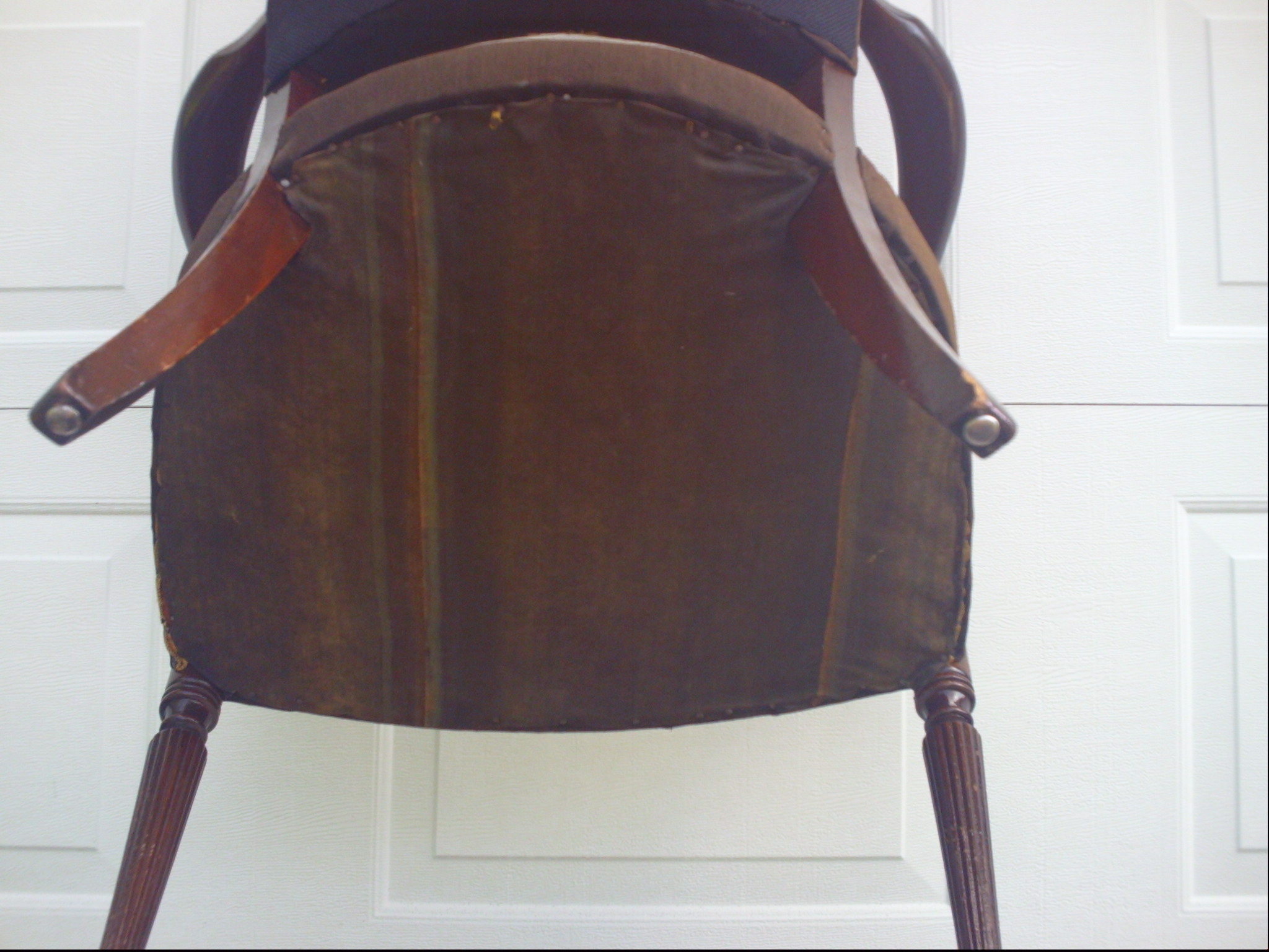 Chair is at least 80-100 years old.  Repairs have been made to back side and underside of the cushions.  The seat cushion has a spring mechanism that may have been added.  All of the material on the seat cushion faces is original.  Slightly faded.