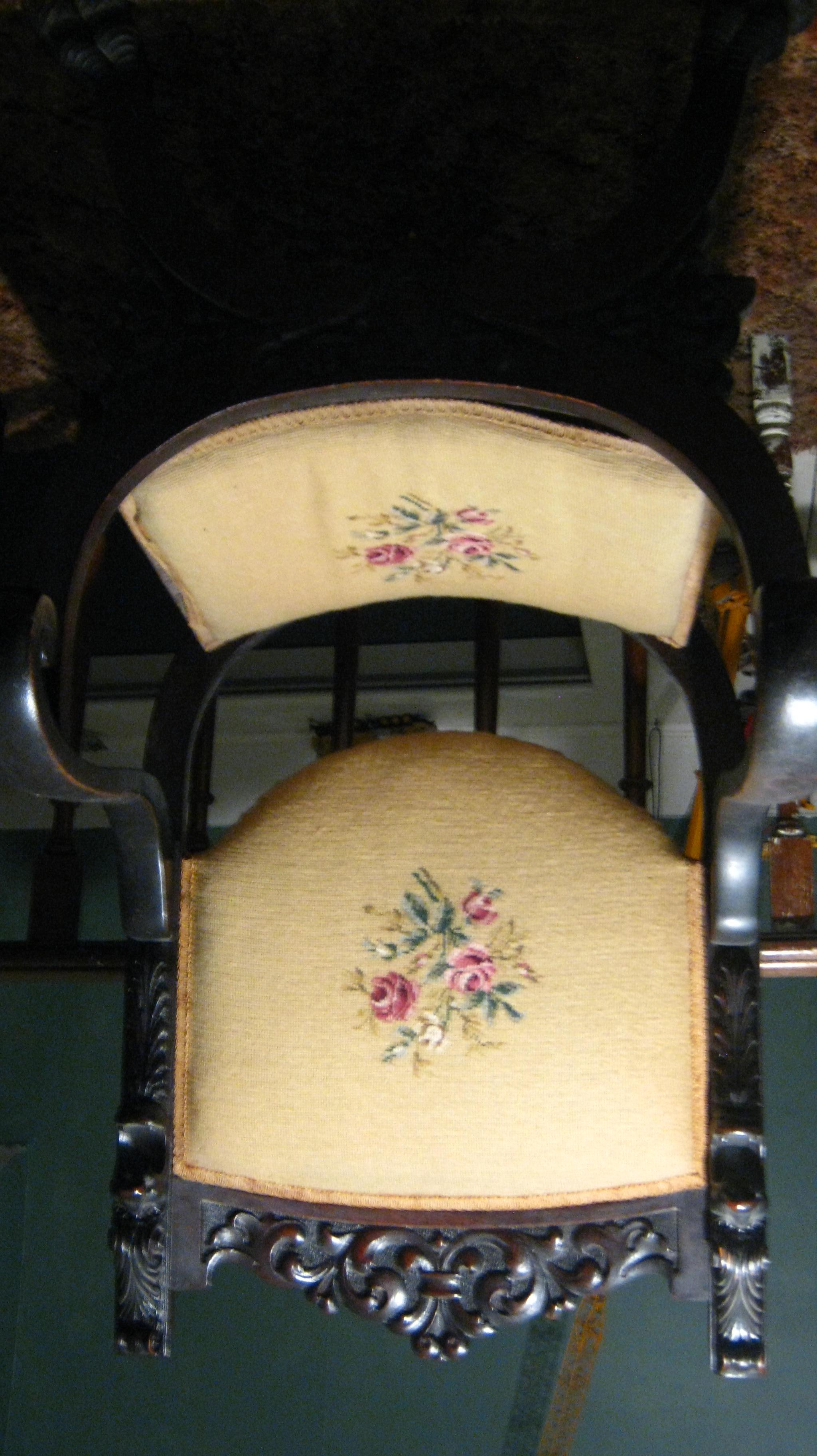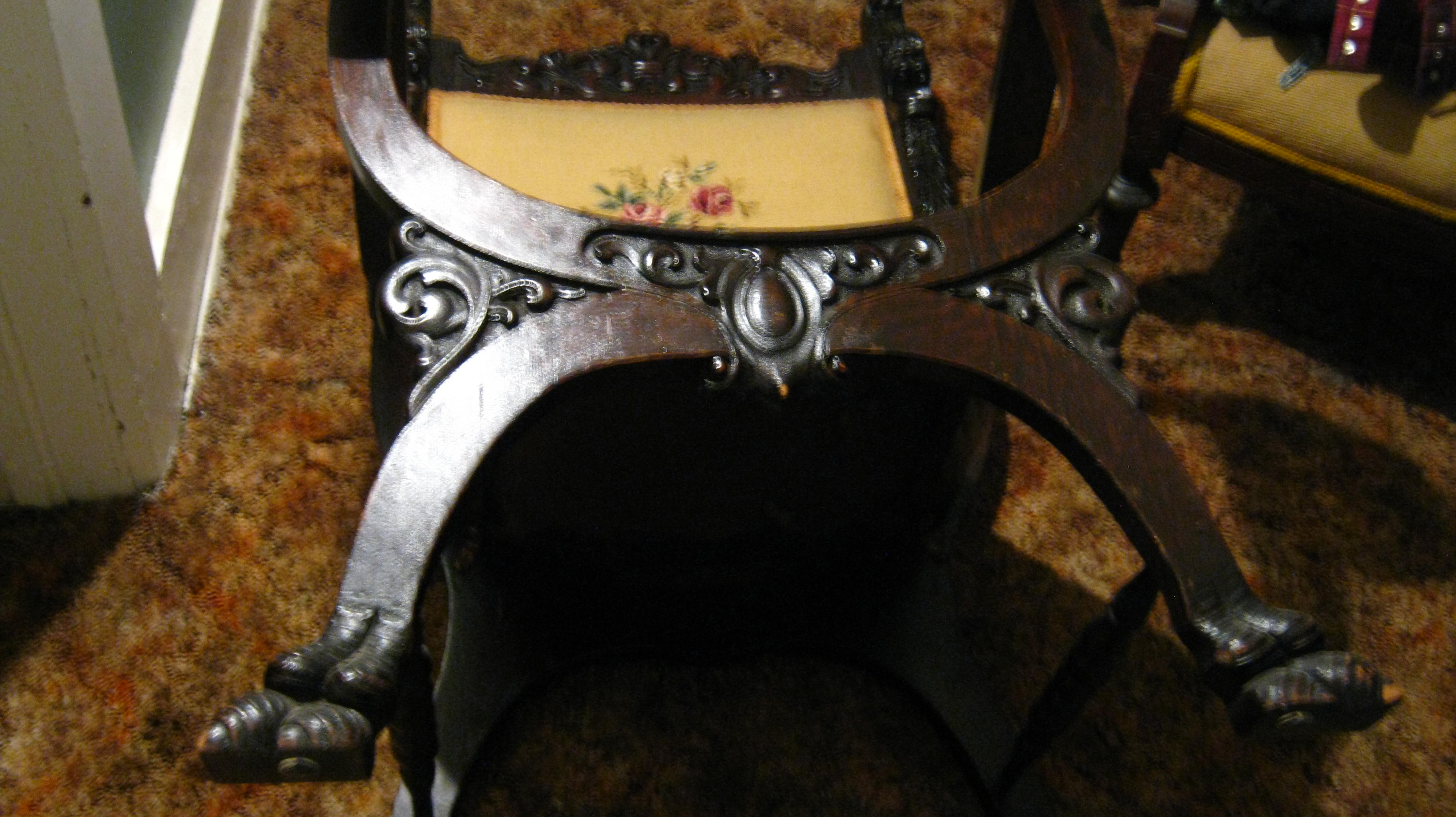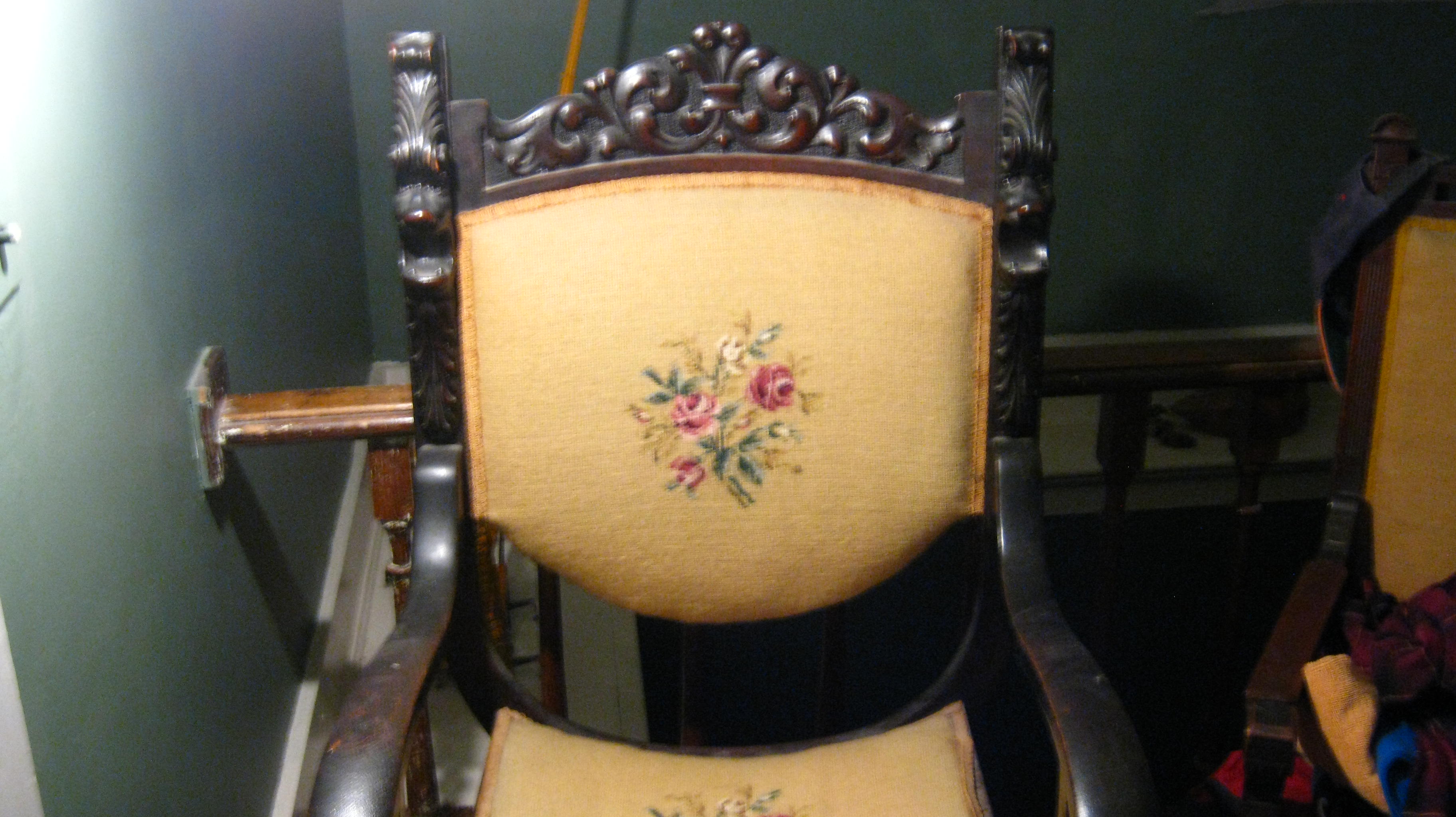 this was my grandmothers along with the next one I will post want to know a value and would be interested in selling if the price is right she did the needle point work I know her and her husband before they passed were very handy at doing these kind of projects the next chair I will post she used the same design and they look very good together I dont know much about these other than the one sticker on the bottom of the one with the lions