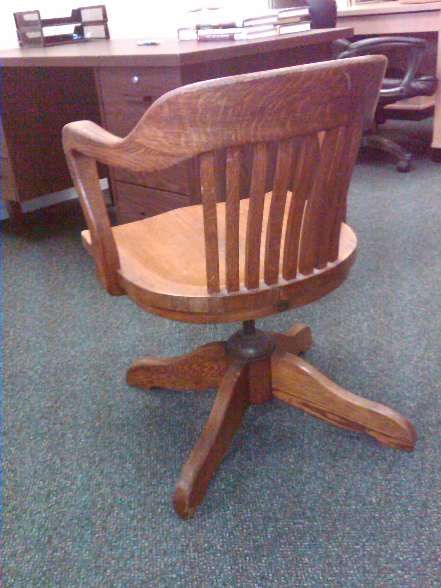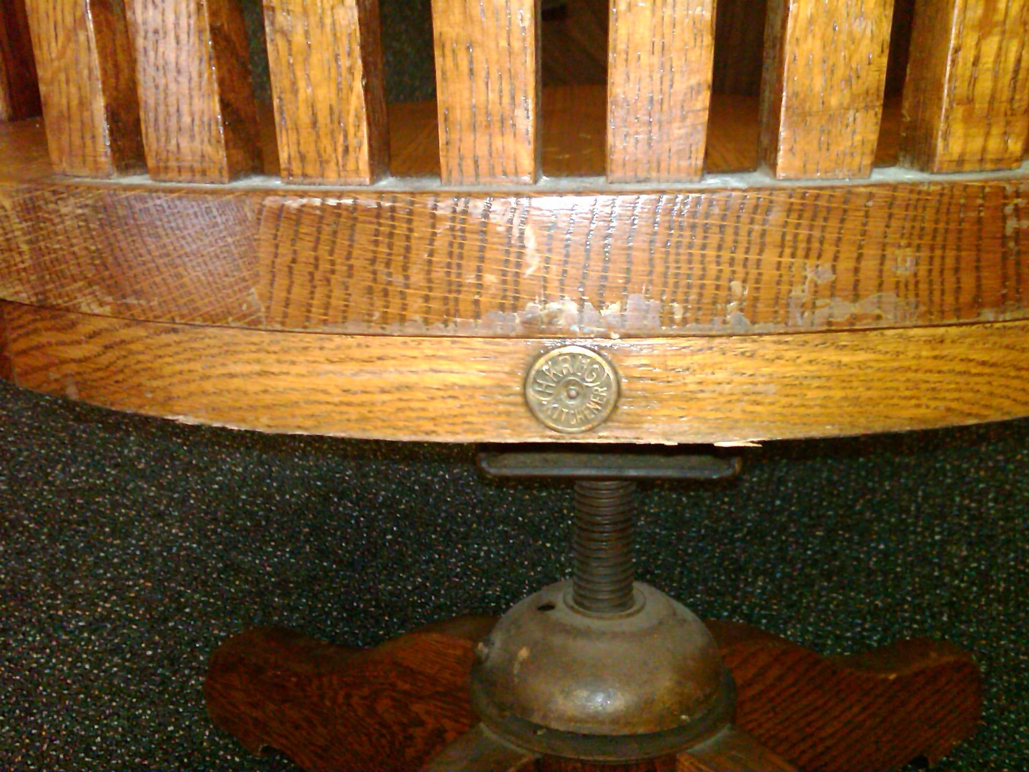 This is an antique chair. I am curious of its value and history. It's surprisingly comfortable. Made by H. Krug Kitchener. It says 1417 inscribed on the bottom front of the chair. It does not have the swivel wheels but does have holes in the bottom.