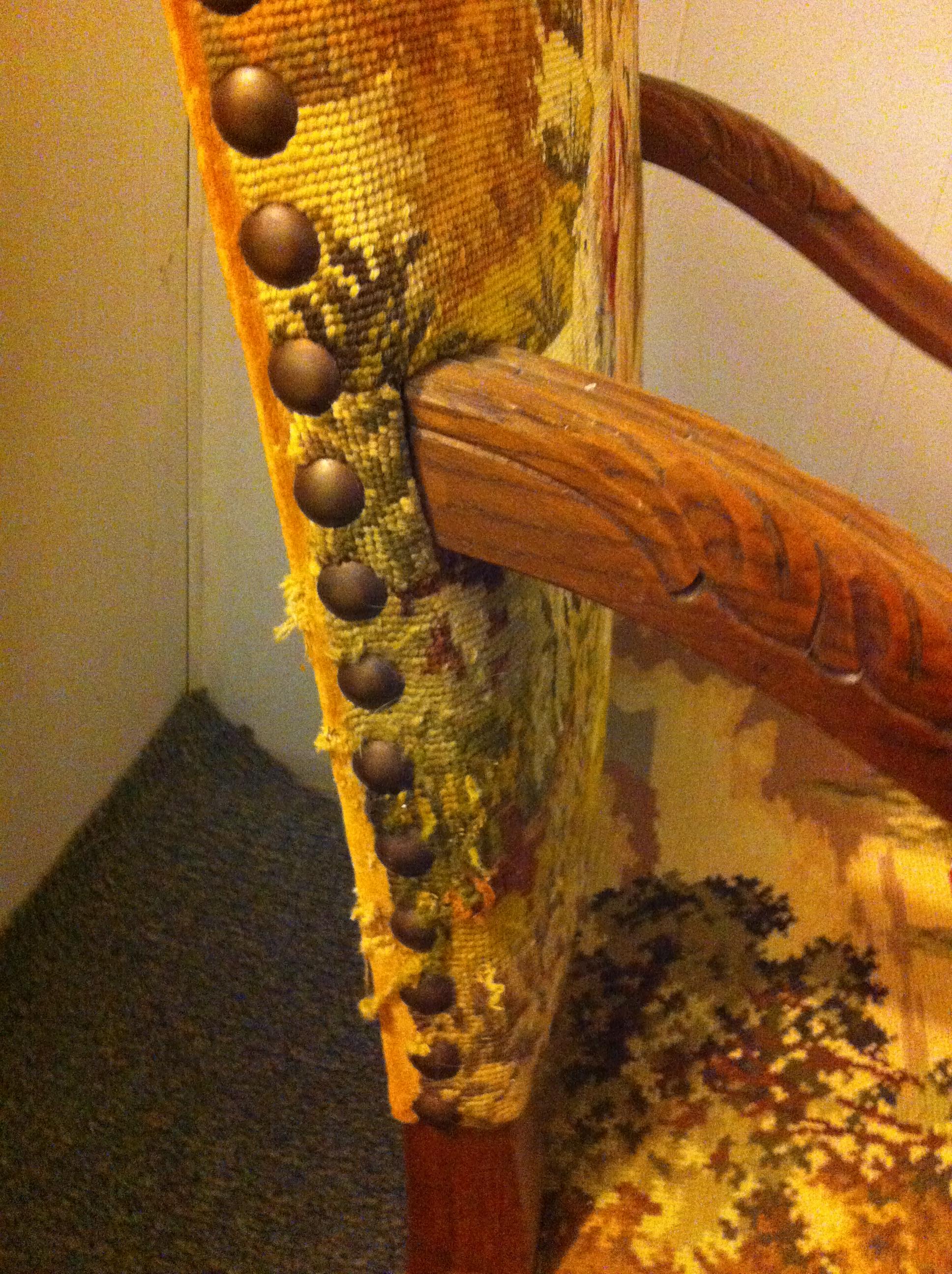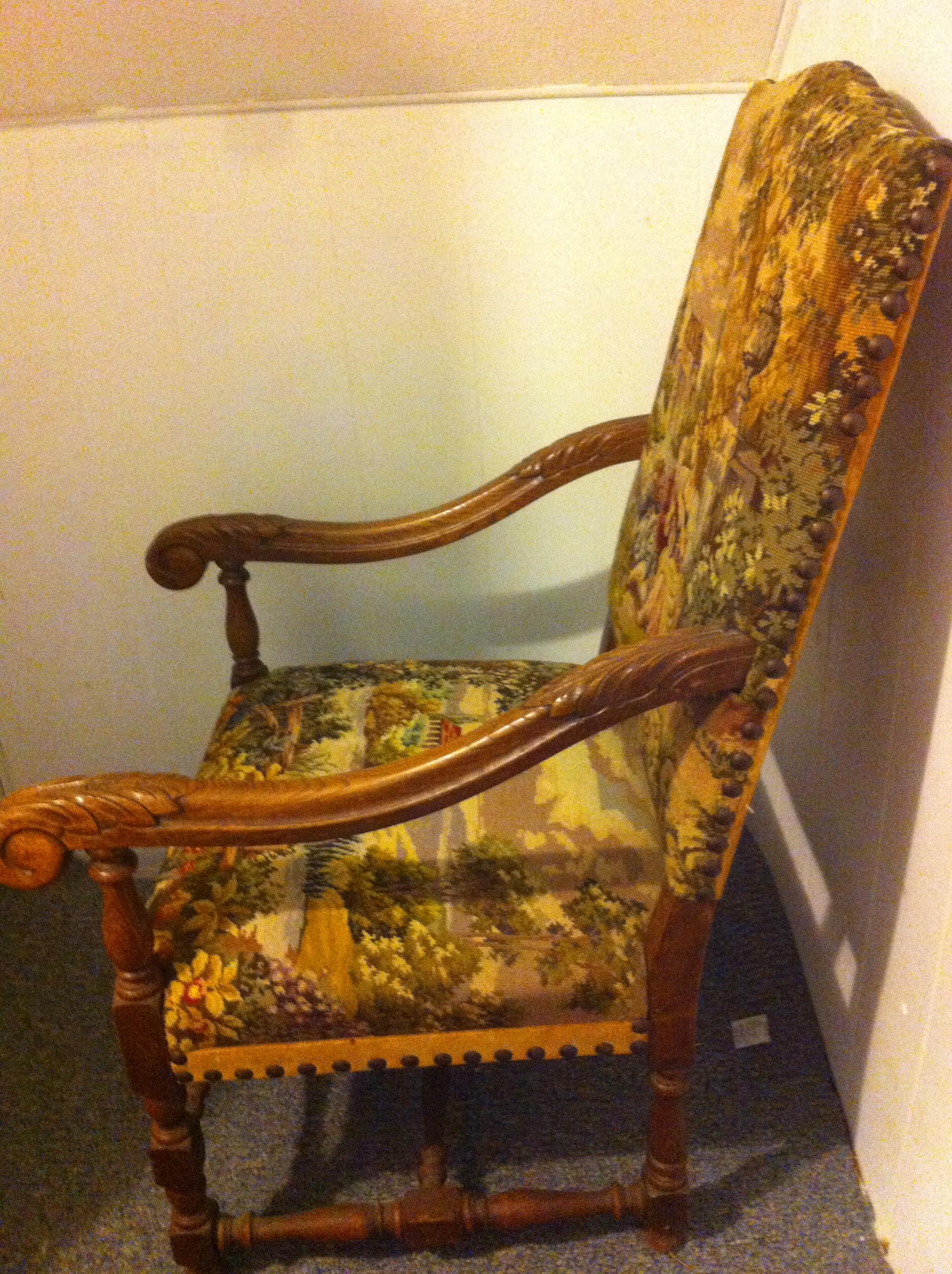 Hand stitched in wool antique chair from Denmark over 50-70 years old. In very good condition, minor stichting problem on right side, pictured. 49 inches high, 27 inches wide and 26 inches in depth.
