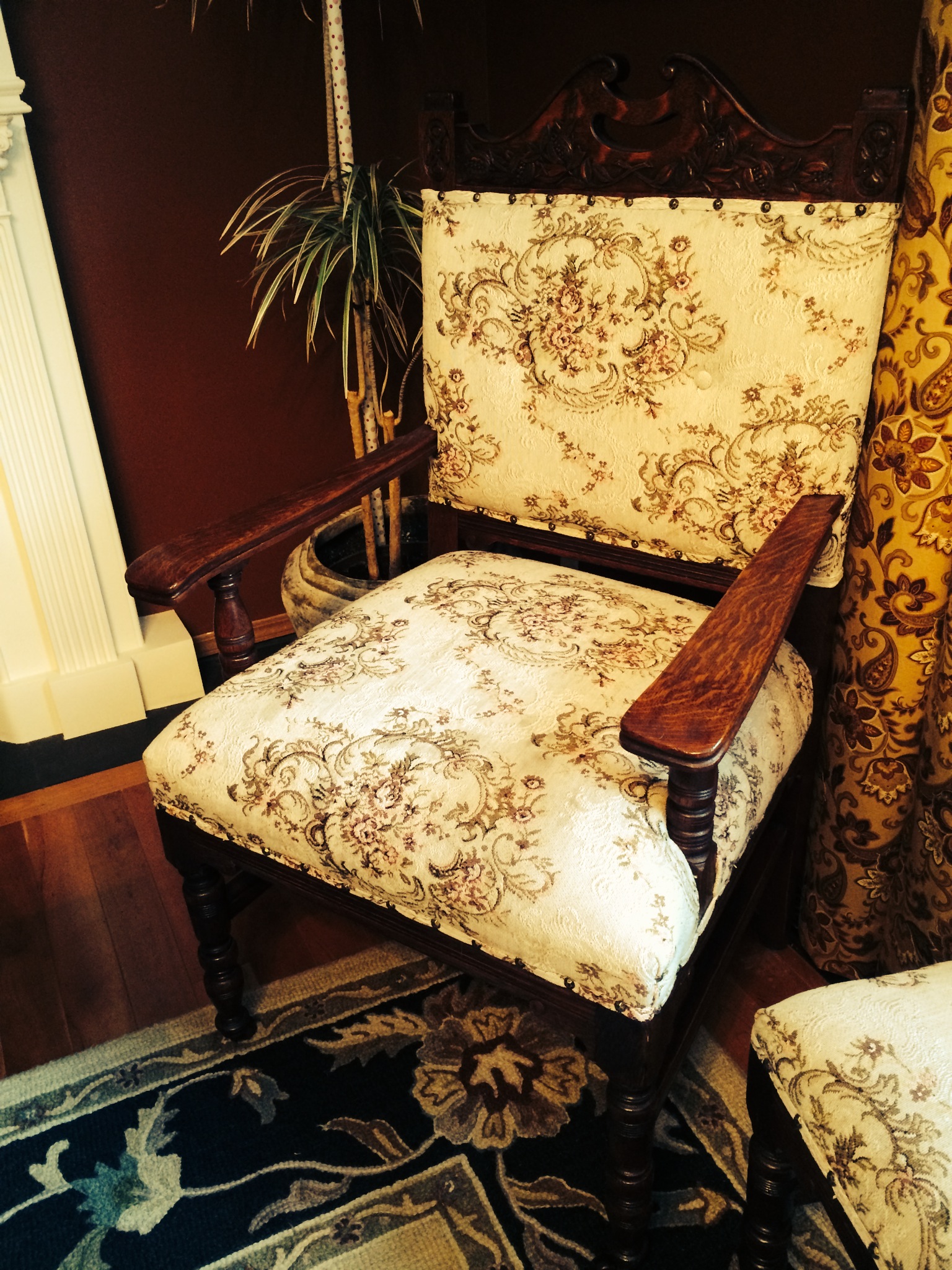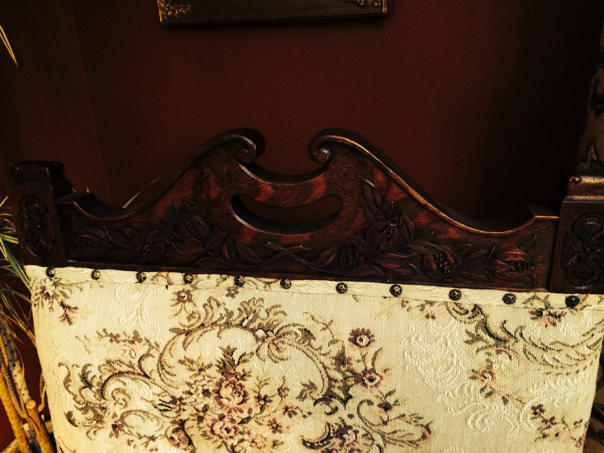 Bought these chairs in an Auction in Western Canada. Auction description was early Americiana early 1900's. Would love to know more about them and specifically what is carved in the tops of them - is it fruit or nuts or ???