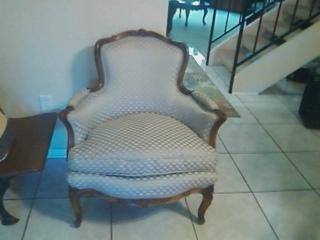 Beautiful chair. Cushion is loose and filled with down. The upholstery feels like silk, and it has been re-upholstered at least 3 times. Carved flowers on the back and the legs.