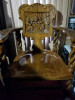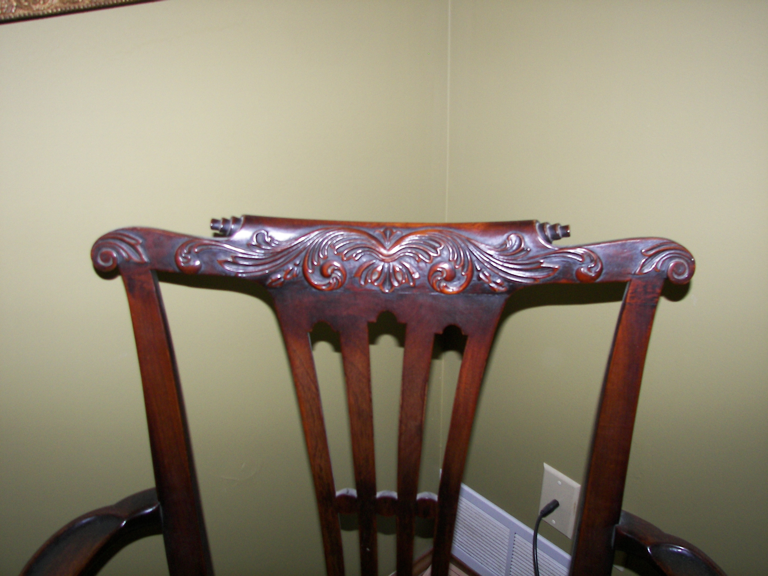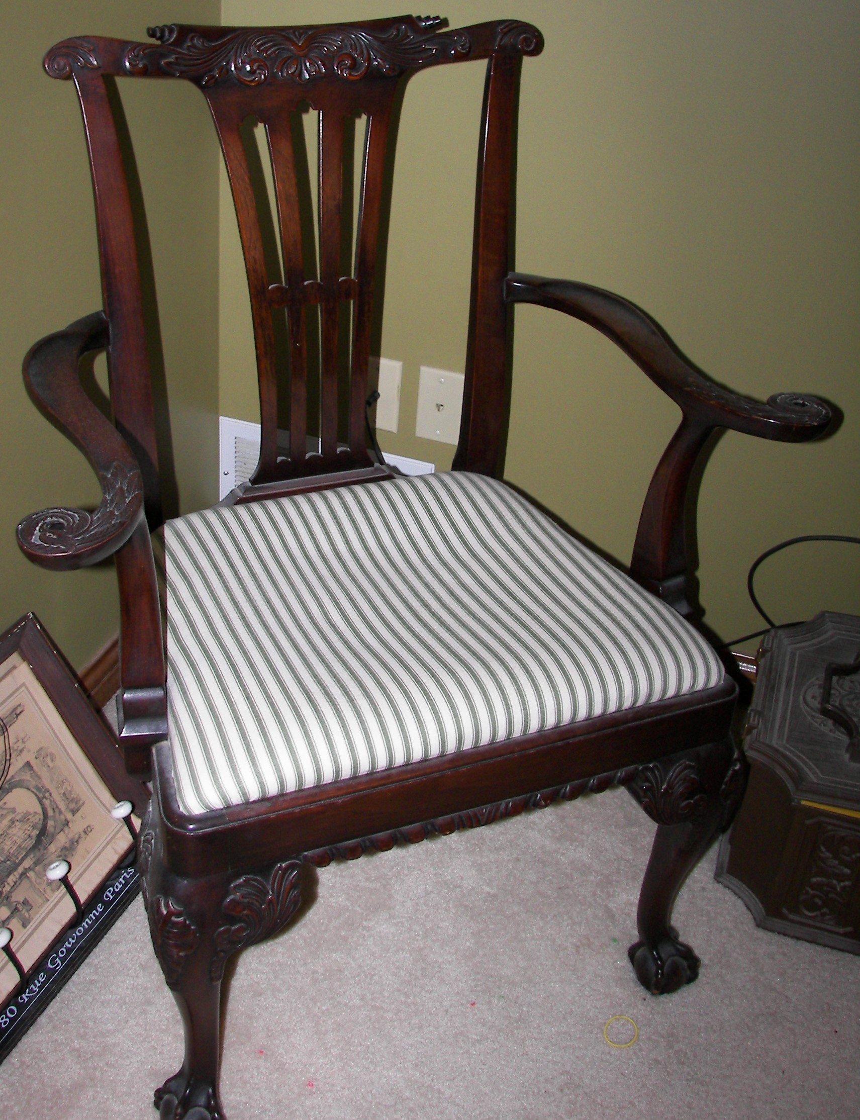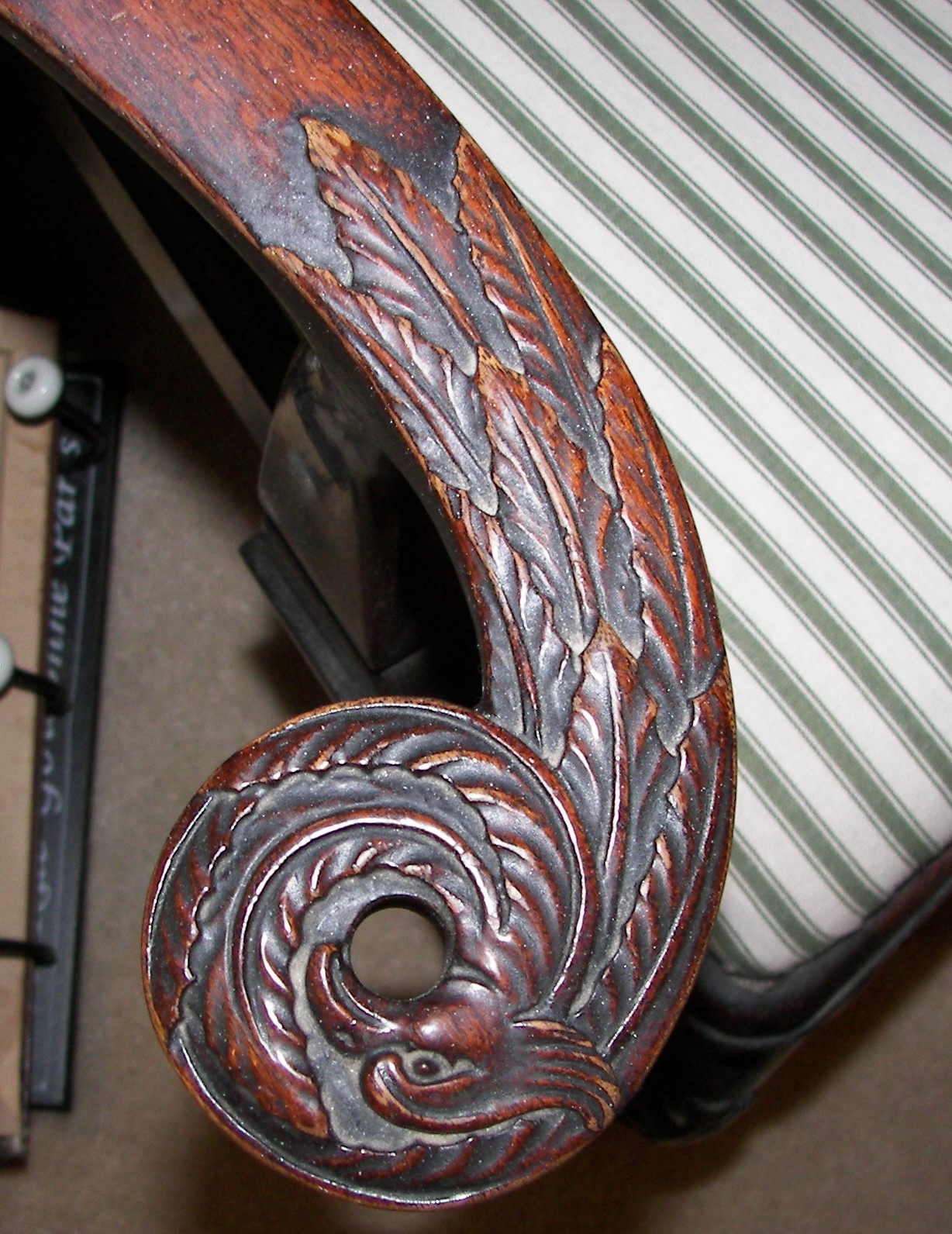 We have a chair that has carvings on the arms, back, and legs. The cushion seems fairly new.