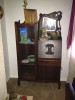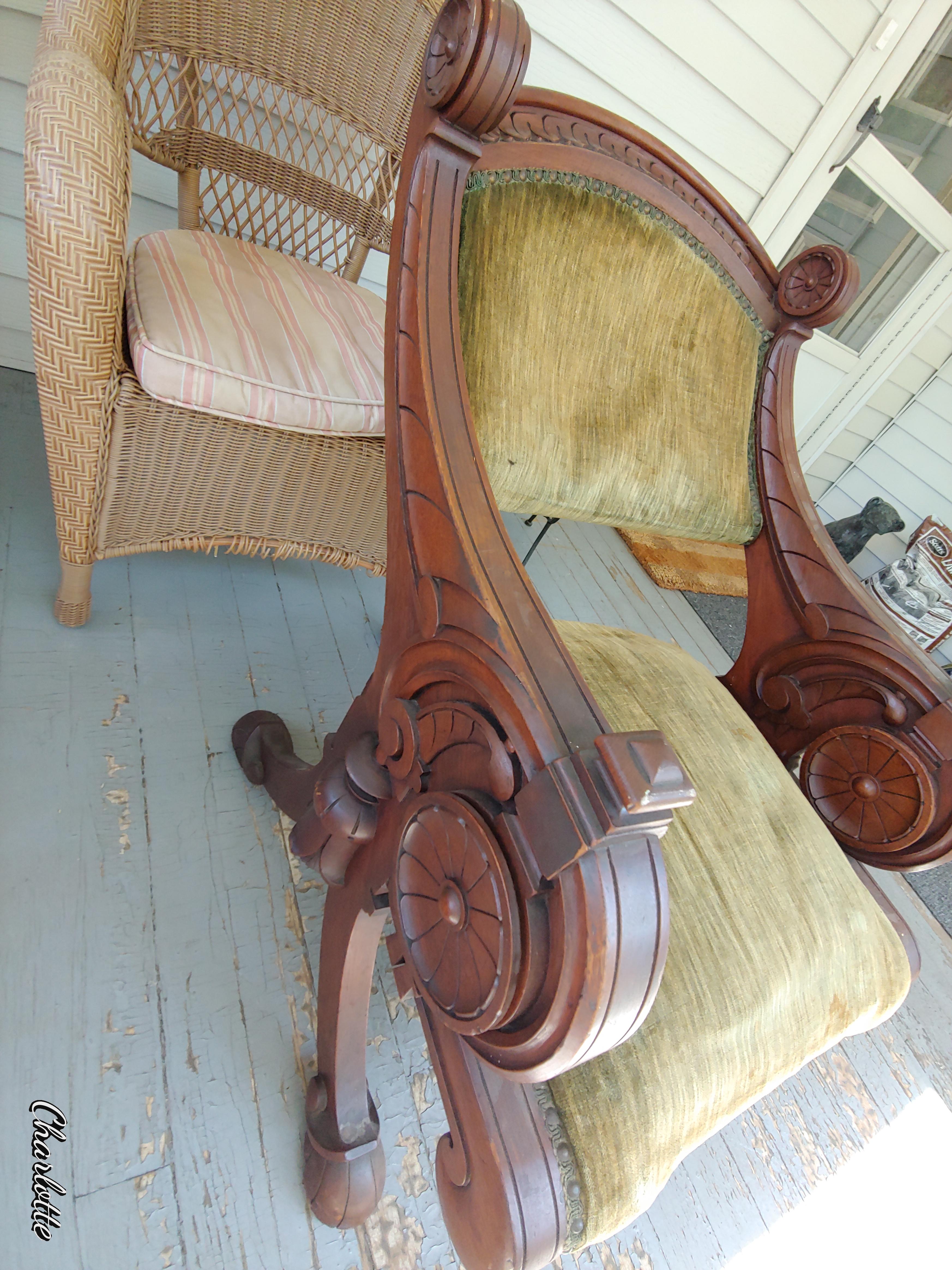 Antique stationary reclined chair with heavy dark wood arms. Circular carving on sides. Casters. Guessing 1800s?