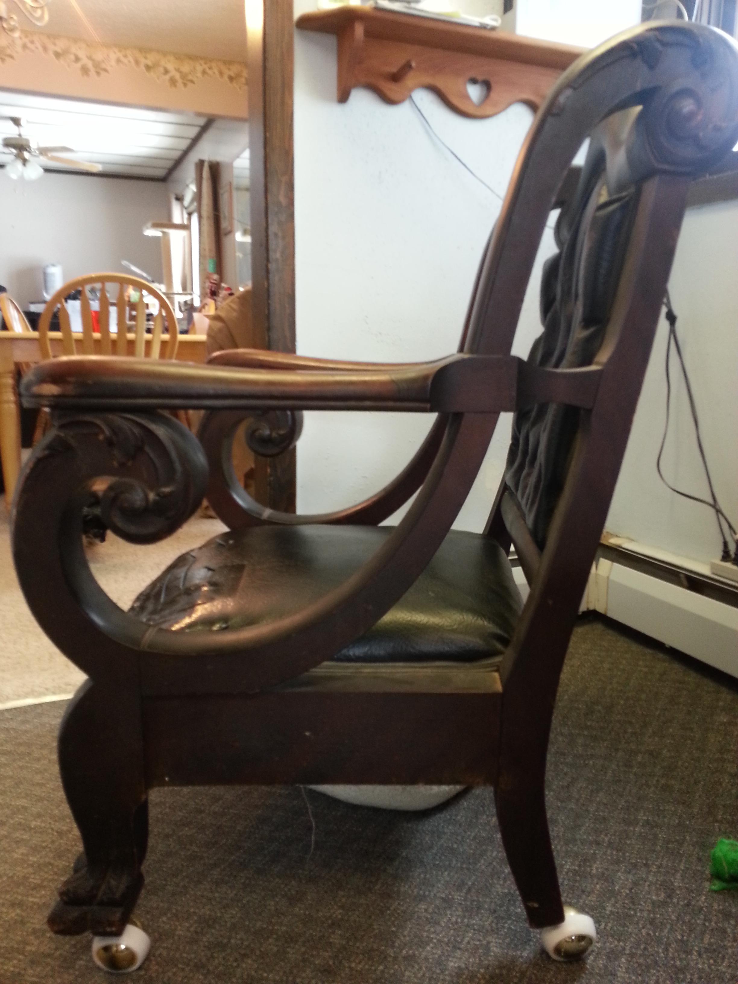 Beautiful hardwood (mahogany?) chair that I acquired 10-12 years ago. Purchased from a private owner who said he had grown up in North Carolina and that the chair had been in his household for as long as he could remember. Lots of dings and nicks, but nothing catastrophic. Amateur modern reupholstery job that is now torn. There are no visible maker marks, although I have not removed most of the upholstery. Decorative scroll and leaf work appears to possibly be gesso. The chair is too awkward to weigh on a home scale, but it is difficult for me to lift--very heavy! I can see that one of the joints holding the front apron to the leg is a dowel joint. The other joints are very tight and the whole construction is rock solid. Casters on the feet are a modern addition. I am trying to decide whether to finally restore or sell this piece, but I would like to first know exactly what it is.