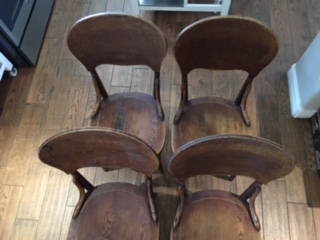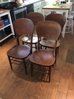 I received this set of four chairs as a gift from family and I am unsure of their specific history. I love their classic design and style. These chairs are in good condition with the exception of one chair that has a split seat; it appears to be restorable. The remaining chairs are free of damage outside of just being "old". All the original hardware is still in the chairs and they do not wobble.