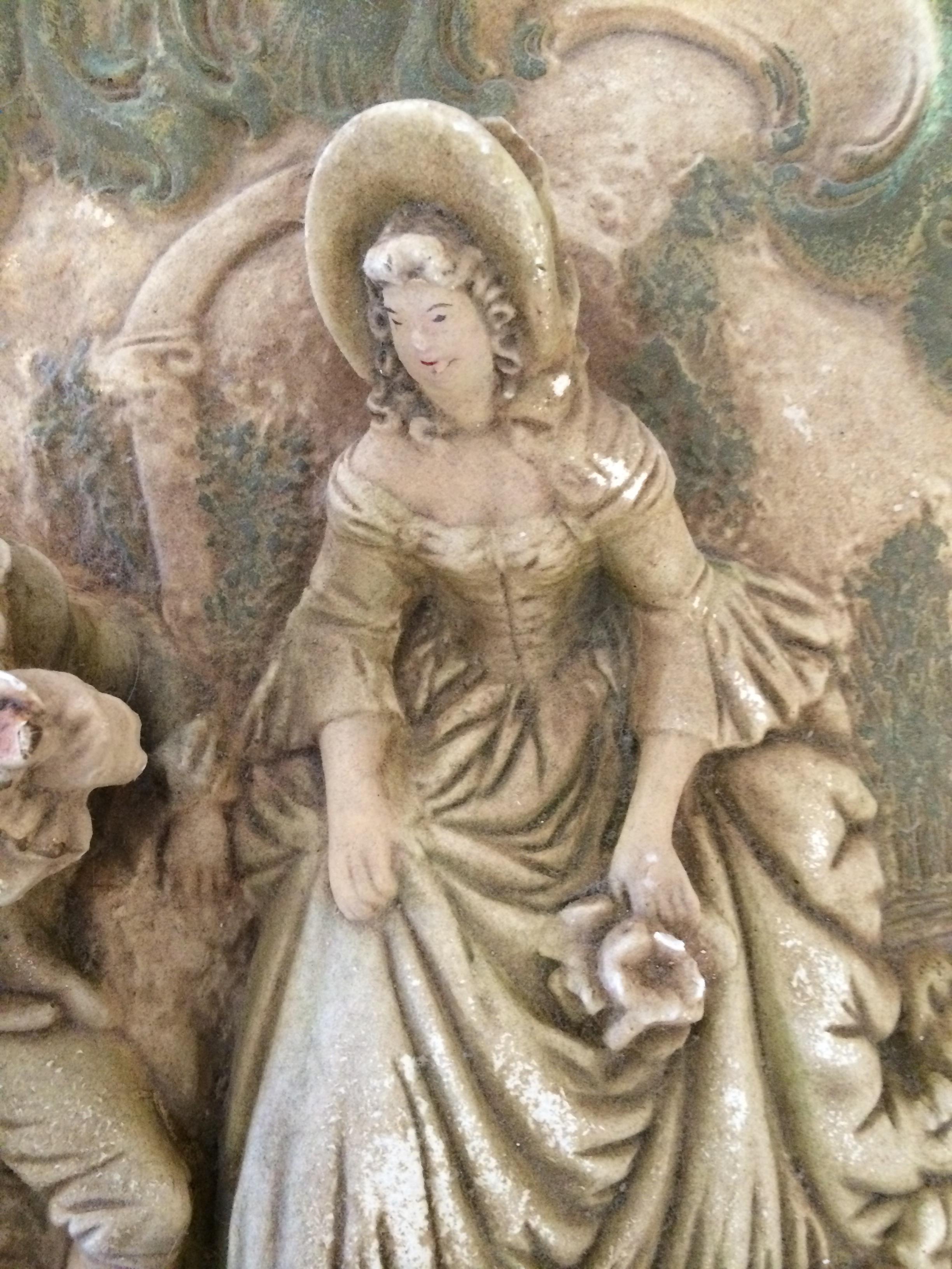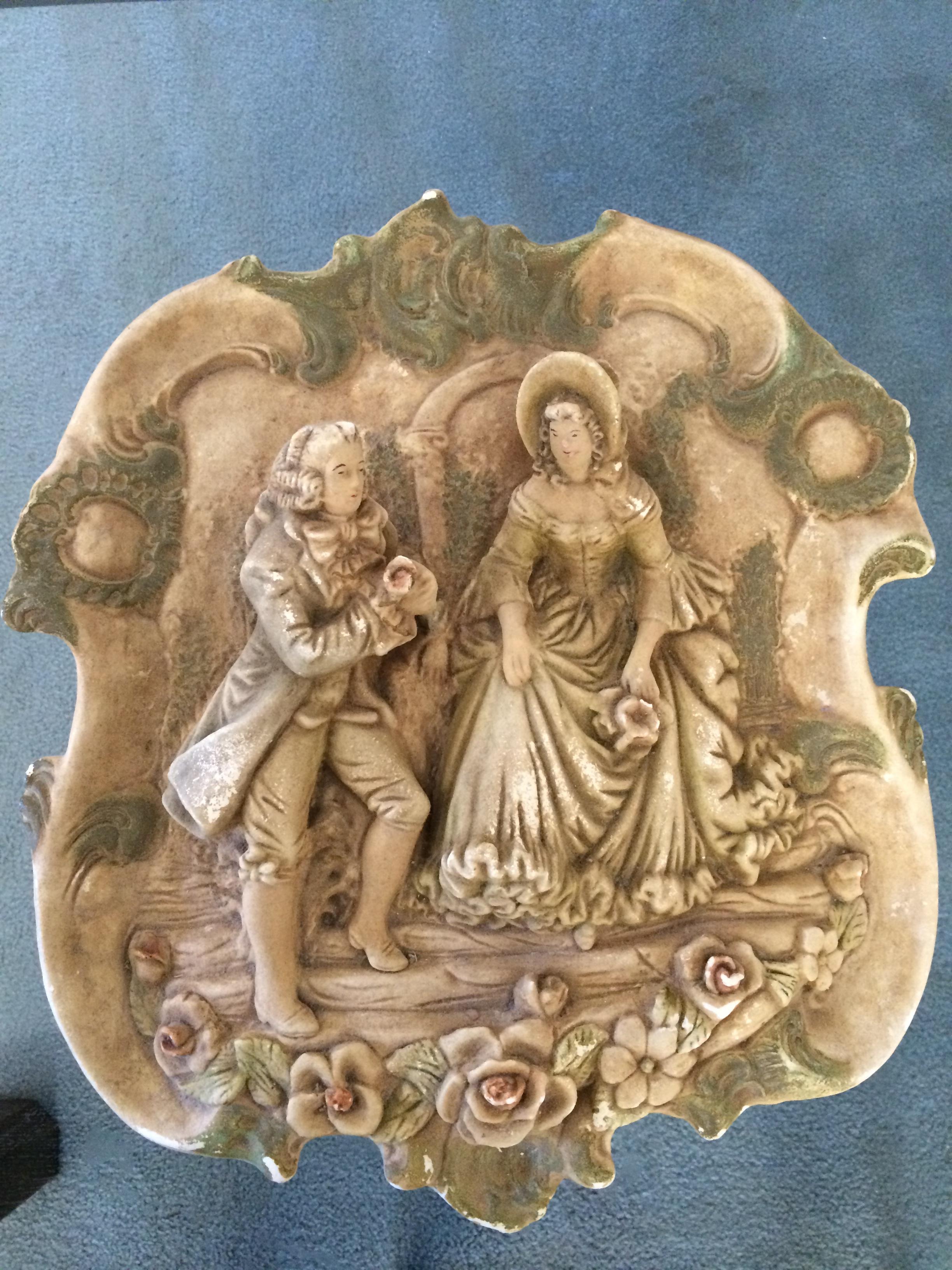 This seems to be a chalk or plaster type material. It has been in my family for a very long time, but really don't know much about it. There are no markings on the back.