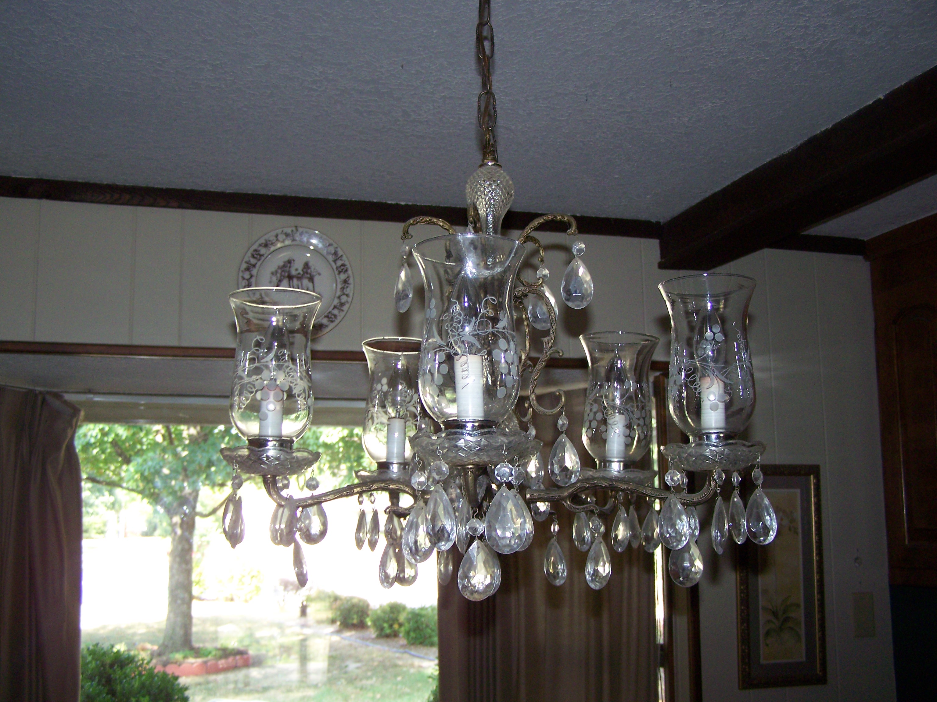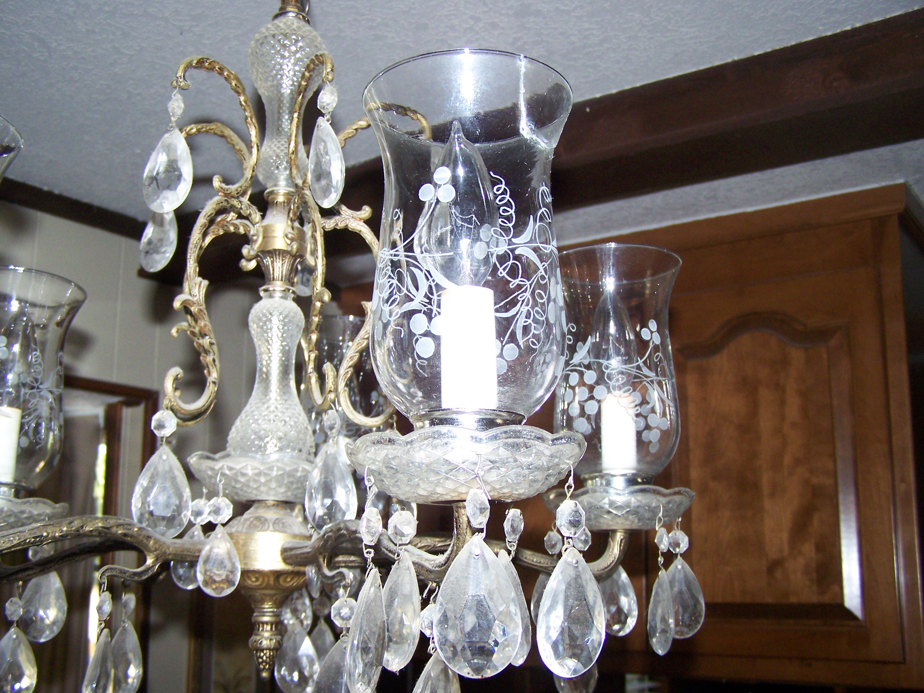 Antique Chandalier....bronze metal, 5 etched globes, about 50 hanging teardrops