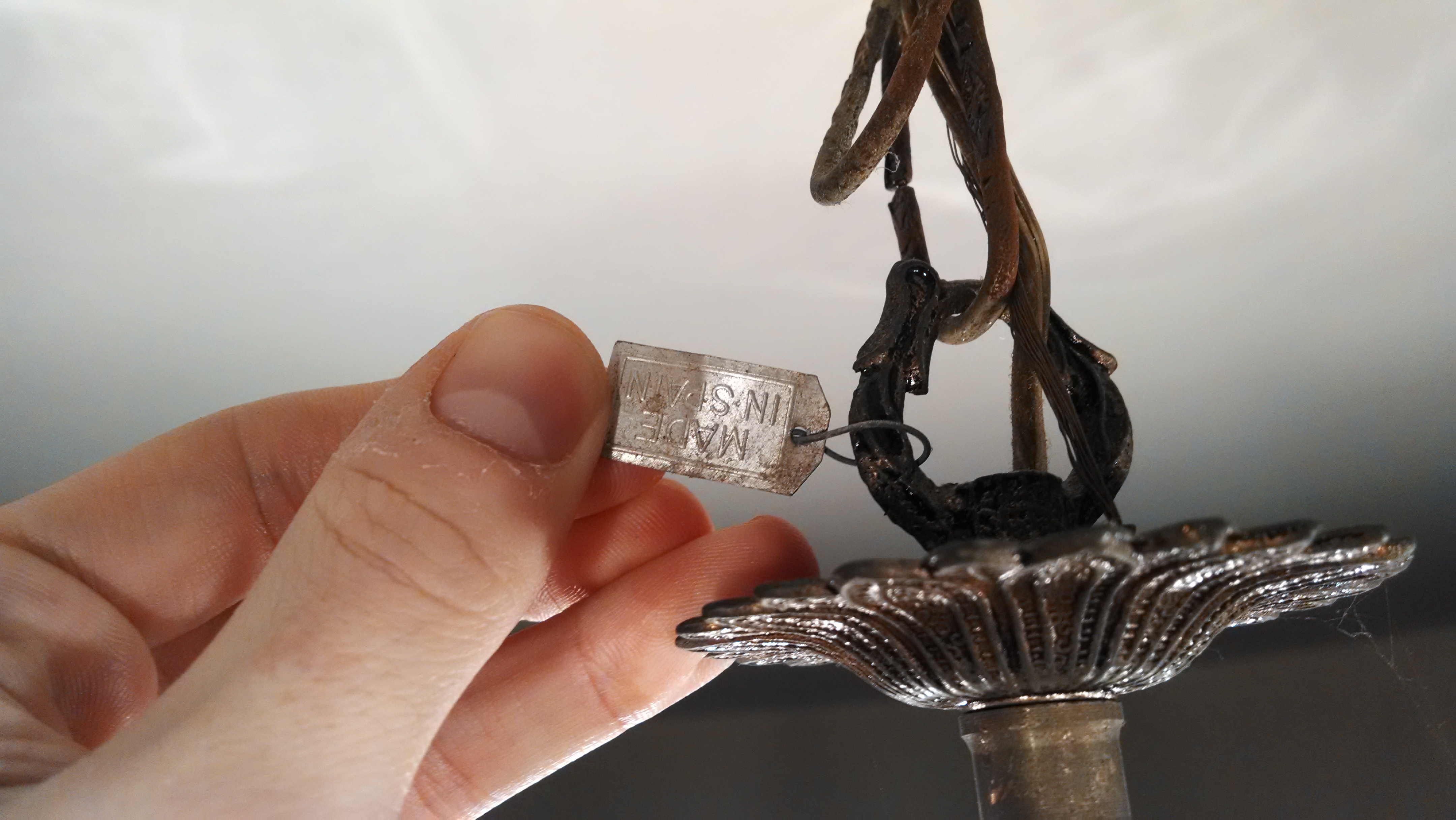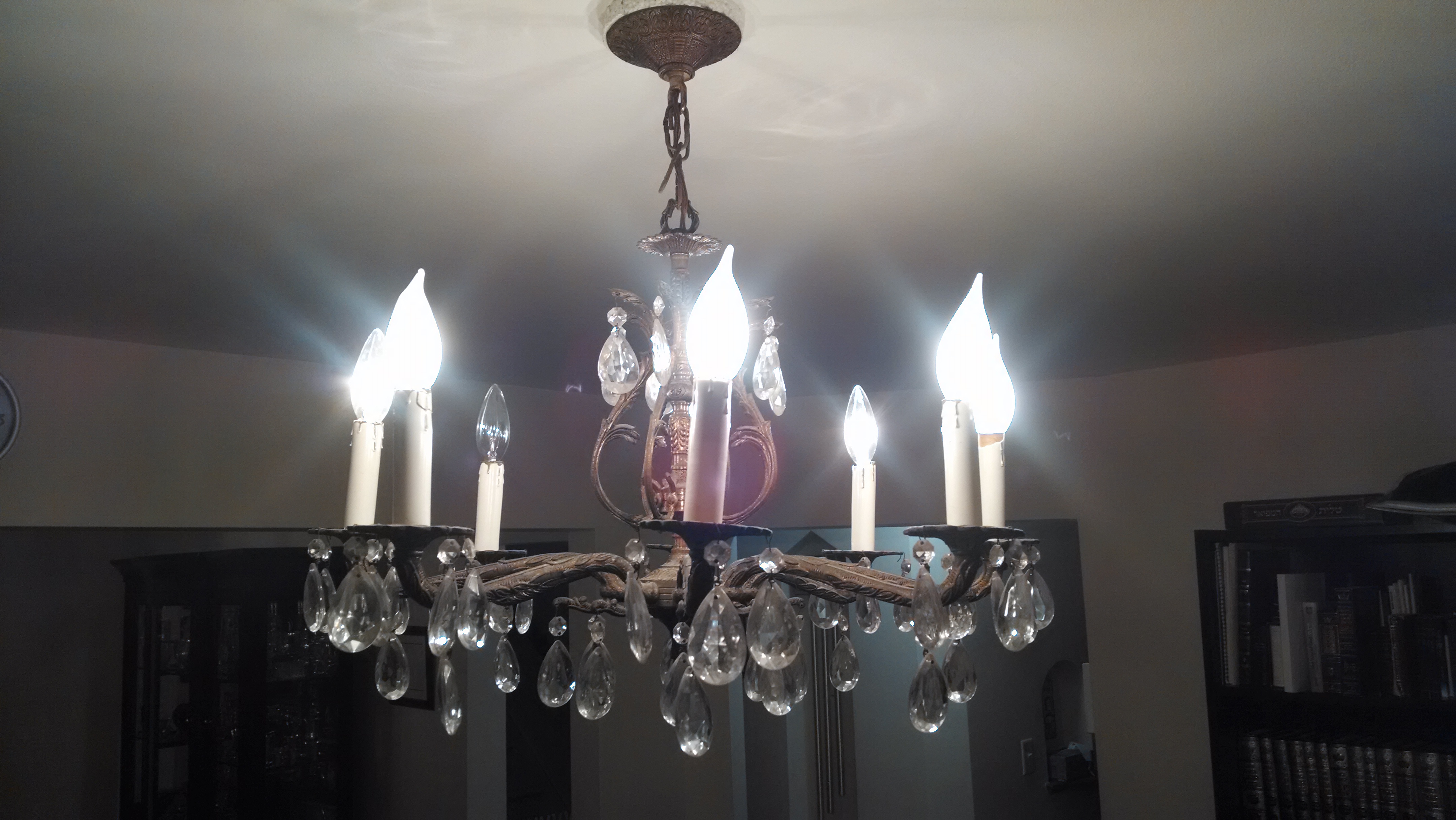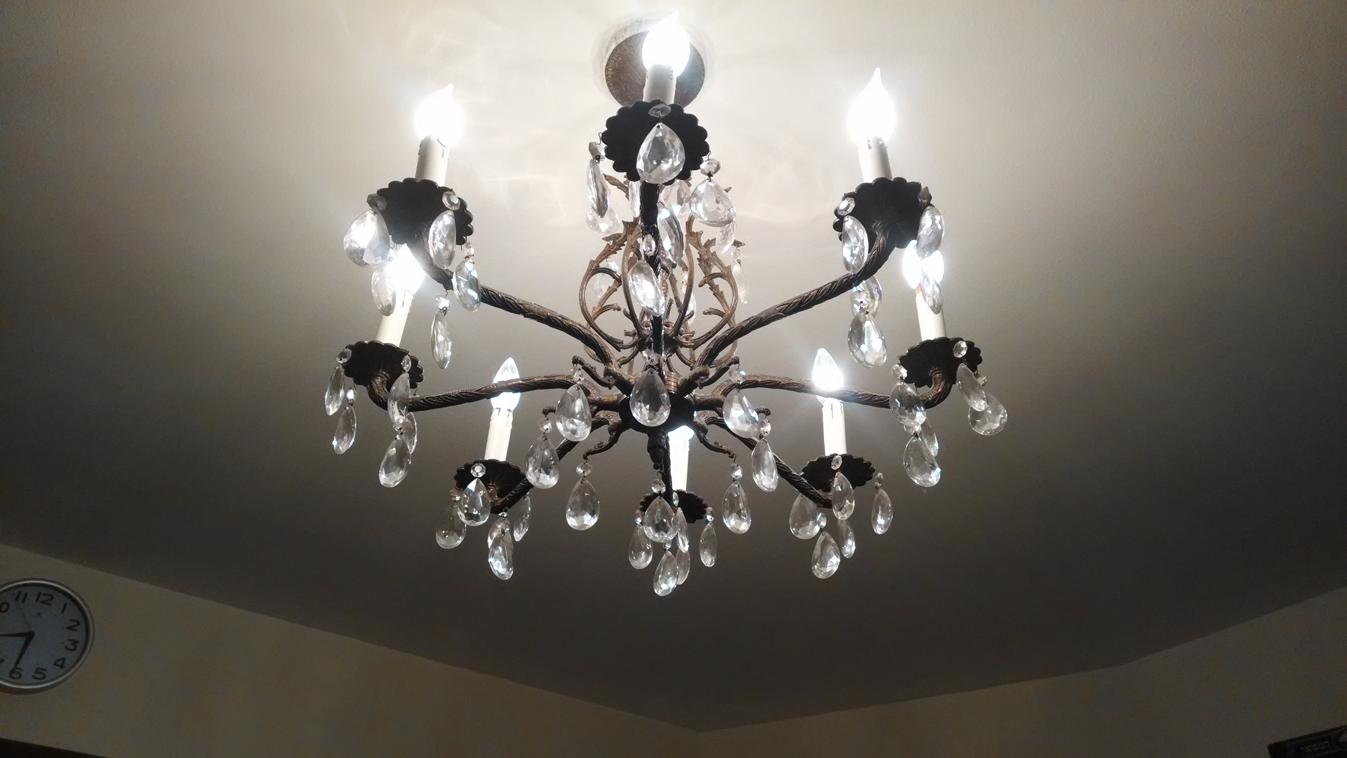 Made in Spain, nice looking antique chandelier with crystals and , candlesticks.