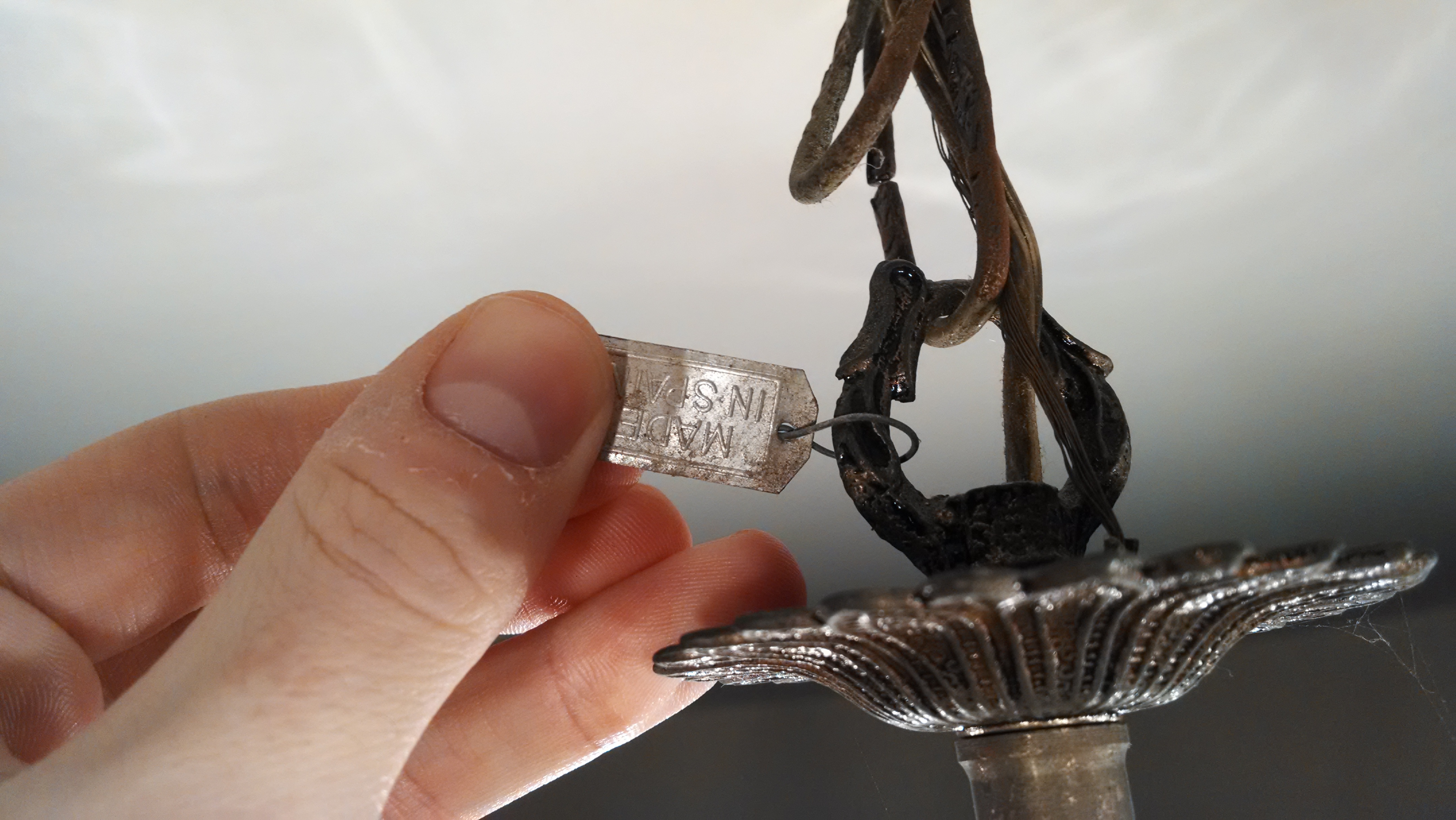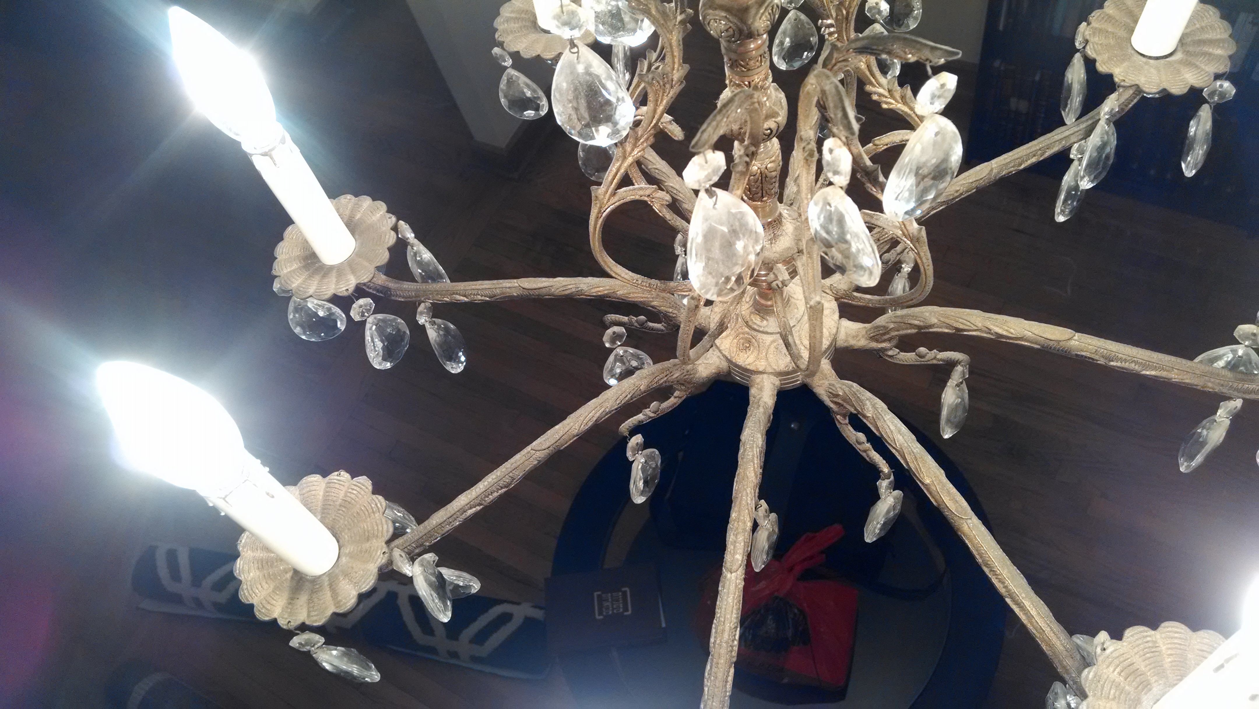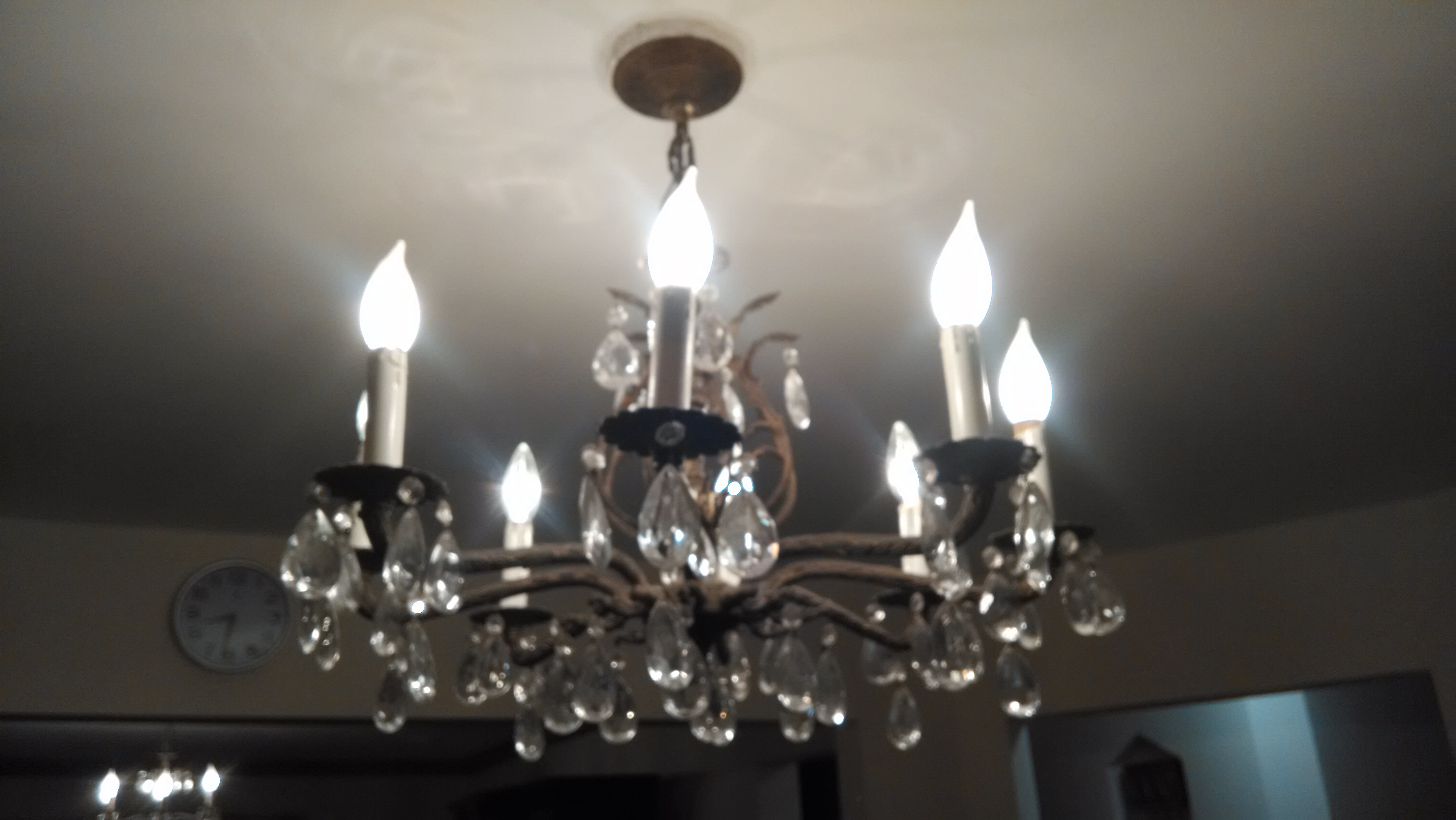 Made in Spain, nice looking antique chandelier with crystals and , candlesticks.