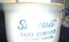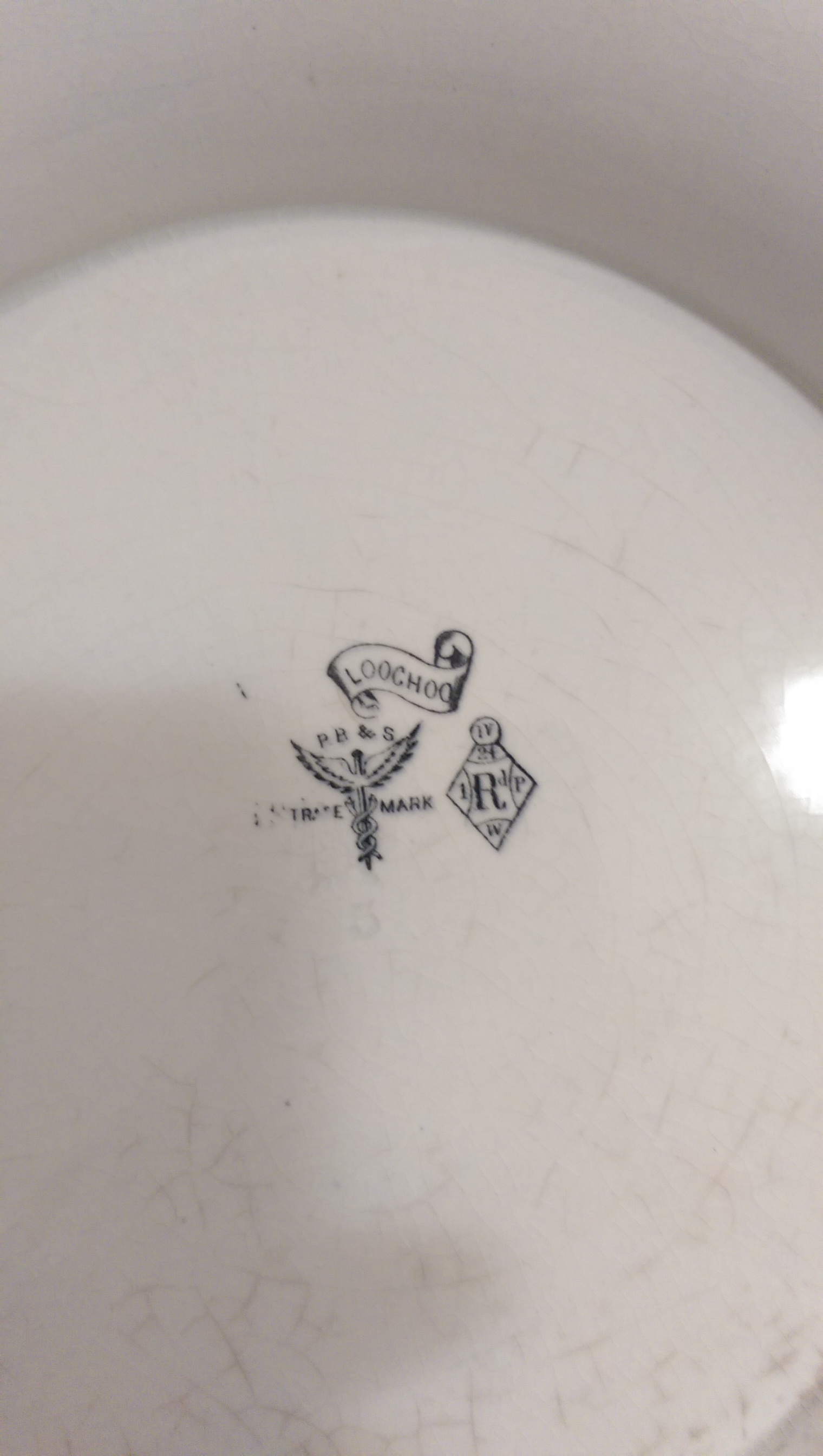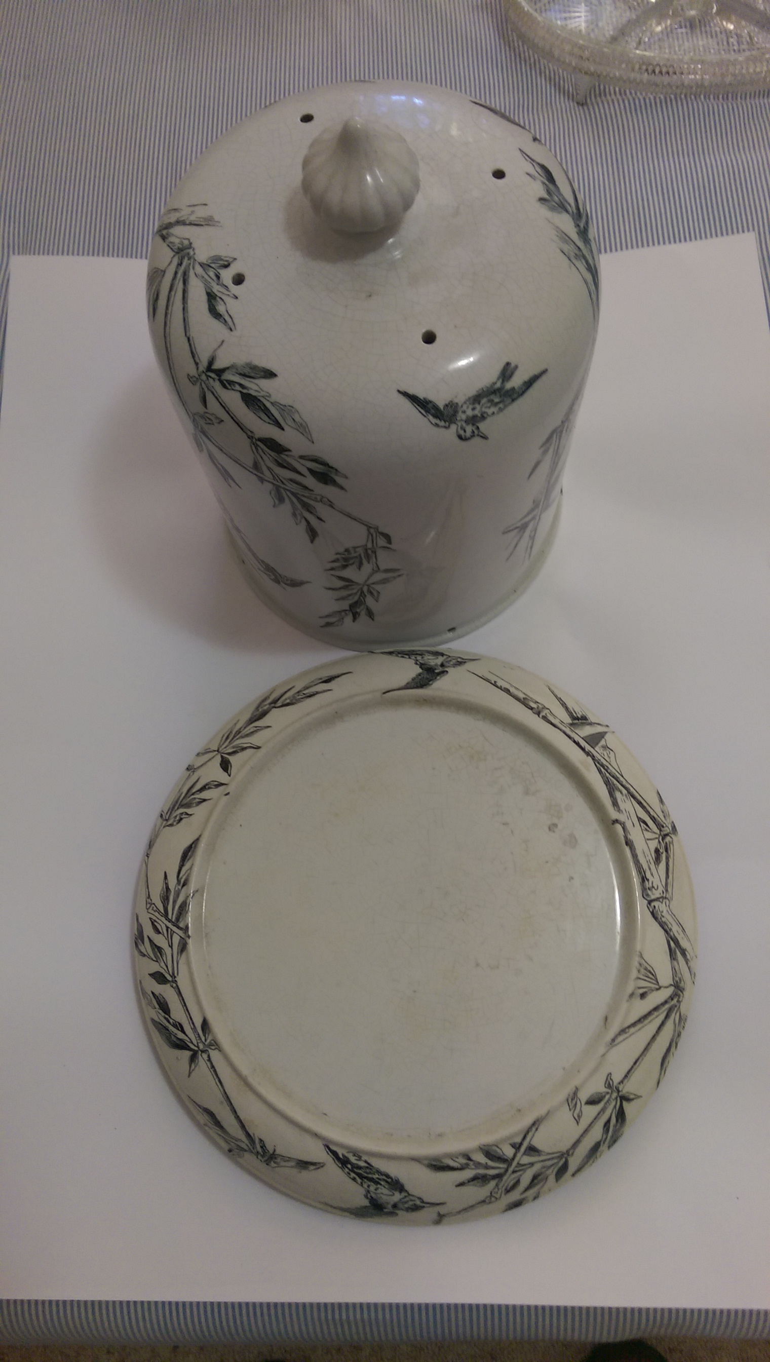 This item looks like a cheese container. The top is 28cm high with the base being 30cm across. On the base is the trade mark with Loochoo in a flag. Under that is what looks like bird wings pierced by a nail with snakes wrapped around it, next to that is a diamond shape with 1V at the top, with 24 under it, then 1 Rj p, and under that a W. The colour is white. The art work is black and gray with bamboo,birds,islands with palms and siling boats. Concidering the age it is in good condition.