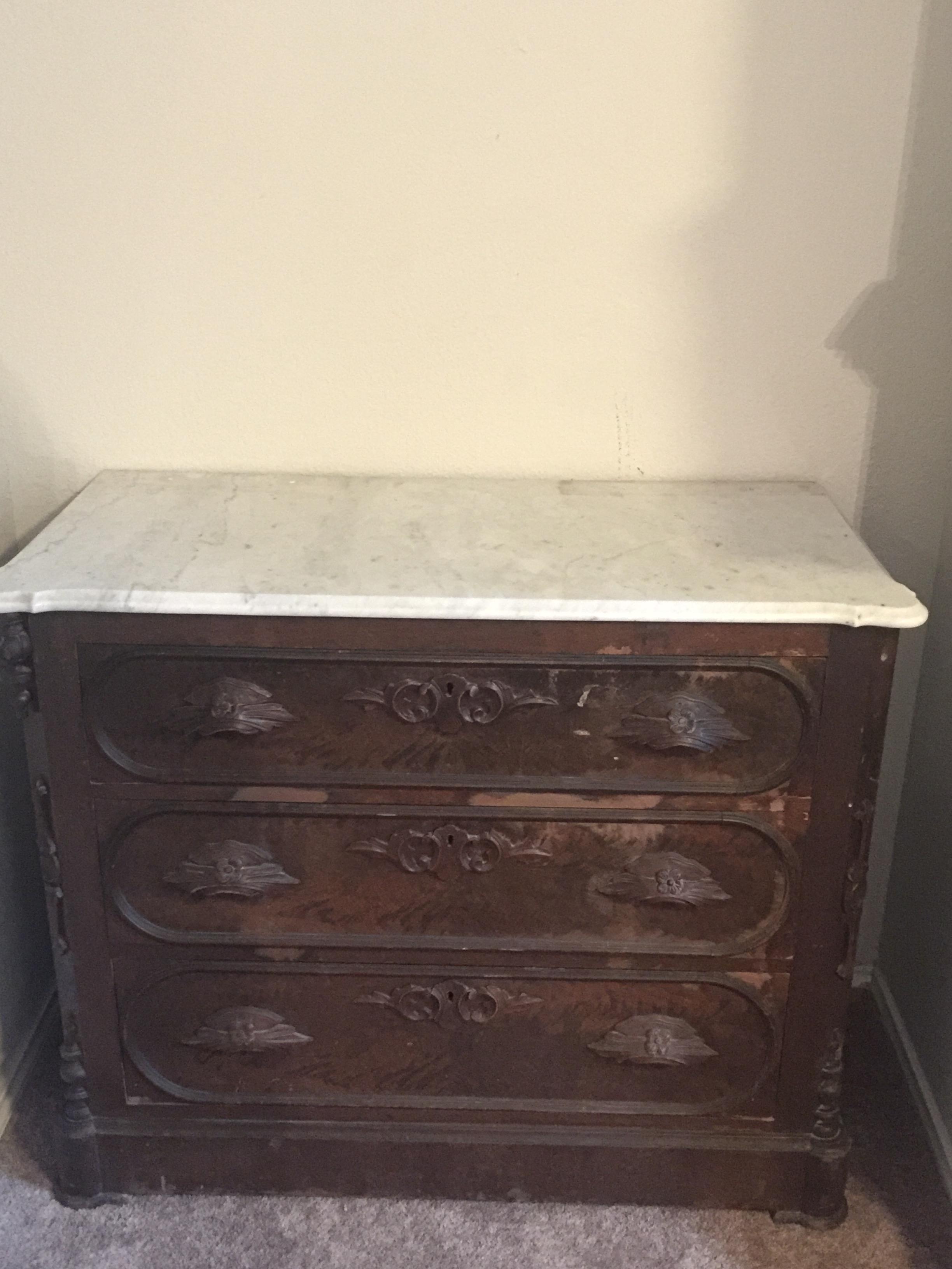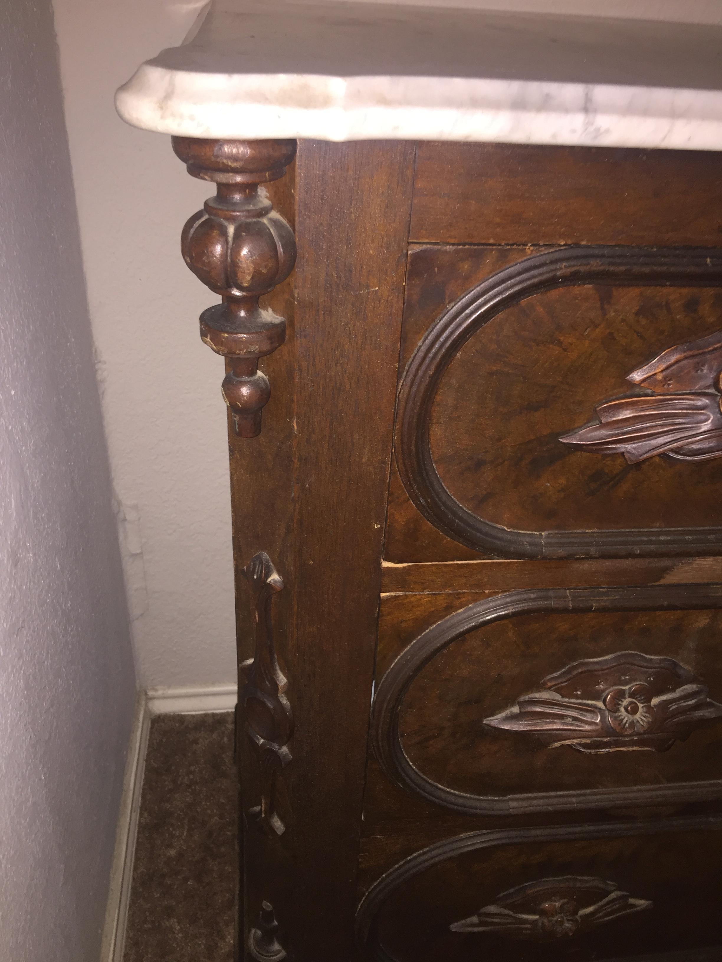 Trying to find out what the value on this piece is and what the description of it would be. Also, what year it was likely manufactured. I don't have the mirror that goes with it either. Also, a small piece fo the detailed wood work on the upper left corner of the piece is missing. Which I'm sure will decrease its value.