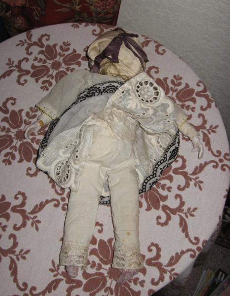 The most interesting part of this doll is her clothing - beautiful French lacey clothing. Lots of detail in the chunky/wide lace throughout her outfit. Her shoes are just painted on. There is some slight staining on parts of her clothing.