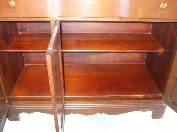 I believe it is cherry wood, it's a very rich color. It is in very good condition. It has built in silverware drawers. I can't find any markings on it. Just wondering if anyone knows about what era and the value of this. I appreciate any and all help!!