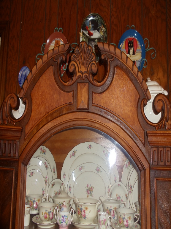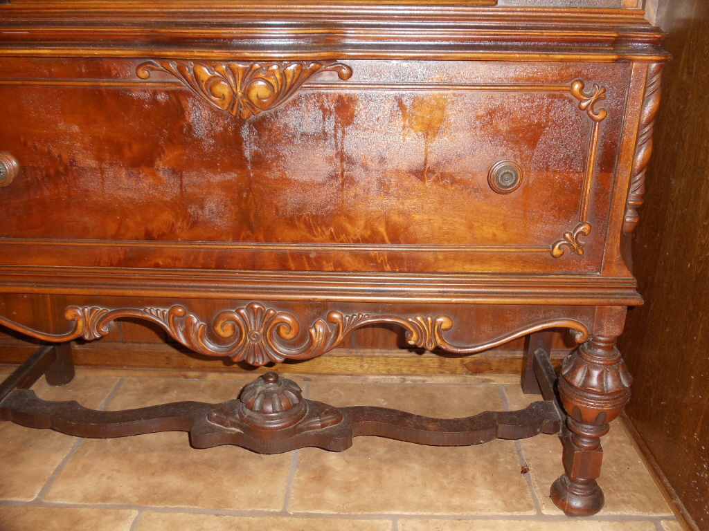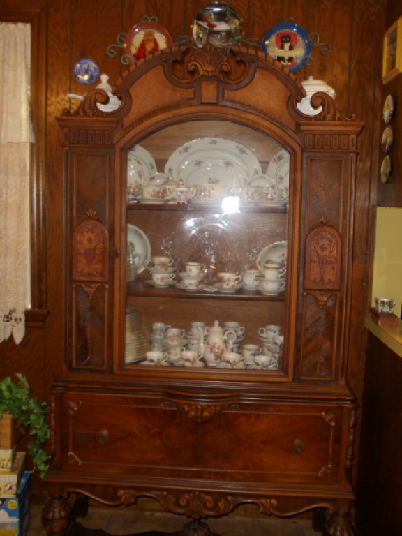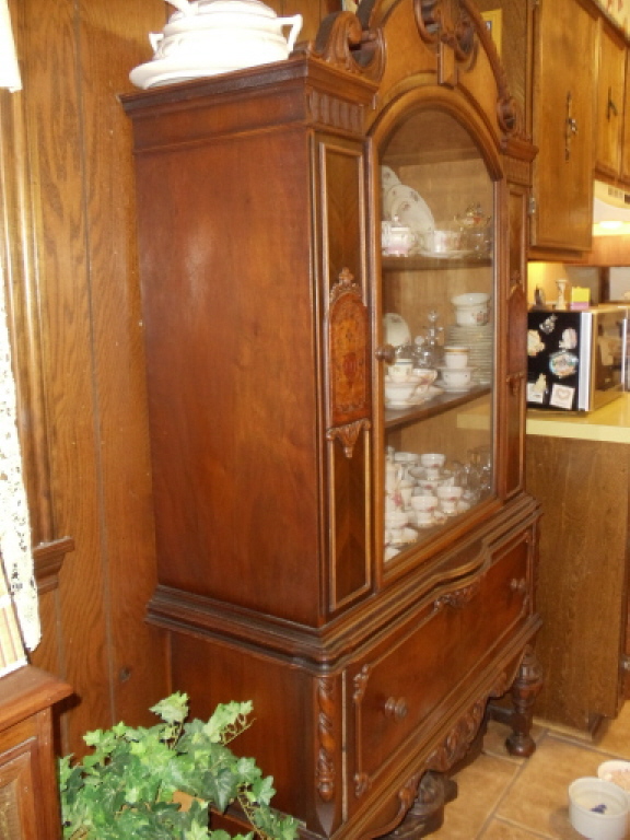 This is a china cabinet that I bought at an antique auction in Ponchatoula, LA more than 15 years ago. It has one glass door and one very large drawer (very deep). It has plate grooves on shelves to stand platters, etc. on. It appears to be made out of several different types of wood. I think it may be English but don't really know a whole lot about it. It is very very heavy. There were other pieces to the set, table and chairs & buffet. I was only lucky enough to get this piece. Love it!