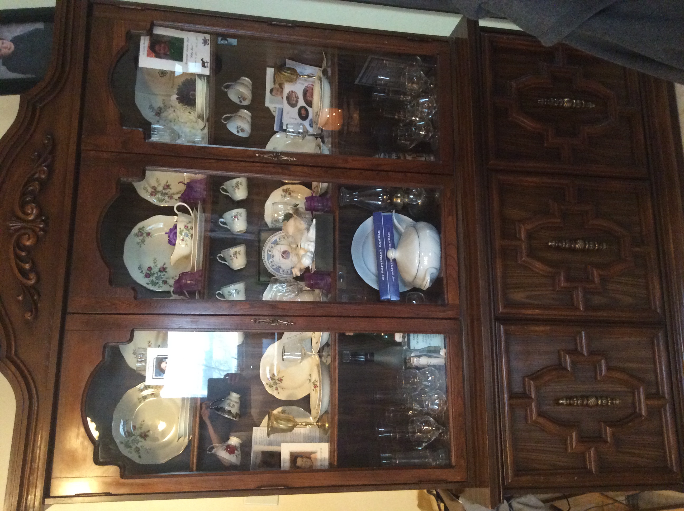 Just wanting to find out what this might be worth, I have to down size and I dont have the room for this piece, its 72 inches high, the length is 60 and the depth is 16 inches! The shelves inside are glass and there is a light in the top you can plug in to light it up. Underneath it has two cupboards and in one of them is a drawer im assuming for cutlery! Oh and its two pieces one sits on the other.