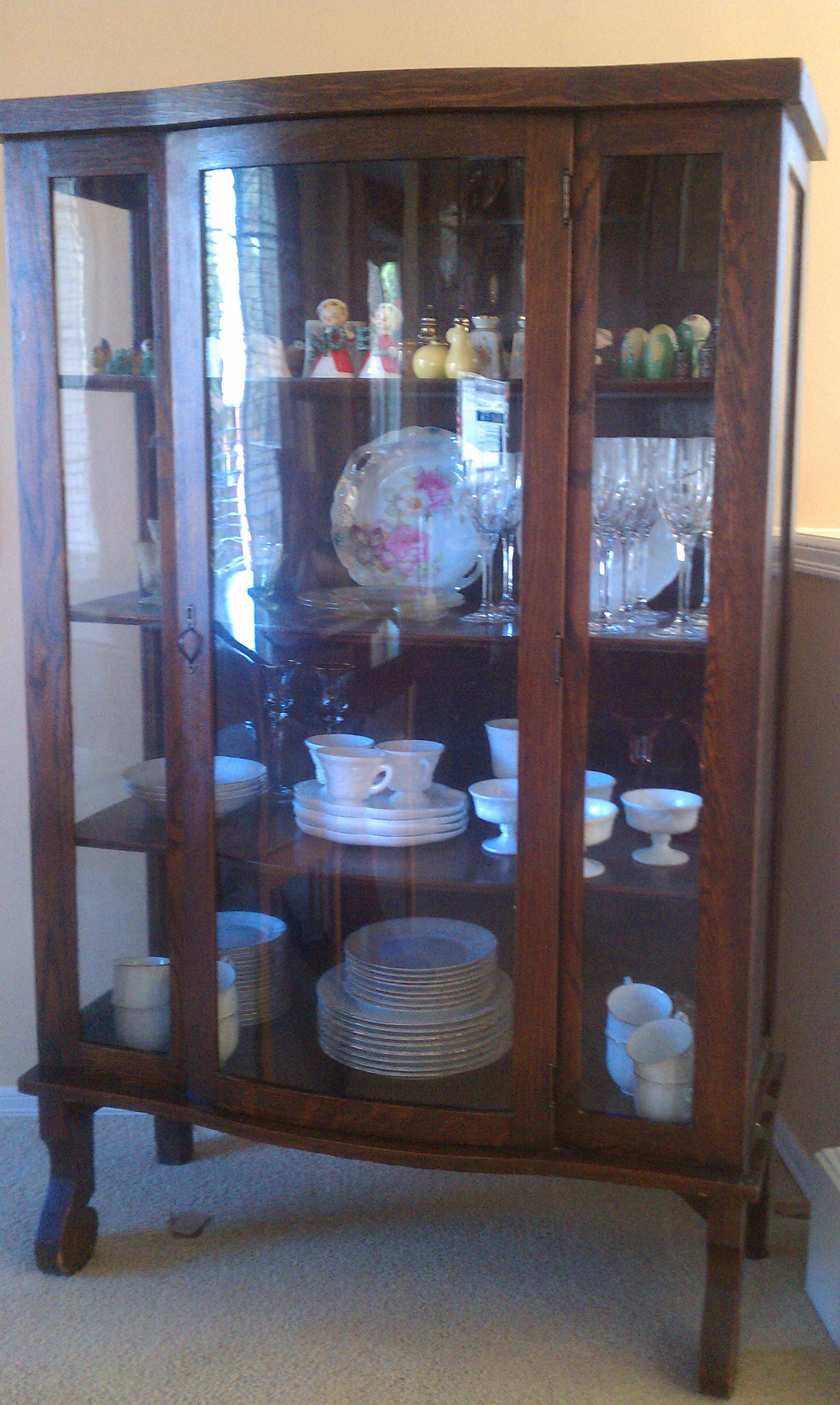 Antiques China Cabinet, curved glass door. I believe the wood is oak. Original glass.
