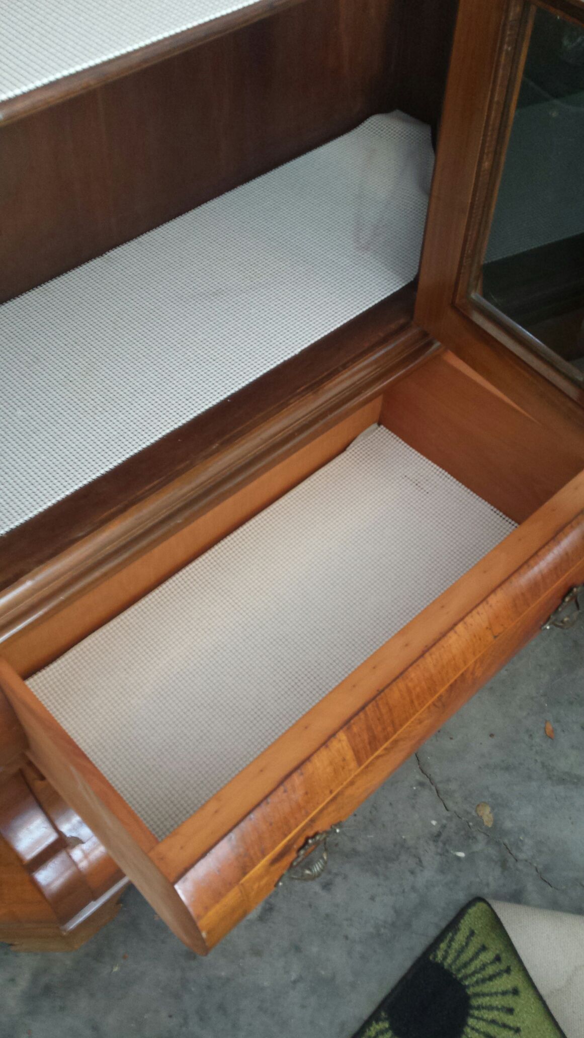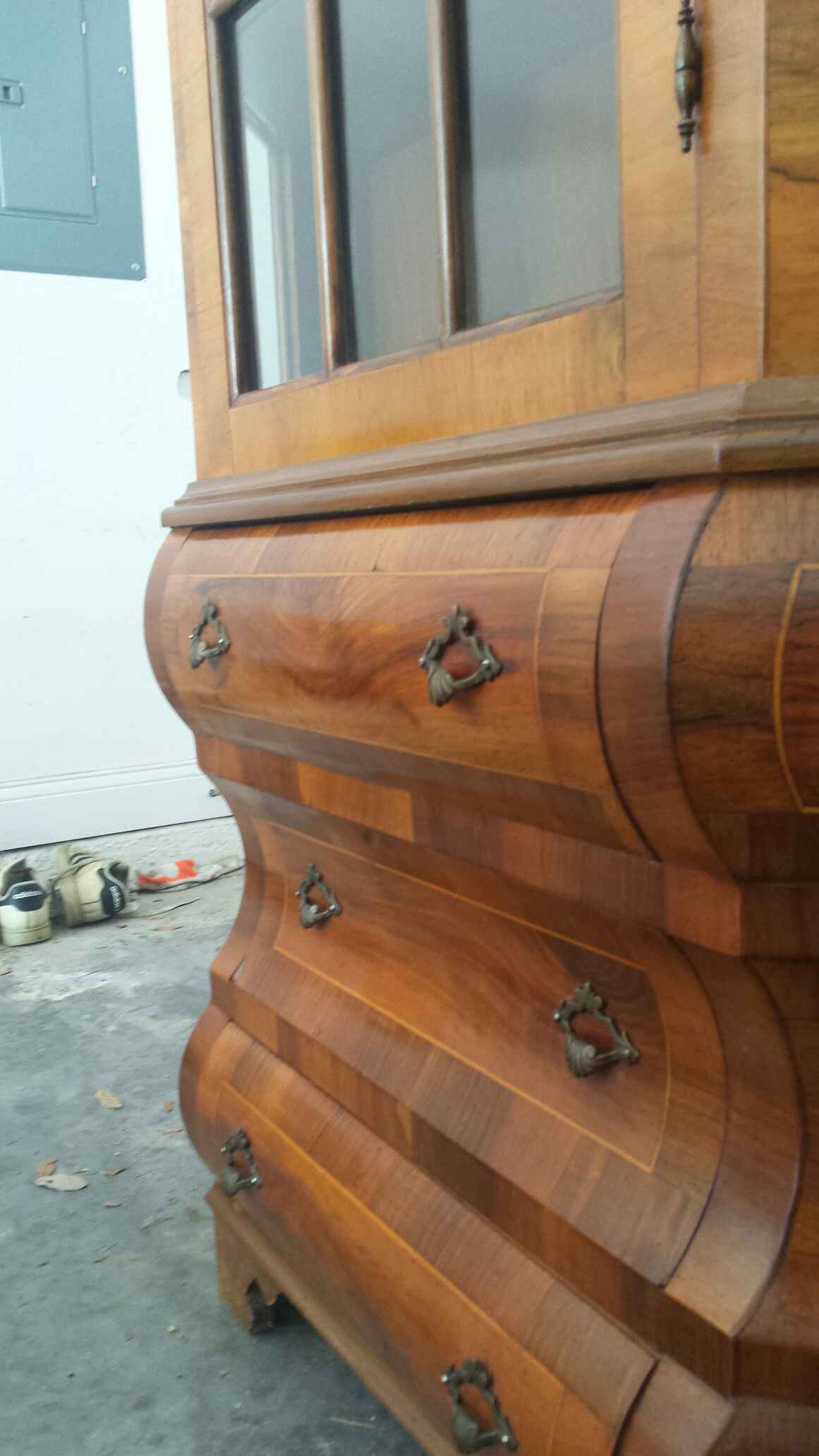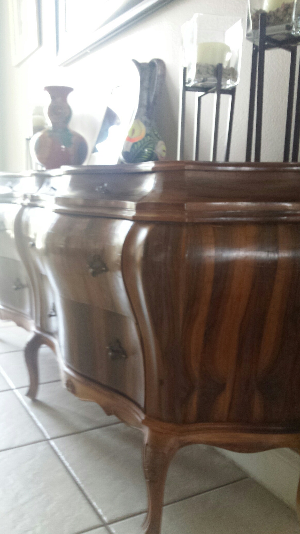 Furniture is not made like this anymore! Beautifully hand crafted with real wood, this two piece china cabinet will be a vocal point in any home. The curves that go along with the wood are breath taking. The China Cabinet has three levels to display your precious items along with three drawers underneath for some well appreciated storage. This amazing trapezoid shaped china cabinet can be seen from all three sides with crystal clear glass. The flat back of the china cabinet will allow you to place it right against any wall of your choosing. The buffet table has the same magnificent design as the china cabinet. The curved wood is a masterpiece that will have all of your guest asking questions. The top can be used to show off pictures or your favorite nic-nak while 4 big drawers will help all of your storage needs. There are even 4 little drawers at the very top of this buffet table to help store the little items that you do not want lost around the house. A chance to buy two matching pieces that are eligant in all areas will add unique character and a touch a warmth to your home. DO NOT MISS THIS OPPORTUNITY!