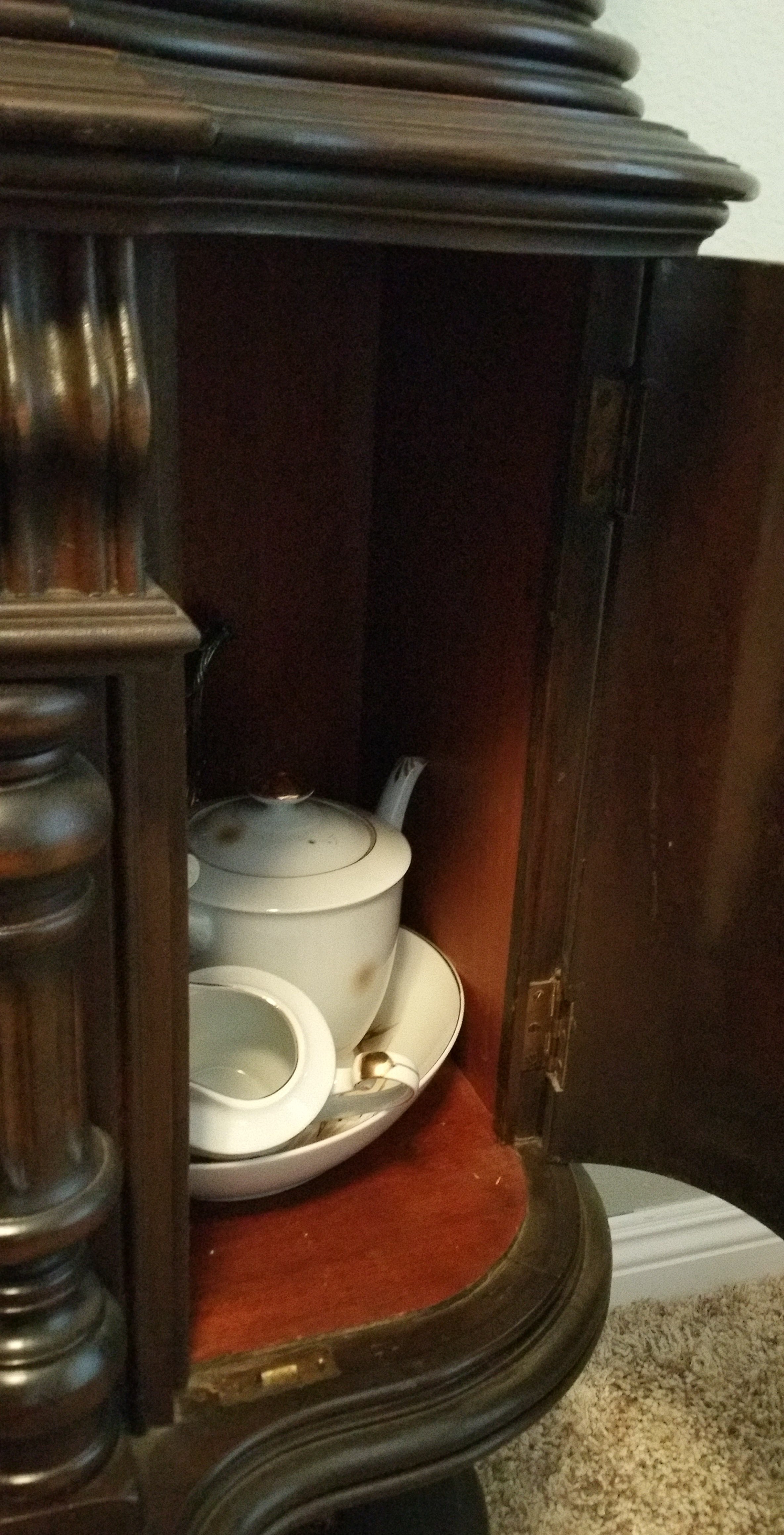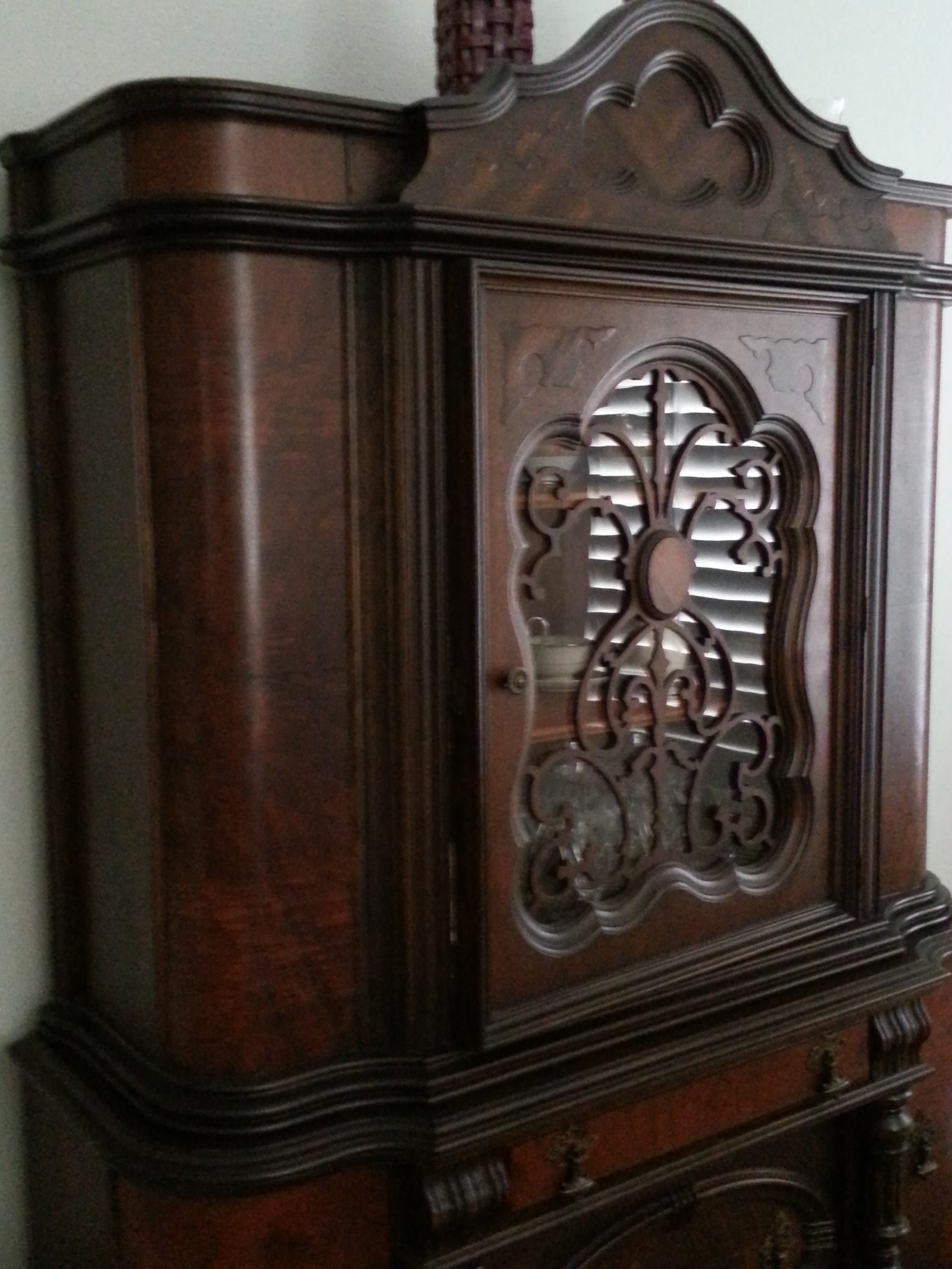 This is cabinet has a matching buffett/serving table. From the research that I have done I believe these pieces are "Jaconean Knuckle" pieces. The cabinet has 2 shelves behind the glass door, 1 narrow drawer and 1 large drawer beneath the cabinet. There is a cabinet on either side of the drawers both open for additional storage. There no markings on it that I can find other than the chalk writing on the back. It is in excellent condition no scratches. These pieces were given to me and I would like to get the history on them, I may sell them in the future.