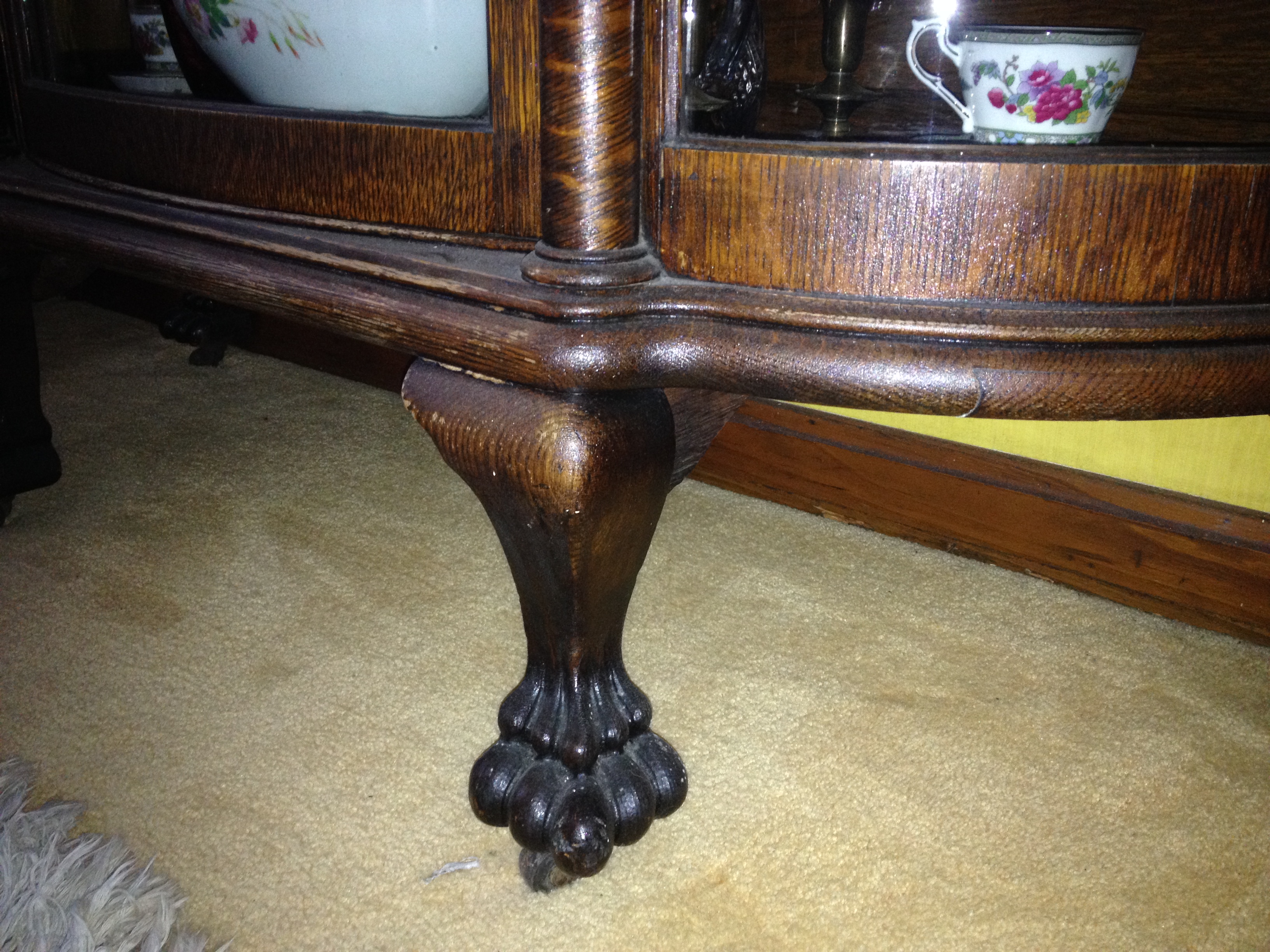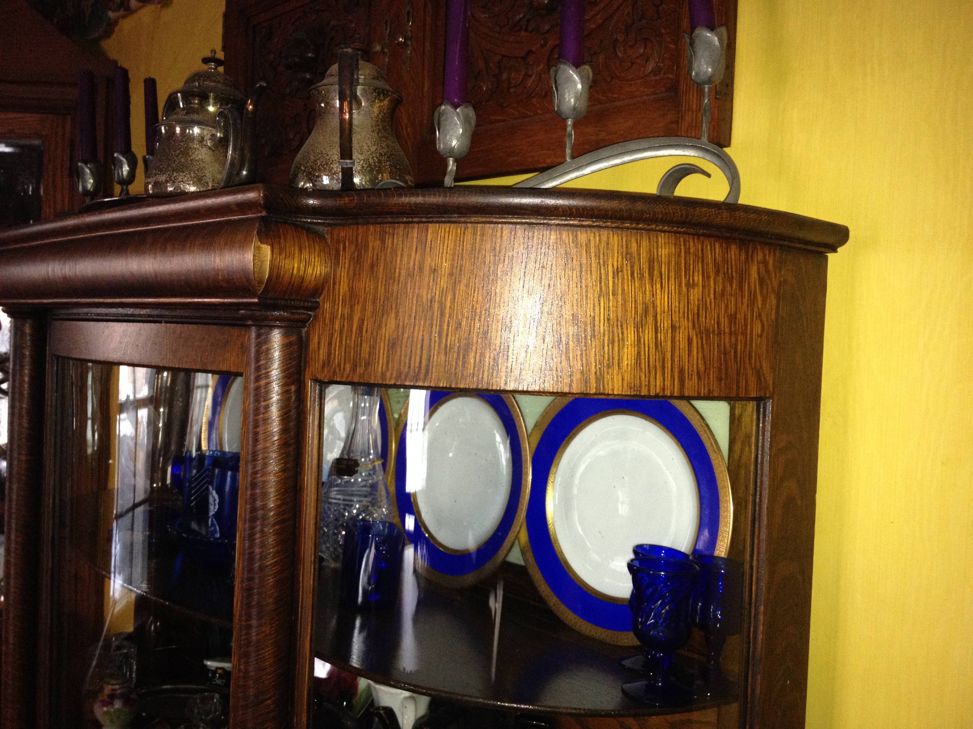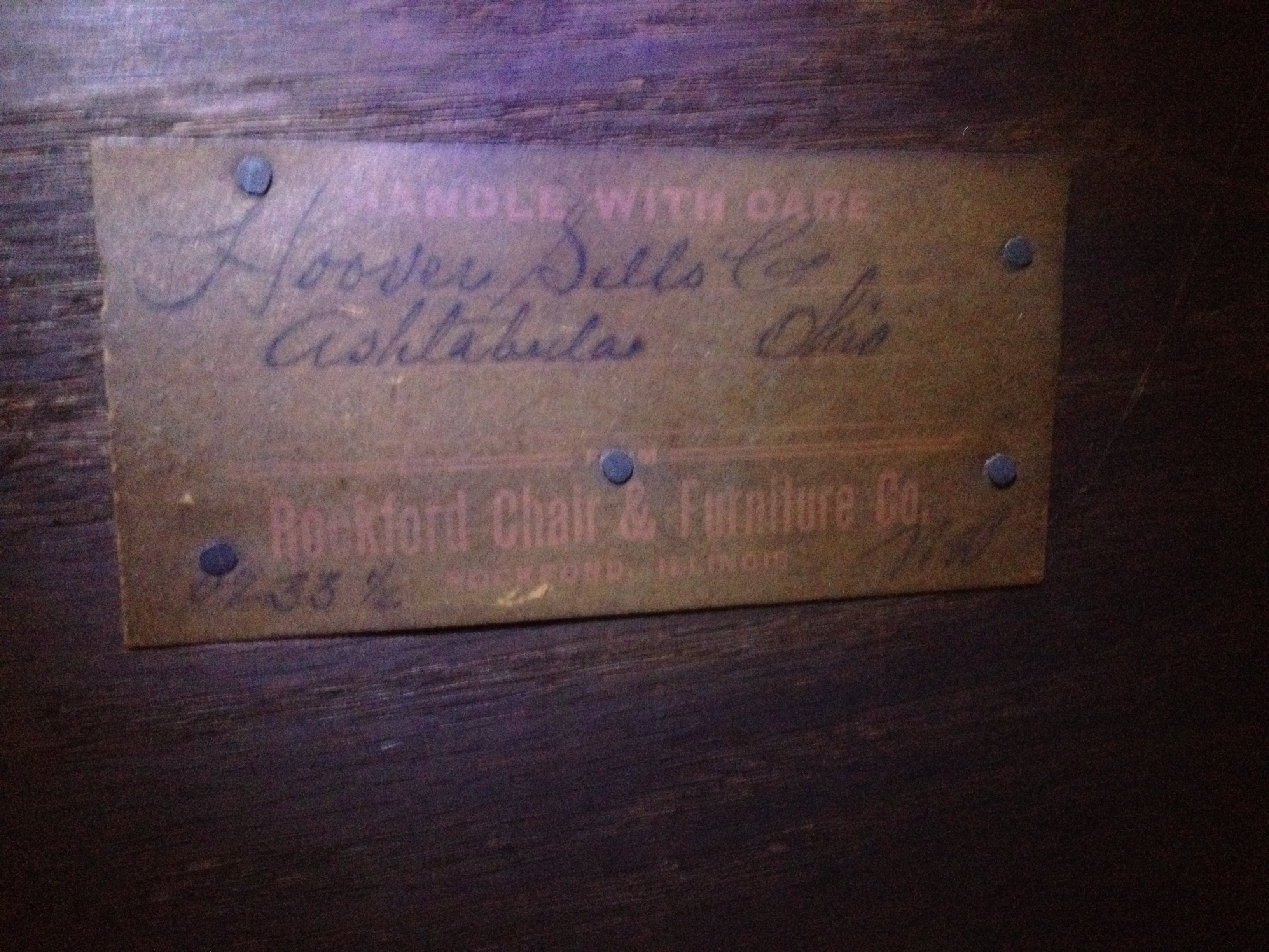 China cabinet that is 5' 7" tall (with the small wood wheels) by 3' 10" wide.  My parents bought it at an estate sale in Chesterland, Ohio about 10 years ago.  The tag on the back of the cabinet, as seen in picture, states Rockford Chair & Furniture Co., Rockford, Illinois.  Looks like hand printed numbers on bottom left show "0233 1/2" and two letters on bottom right, also hand printed, "N B".  Top of tag shows in hand print "Hoover Sells Co., Ashtabula, Ohio".   The piece looks like it has not been refinished.