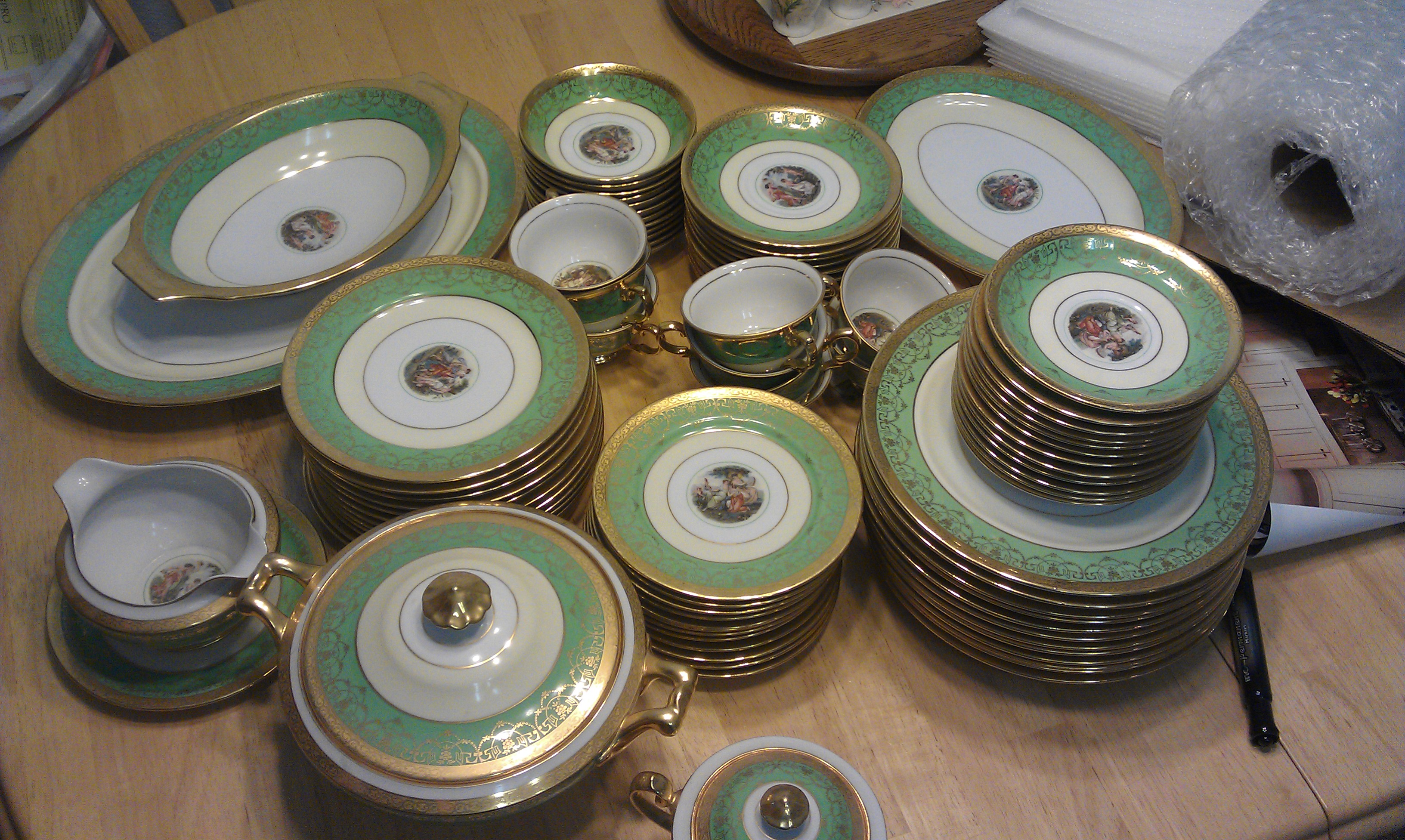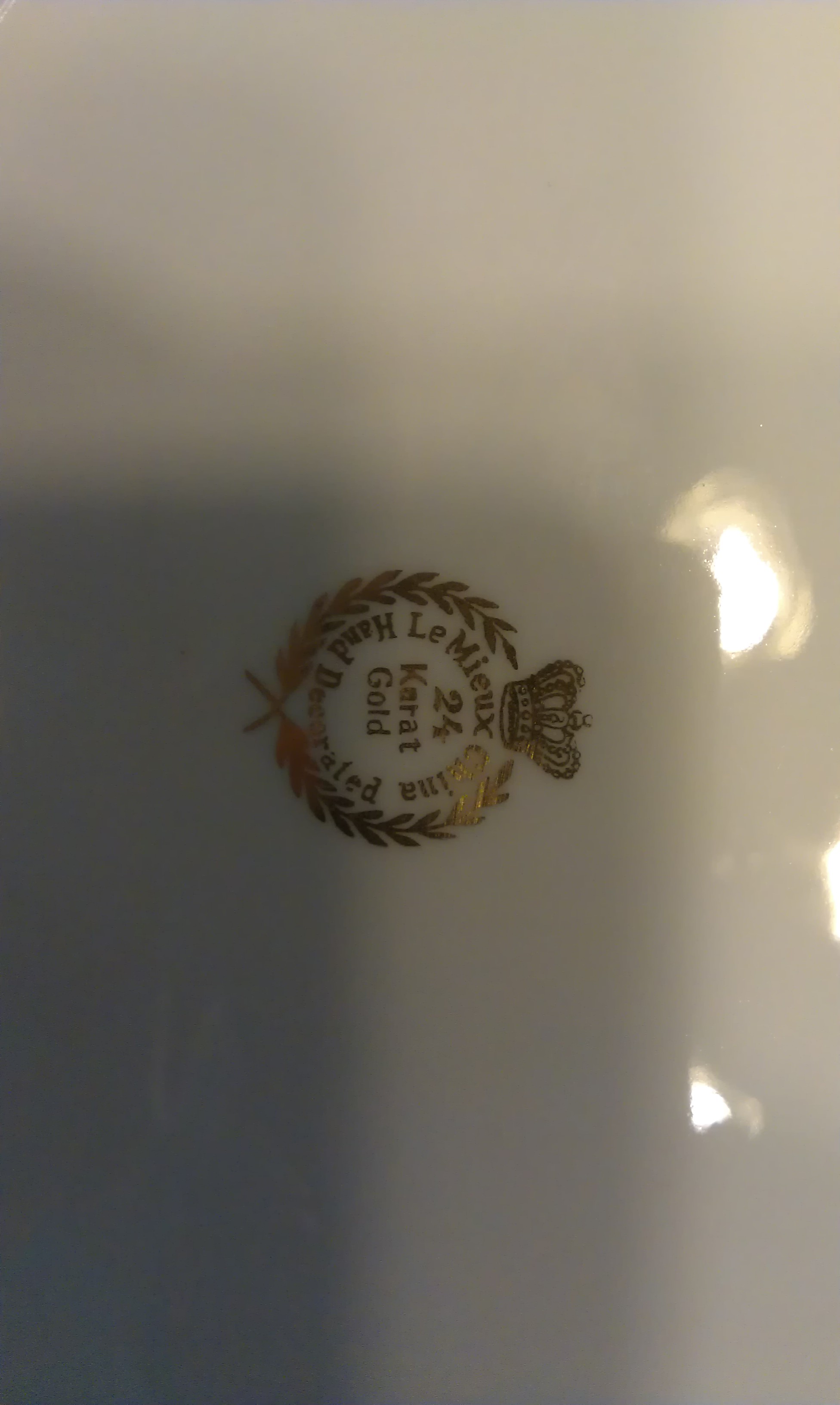 120 piece Le Mieux China hand decorated 24 k gold w pic of a crown. 16" & 12" platters, 8" serving bowl w handles & top, 12" incl handles serving bowl, sugar w lid, gravy dish w attached plate, 24 salad plates, 12 dinner plates, 12 bowls 5 1/4", 9 coffee cups, 12 saucers, 1 dz tiny matching salt & pepper.