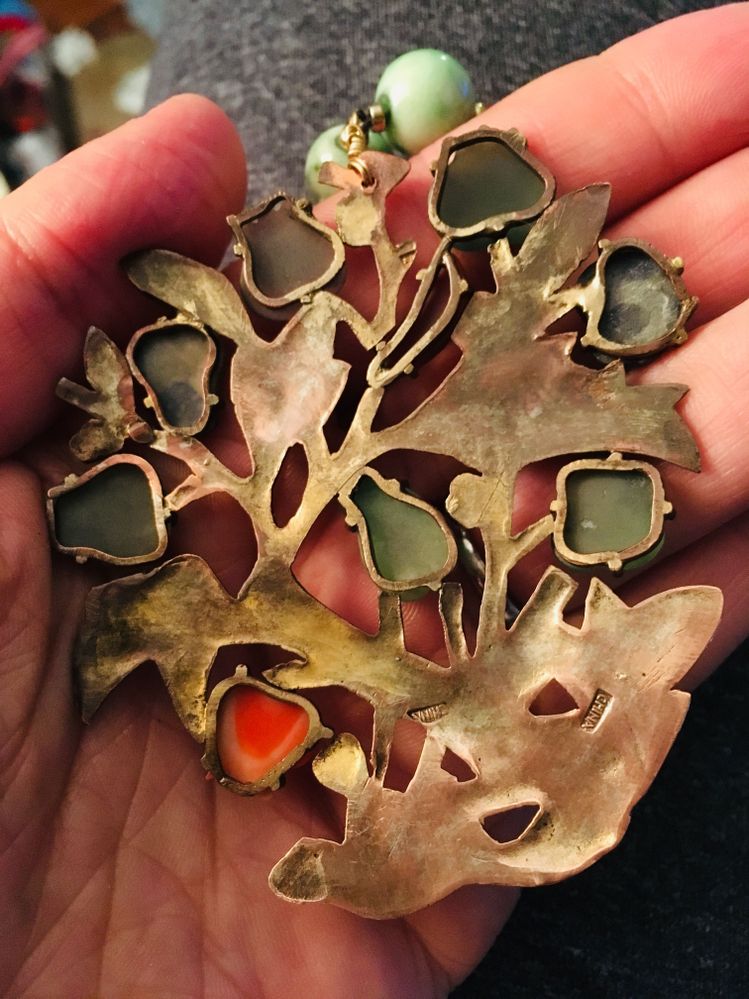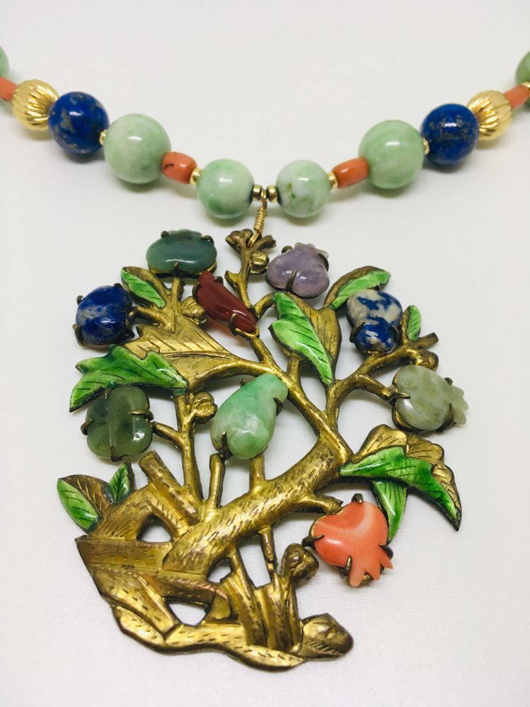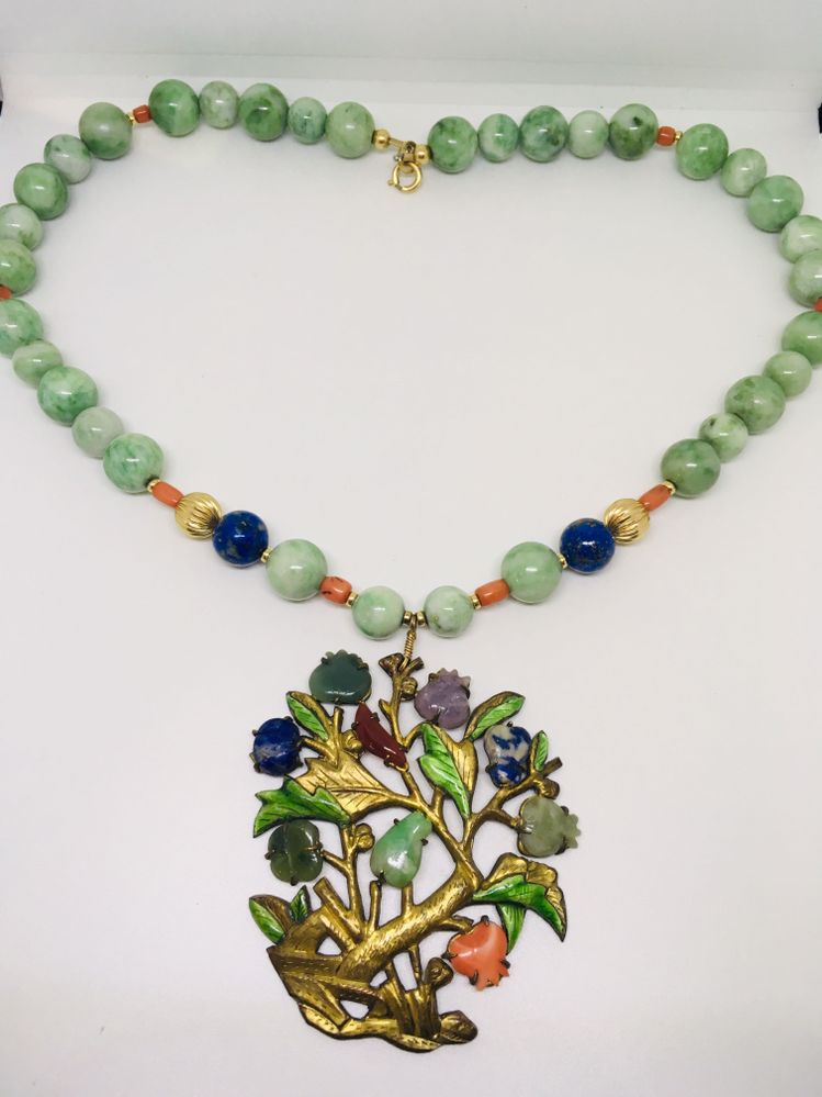 Thank you for taking a moment and looking I'm kind of at a loss with this necklace pendant I believe the pendant was added to the necklace not sure about the stones on the necklace it appears to be Coral lapis maybe Jade the metal on the pendant I believe is brass with a gold overlay. The clasp is 14k