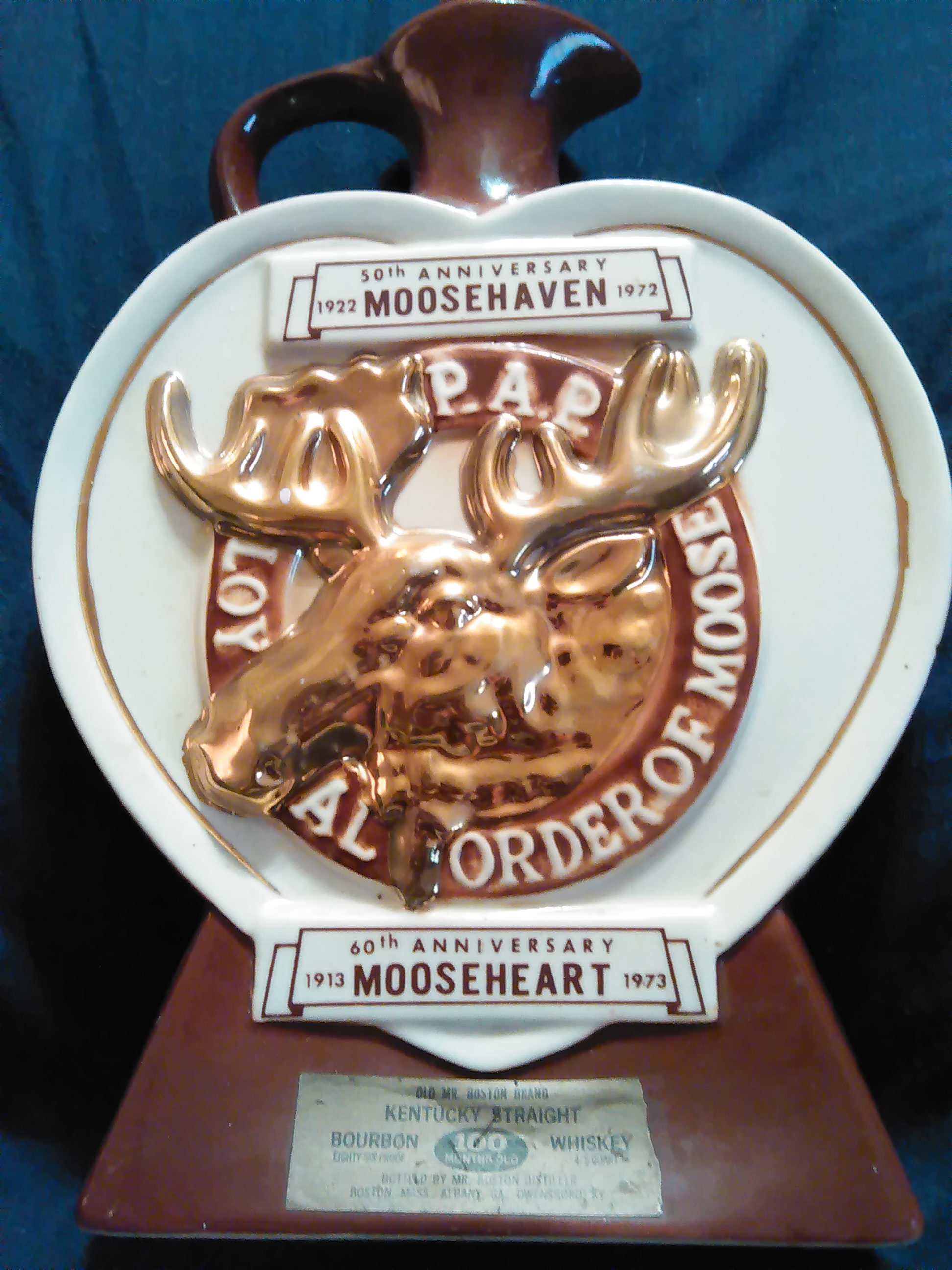 One is a no. 21 1972 royal Halburton 50th anniversary 1922 1972 Woodhaven 60th anniversary 1913 1973 mooseheart 100 months old Kentucky straigh old Mr. Boston brand. The other is genuine regal china 1974 c. Miller regal china corporation 145 liquor bottle 100 months old beam.