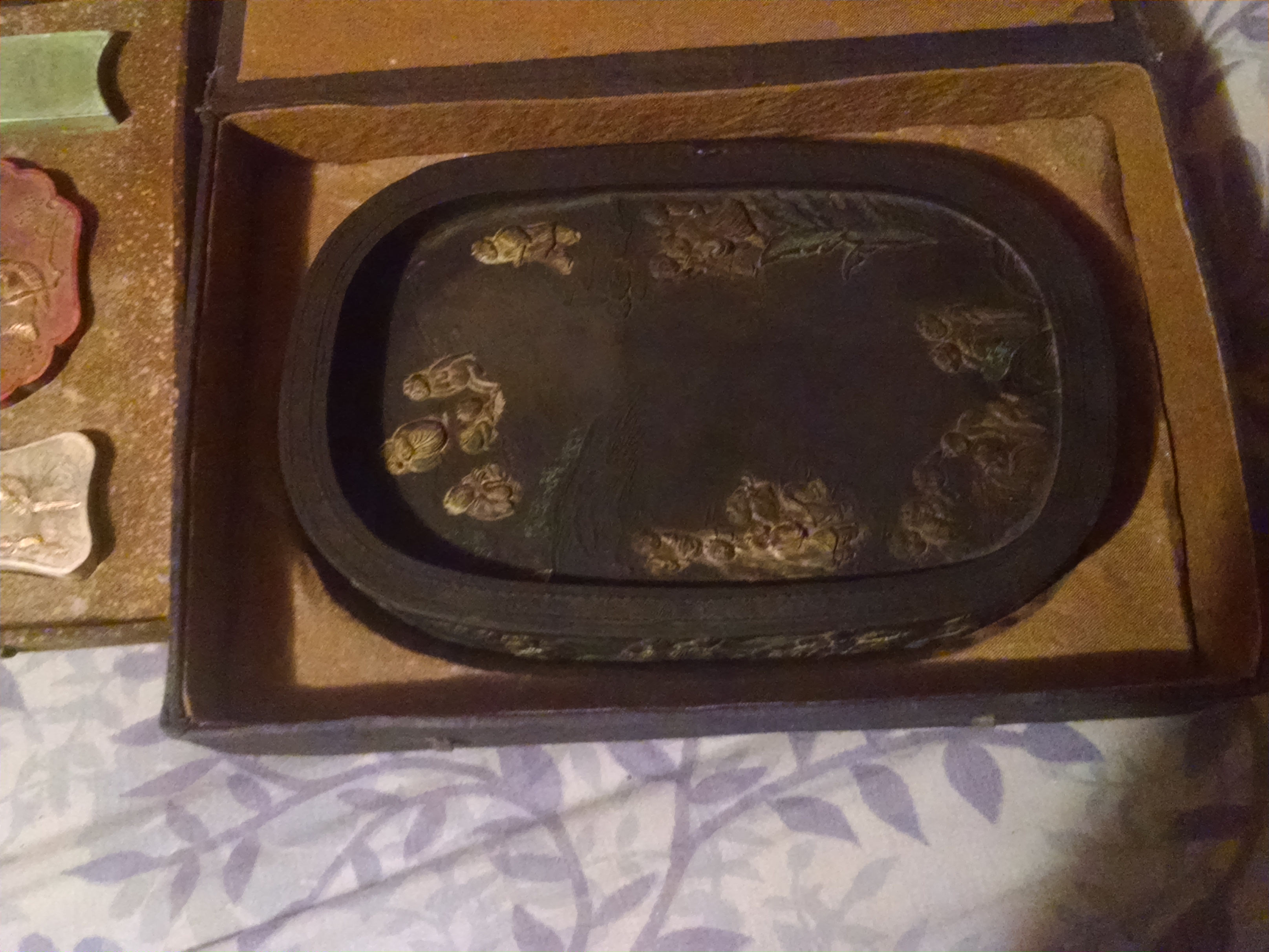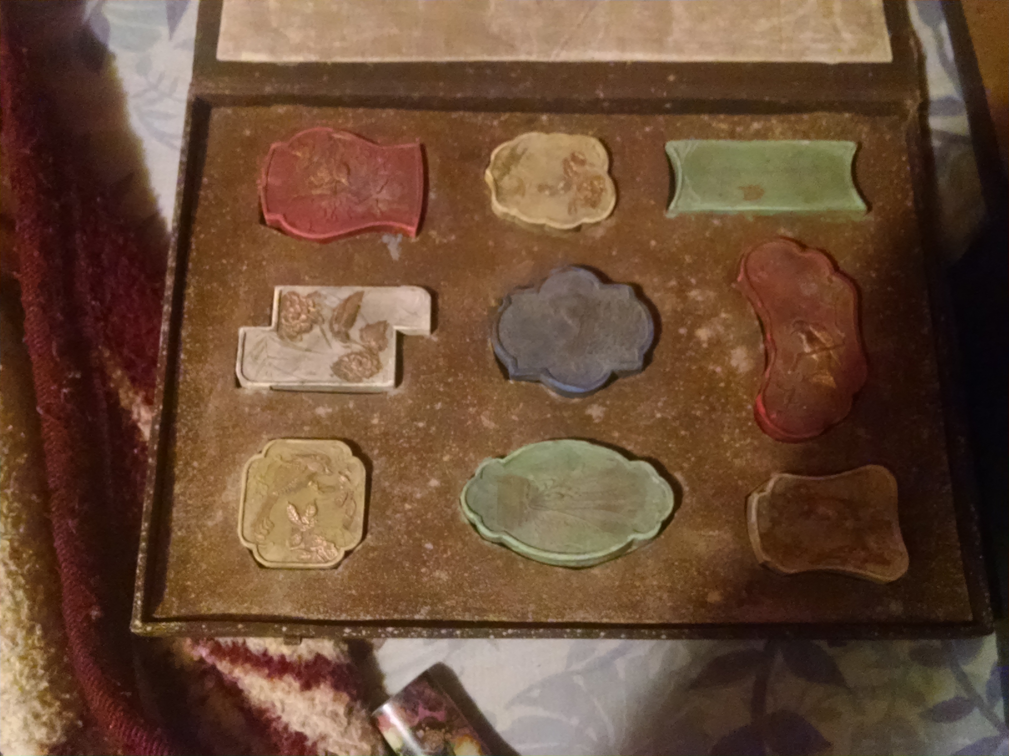 Stamps and ink stone with Chinese lettering on one side of stone and flowers and birds on the other side of the stone stampers made of porcilen or some kind of stone and the ink stone has China men or Japanese people on it still in original wood boxing's