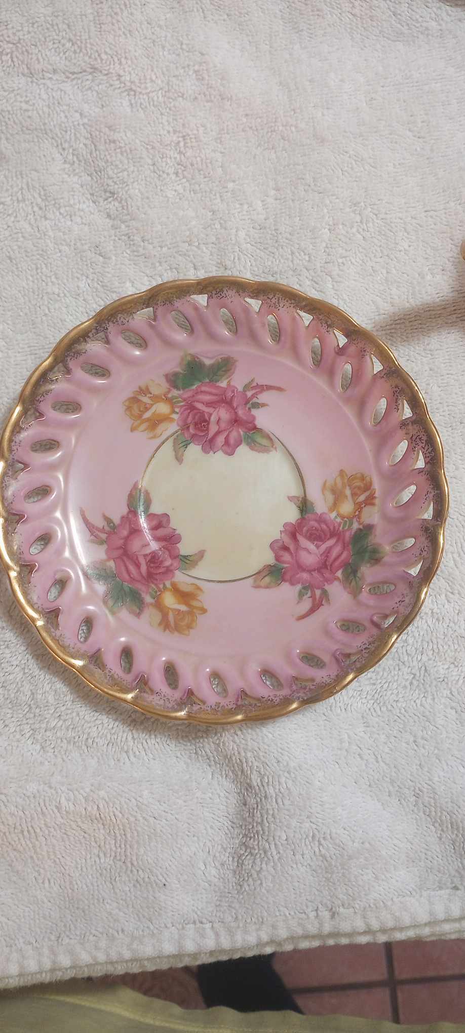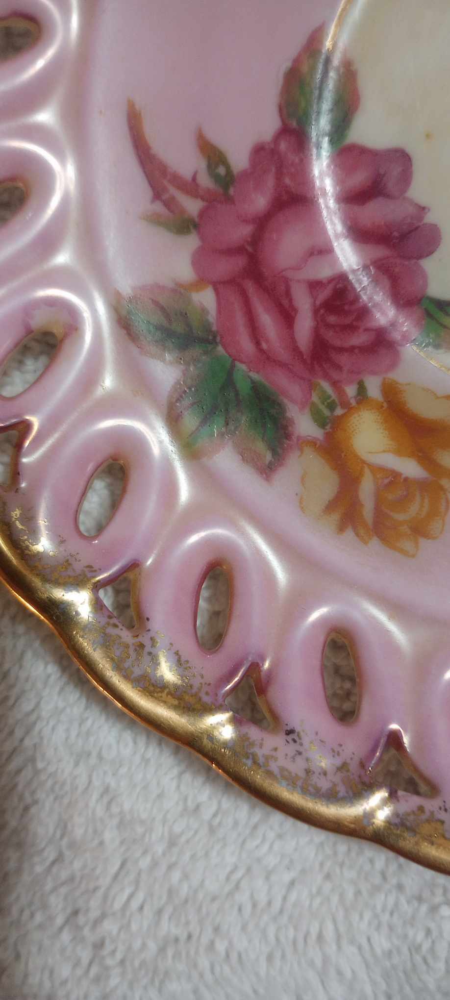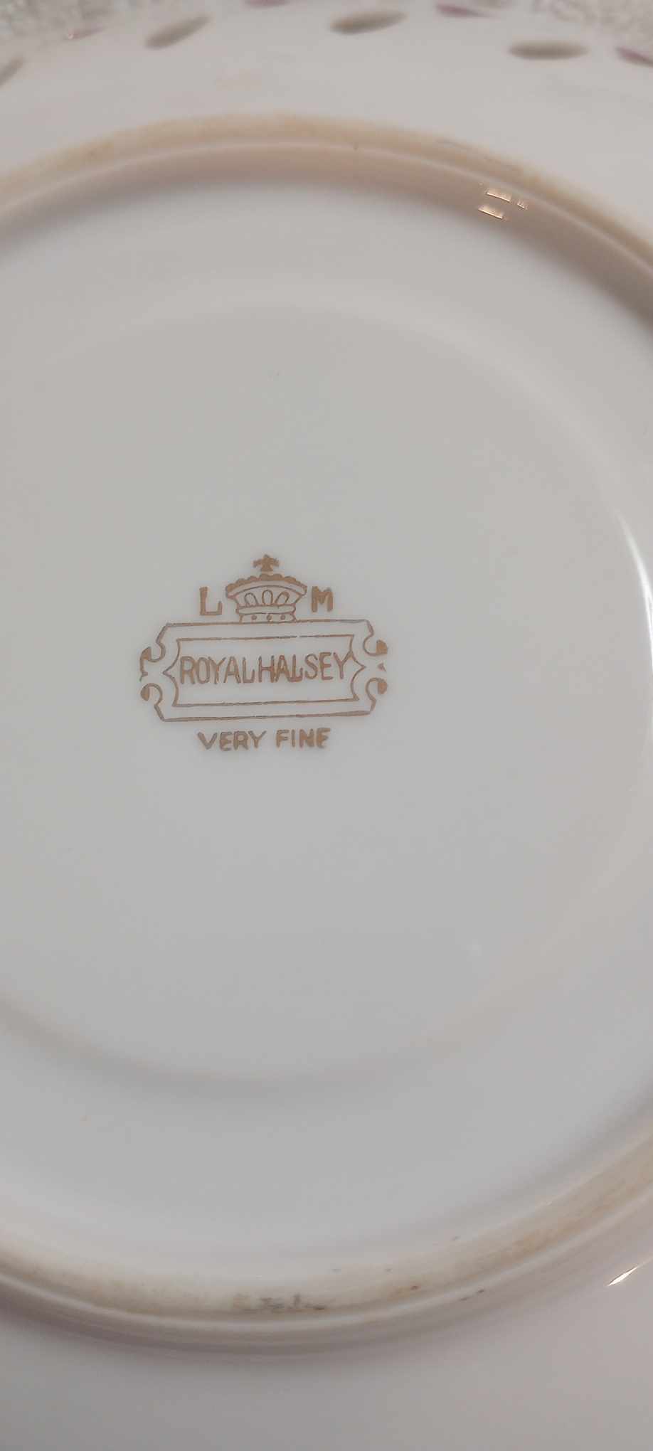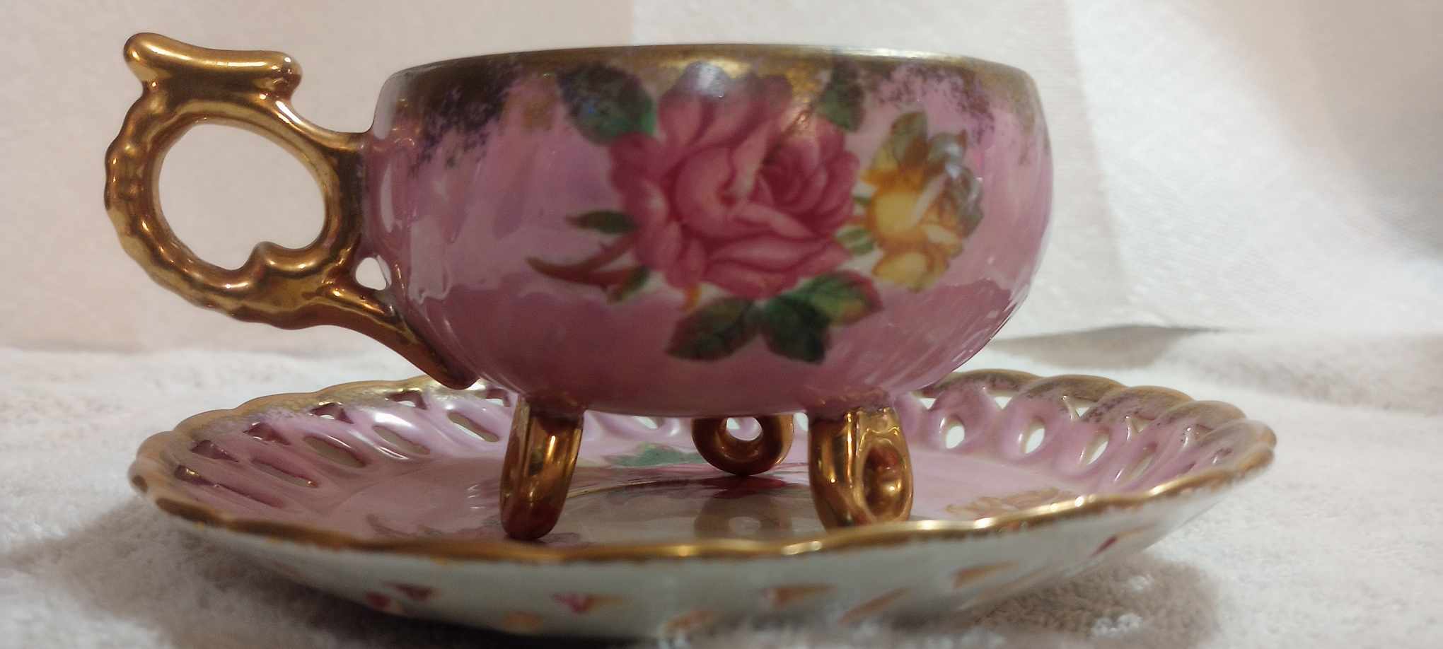 Vintage Royal Halsey Very Fine China pink and yellow roses' trimmed in gold. 3 footed teacup and saucer.