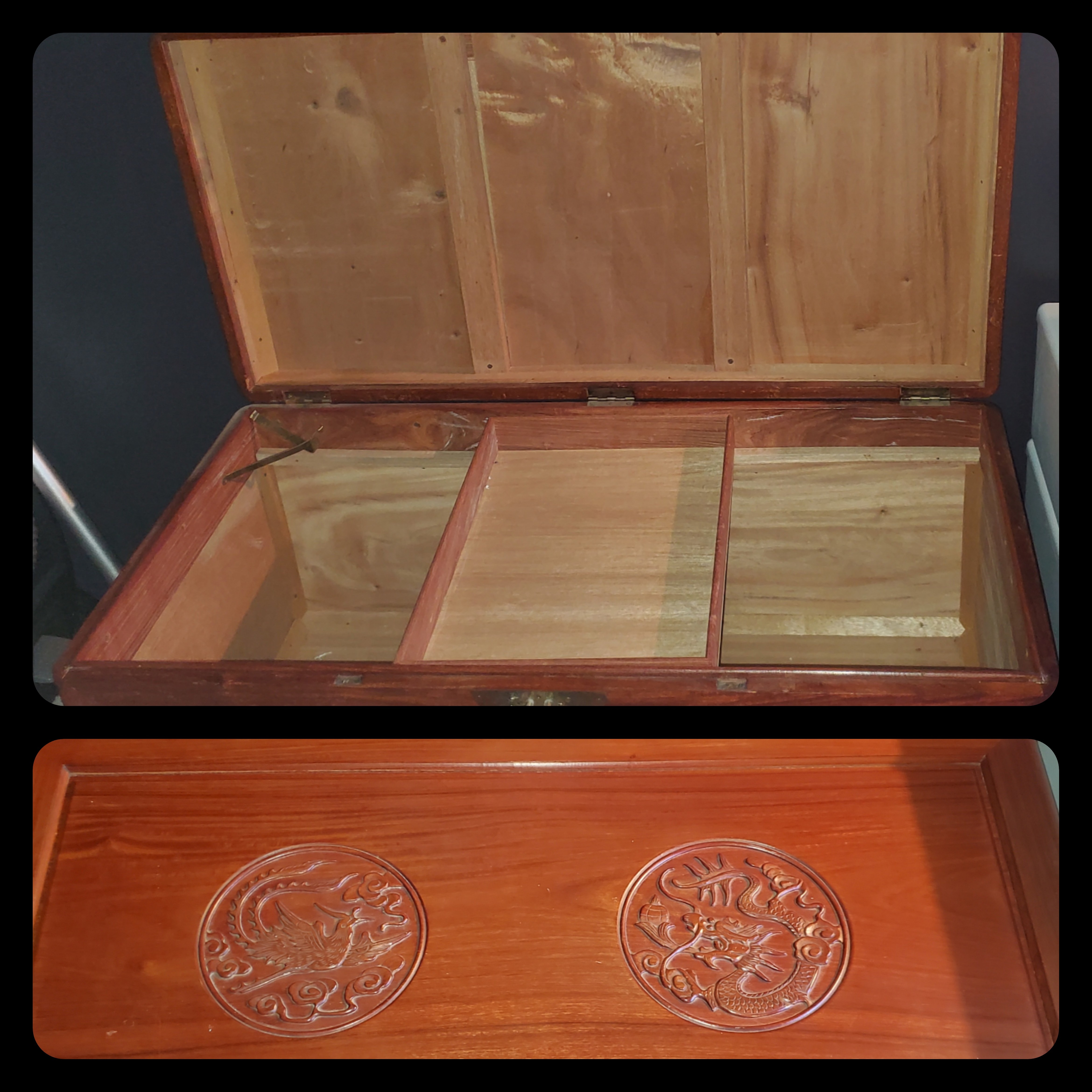 The camphor box likely originates from China or Korea, where such boxes were traditionally used for storing valuables and clothing. Camphor wood is known for its fragrant properties and resistance to insects, making it a desirable material for storage. The phoenix and dragon motifs are significant in Chinese culture, symbolizing harmony and power.