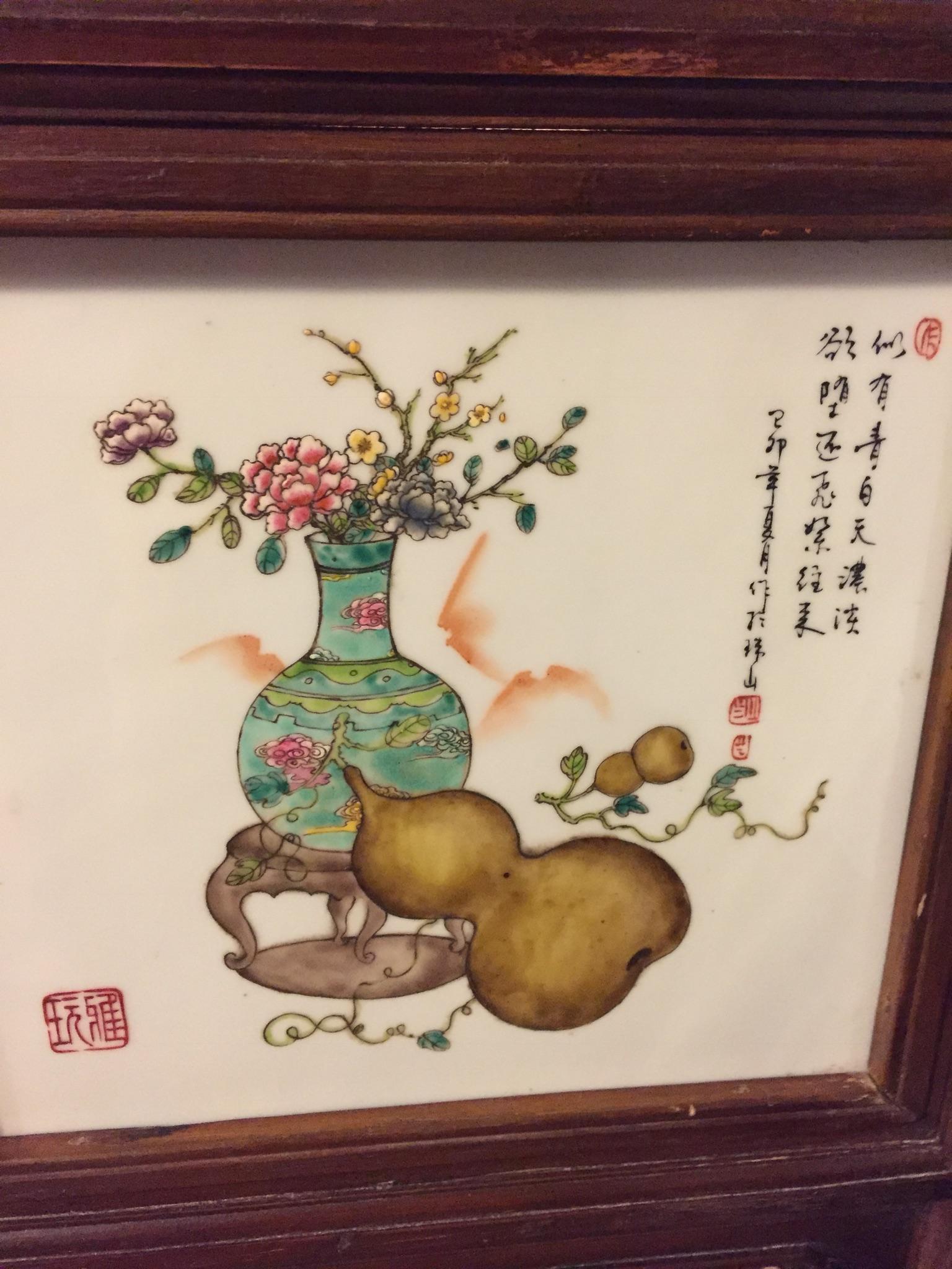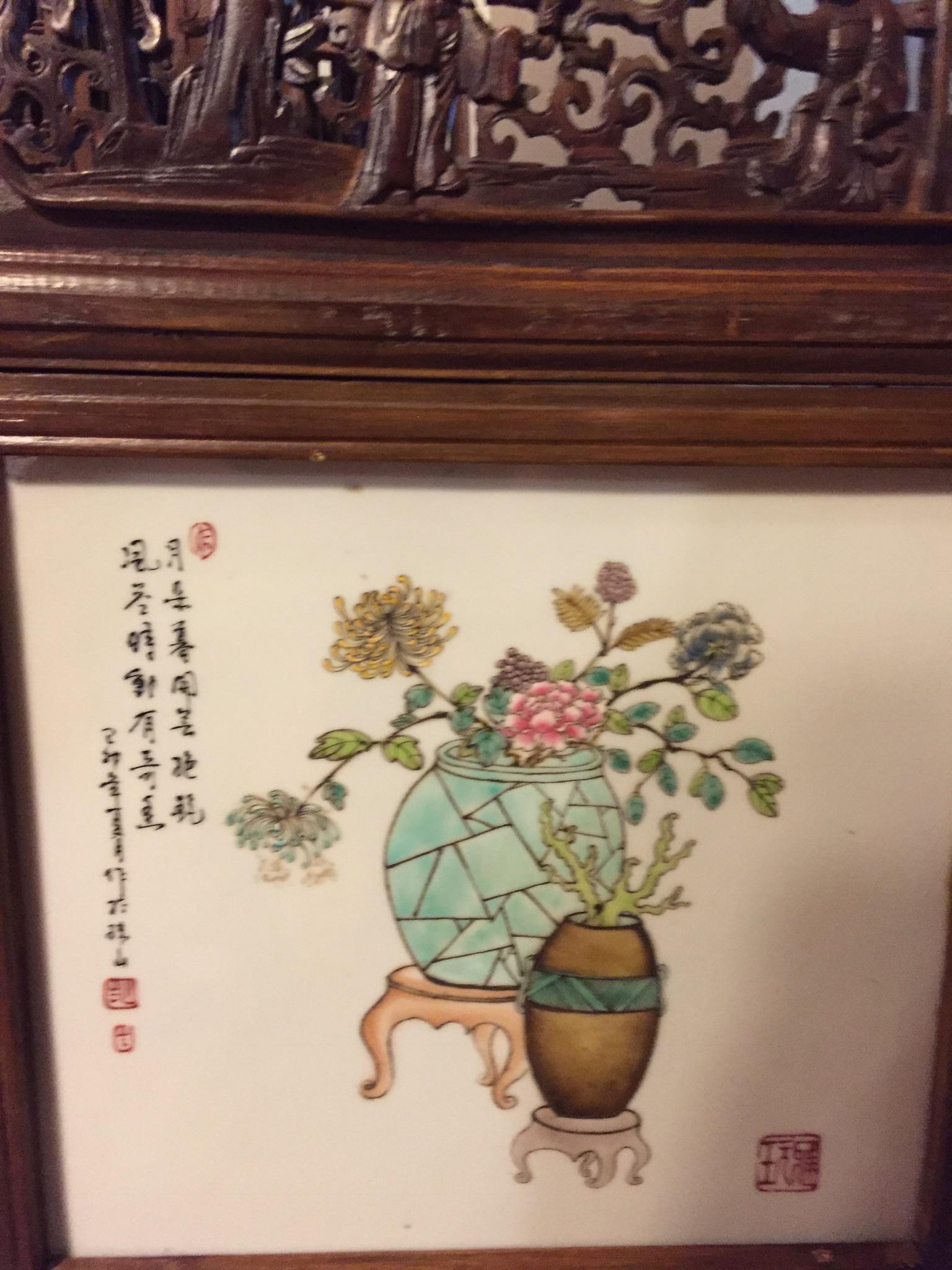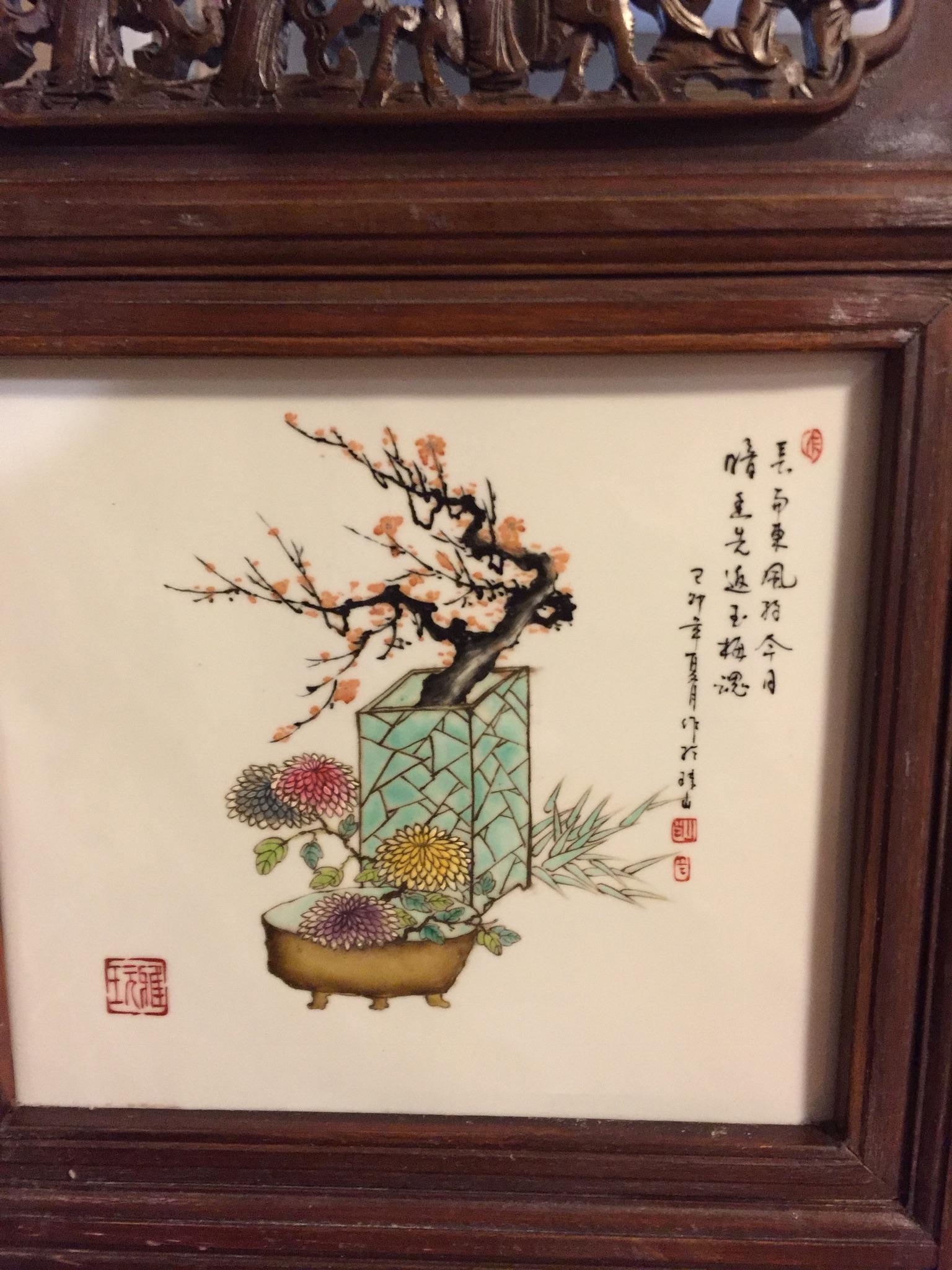 Was told This piece was made for a Chinese doctor to protect the privacy of his female patients. It looks like the carved wooden panels were removed to placed the porcelain art that is signed. Not sure of the age, the older lady who had the piece believe it was late 1800 , early 1900. We really don’t know the value. The art may be worth more than the room divider and can be removed. I would like to know the artist and any other information.