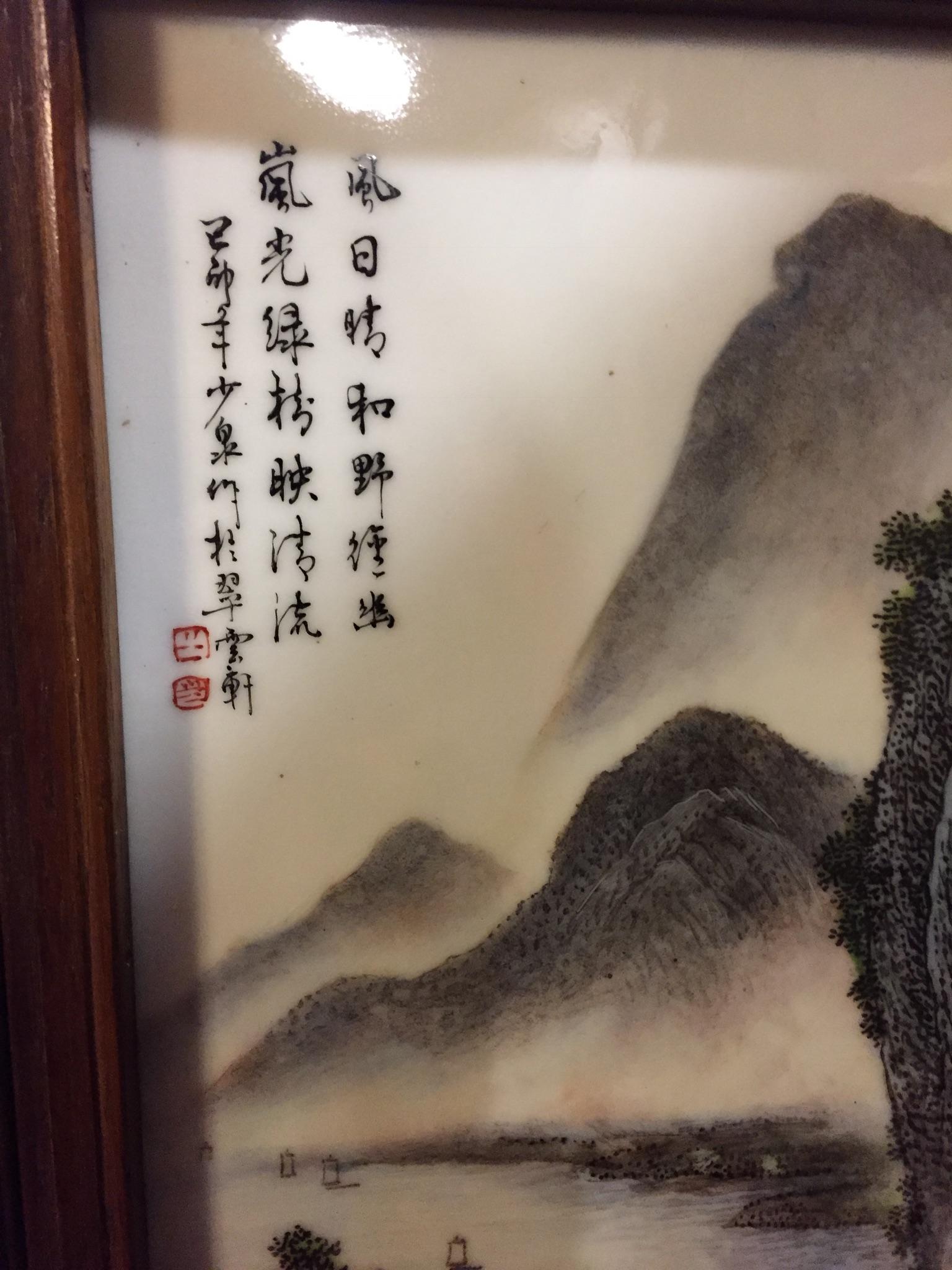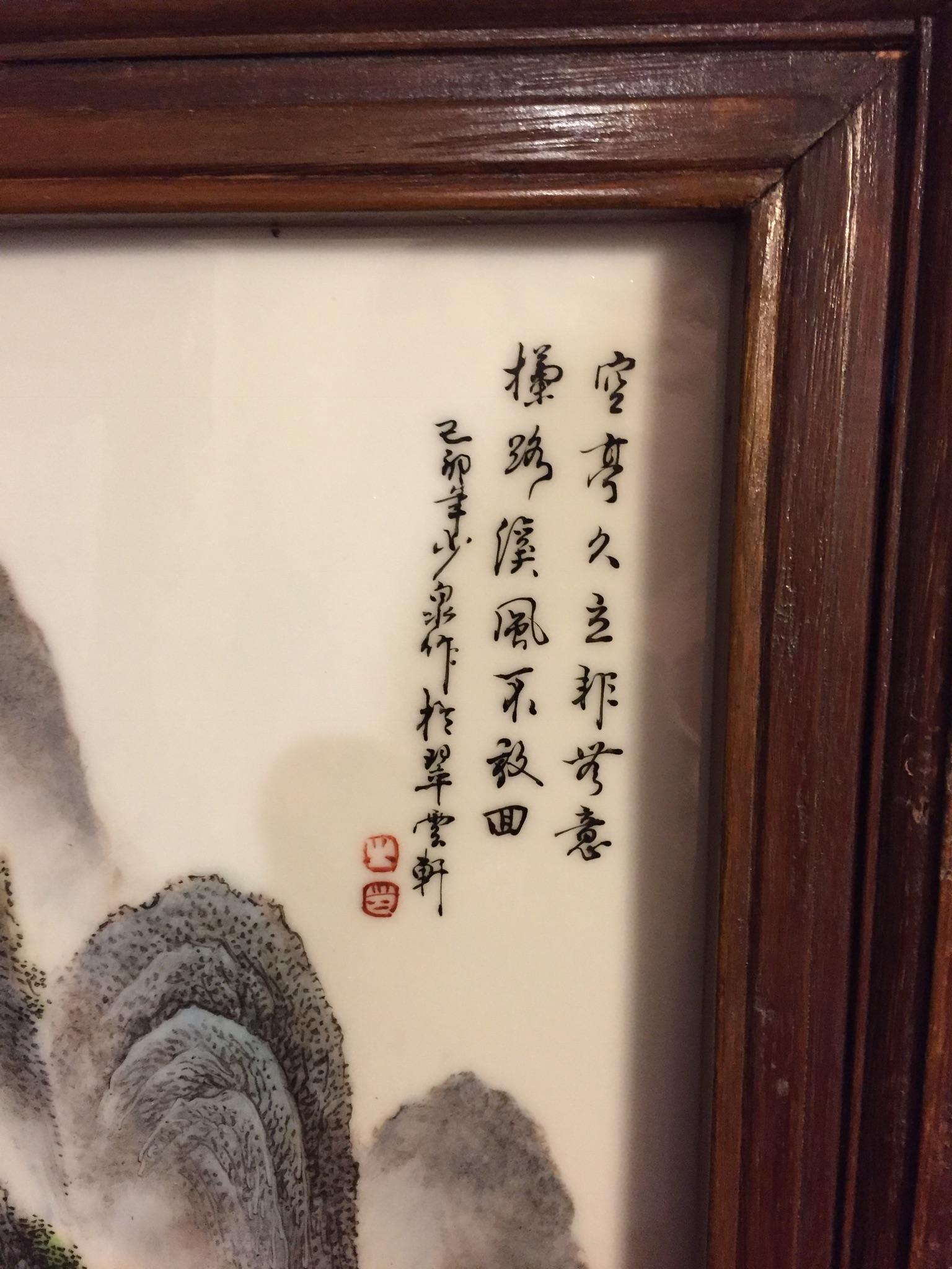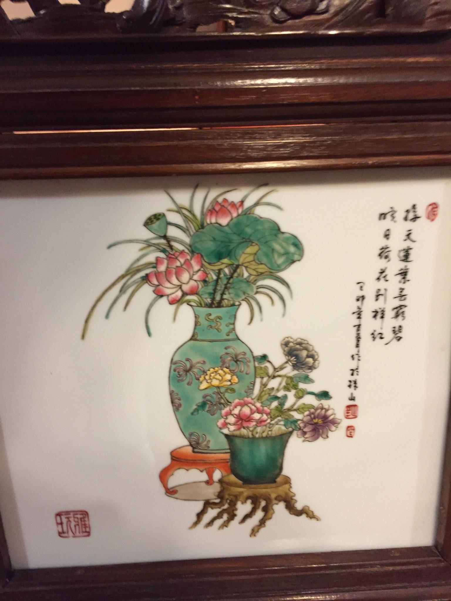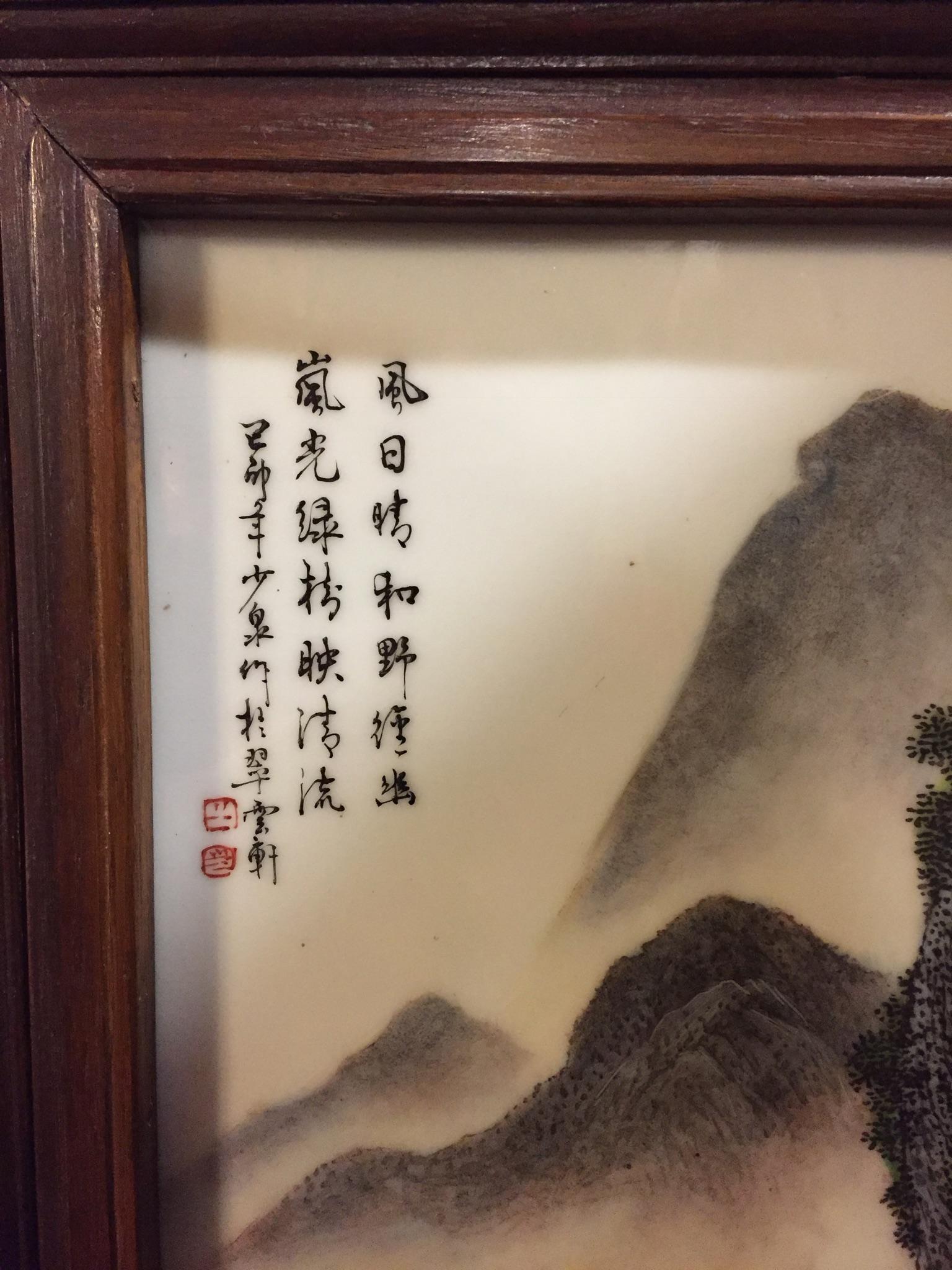 Was told This piece was made for a Chinese doctor to protect the privacy of his female patients. It looks like the carved wooden panels were removed to placed the porcelain art that is signed. Not sure of the age, the older lady who had the piece believe it was late 1800 , early 1900. We really don’t know the value. The art may be worth more than the room divider and can be removed. I would like to know the artist and any other information.