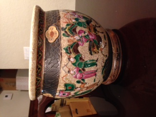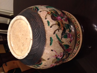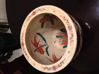 The bowl is 10" across at the rim; there are no identifting marks that seem to have been put on the piece; it seems to be fairly old.