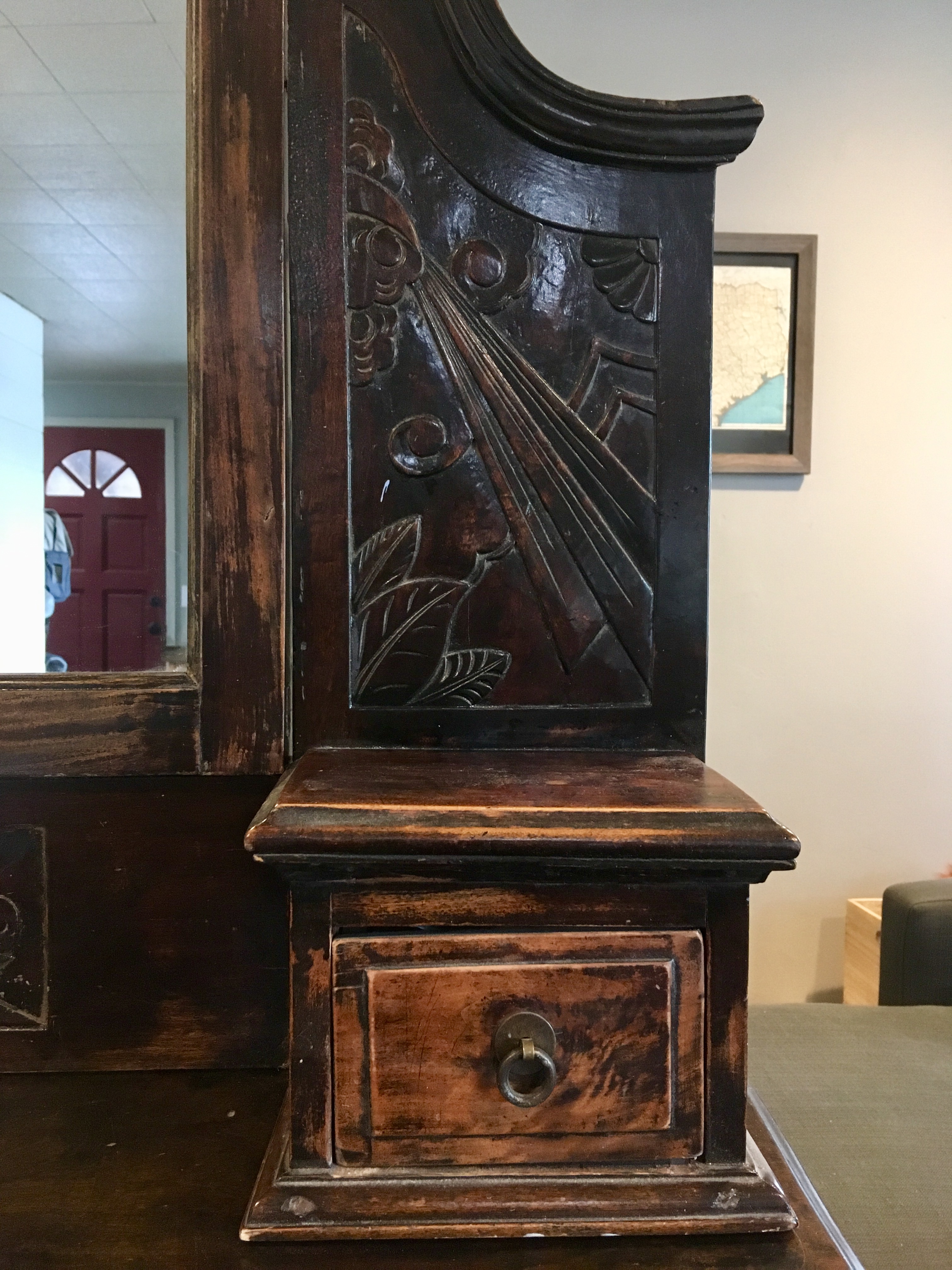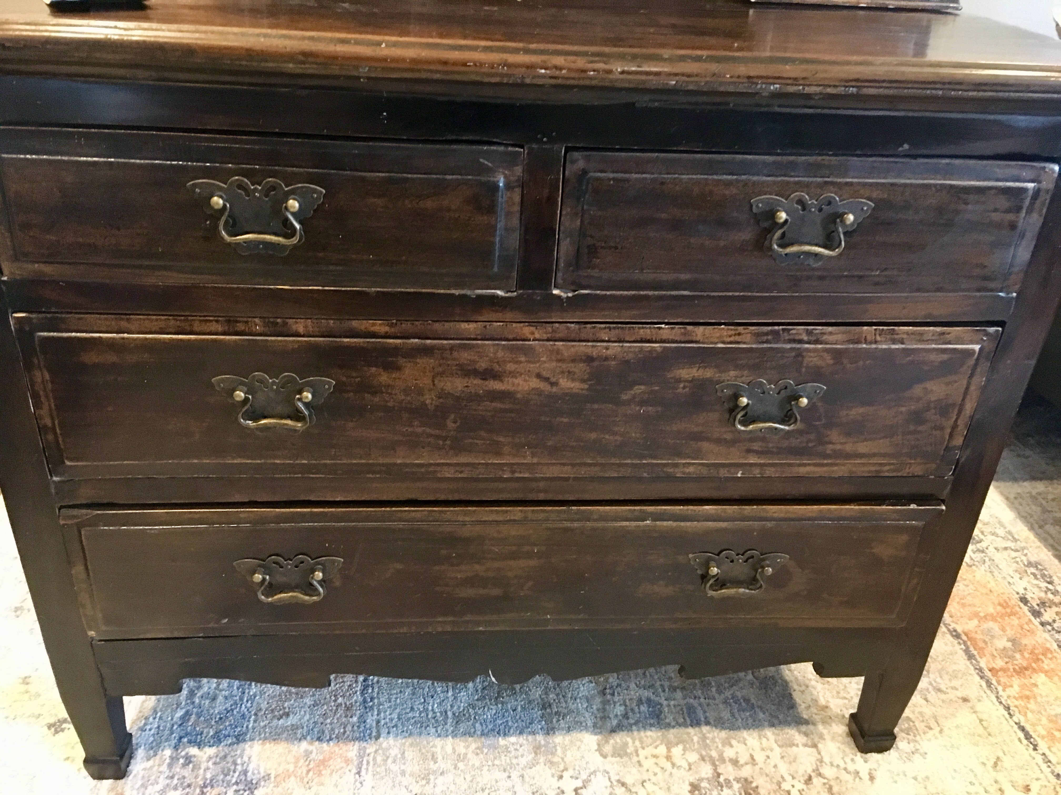 Beautiful antique Chinese dresser with unique details and woodwork. Carved design and butterfly door handles. Certificate of authenticity Included.