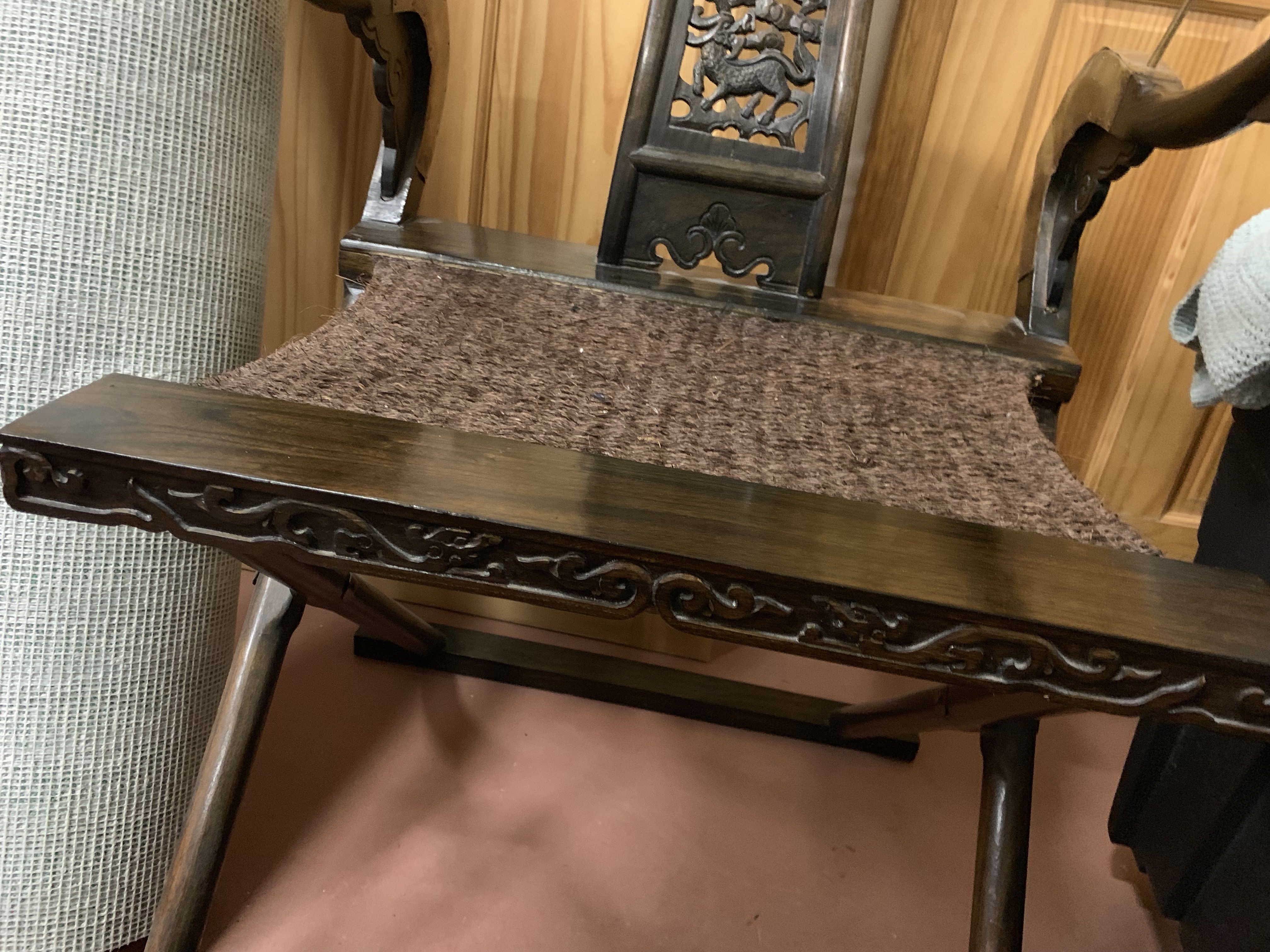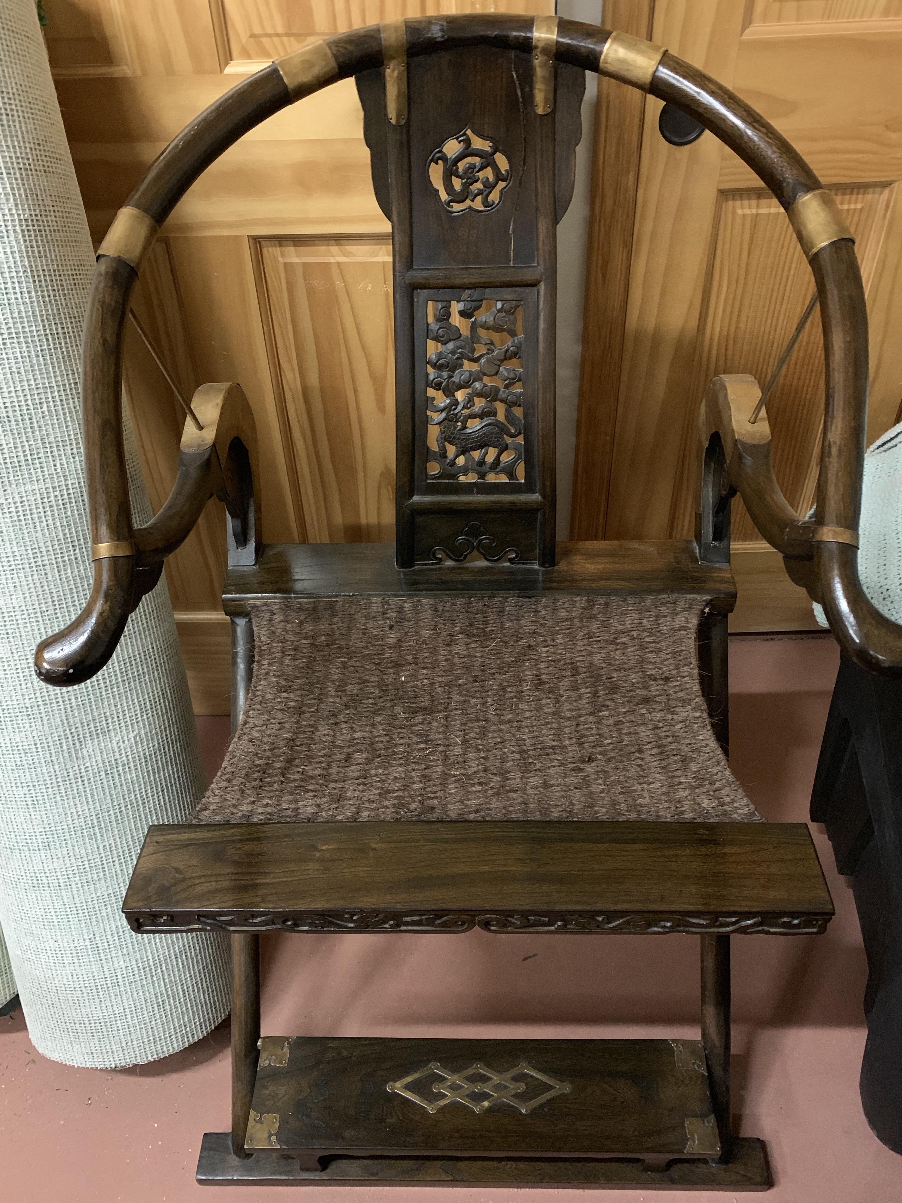 I bought this from a Chinese gentleman who sells Asian pieces he ships to Europe from China to sell at auctions. He was doing a fund raiser for the boosters club on the Naples Navy Base in Naples, Italy. I believe it is original and not a reproduction. It is made of wood and brass and the seat looks like things i've seen made from horsehair rope. It folds up to be more portable. He described it as a field marshal's chair used in battle to make the commander comfortable.