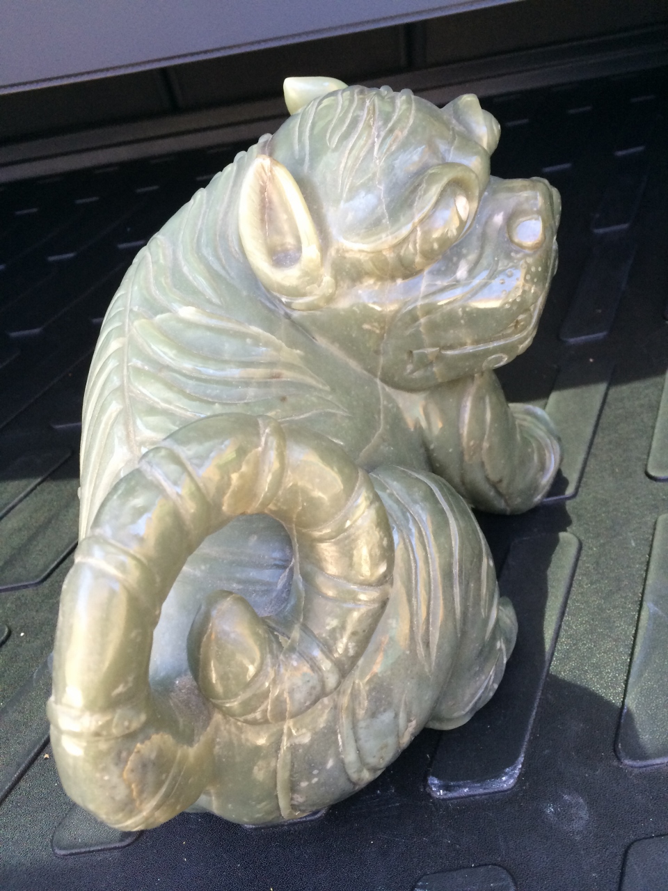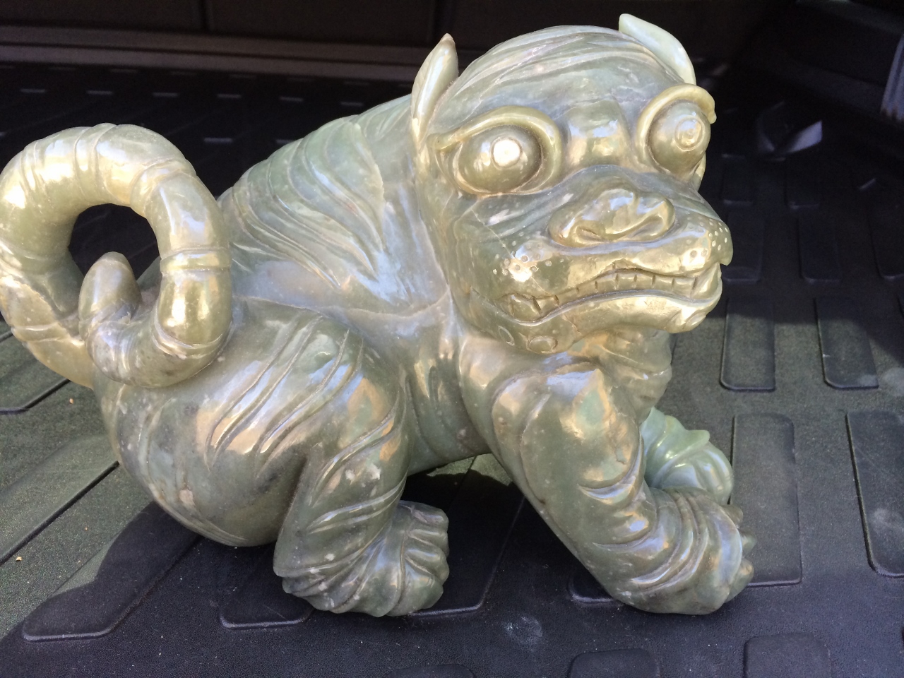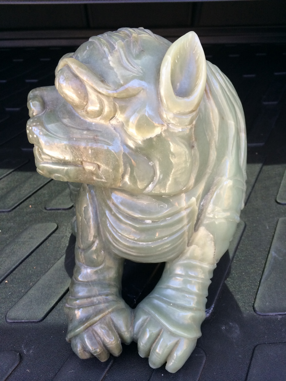 I would like help trying to find out what its origen (province) and age could be based on the style of carvings and colors of jade used to sculpt it. It is obviously a male counterpart although I didn't notice any ball under the foot. Its head is also turned to the side which I have not seen on any other foo dog statues I could find online, usually they are looking straight on.