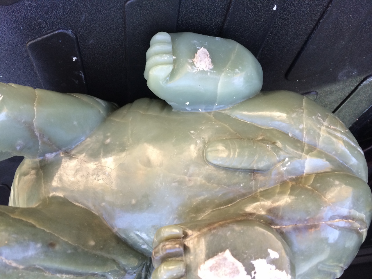 This statue was passed by my father. He was very proud of it and believed it to have great value. I believe it was one of his favorite collections out of many great pieces of art, even by famous artists. It is made of jade and is extremely heavy, probaly around 15KG. I would assume it to be very old or antique do to the way he spoke of it but you never know with Chinese artifacts.