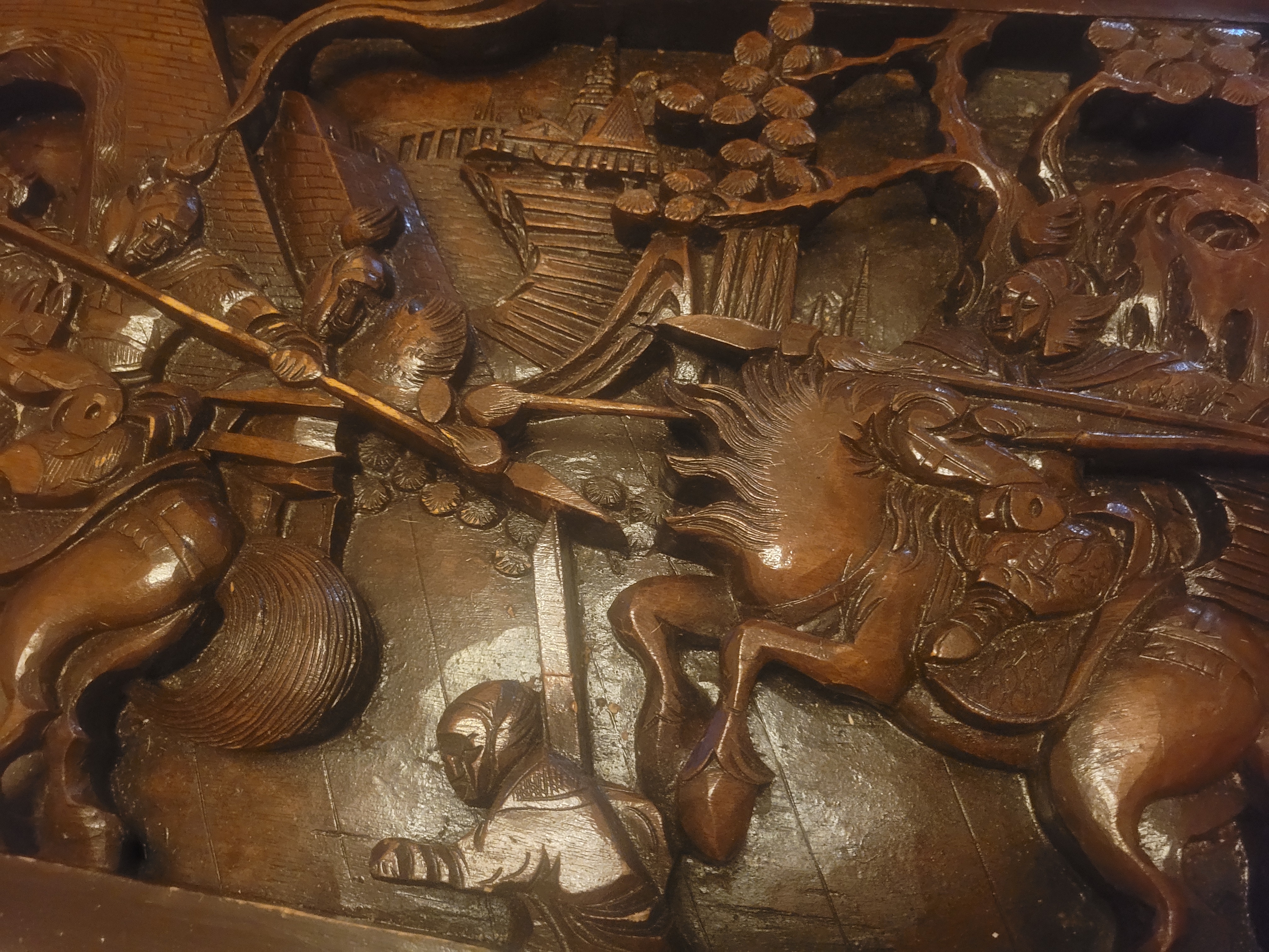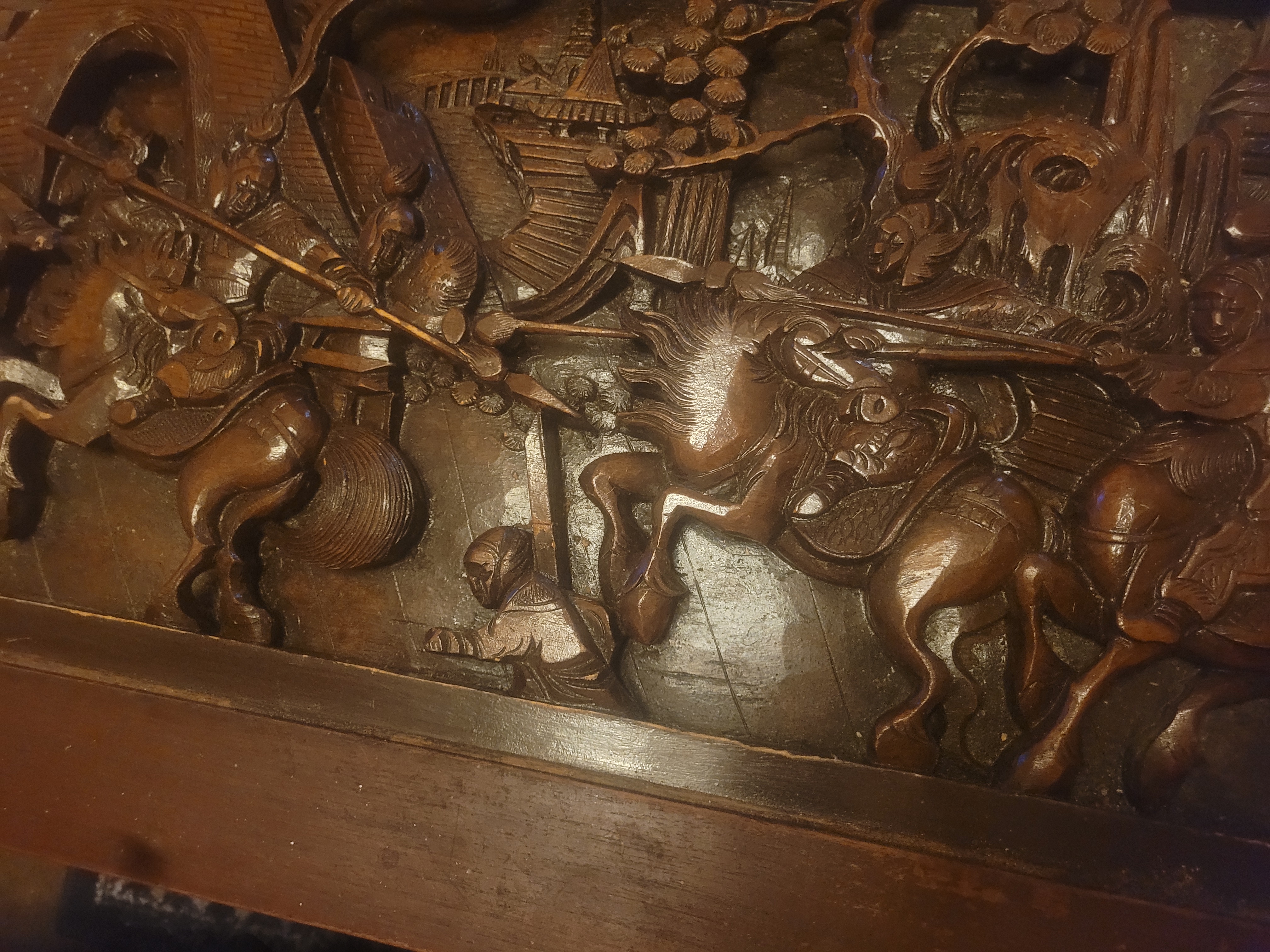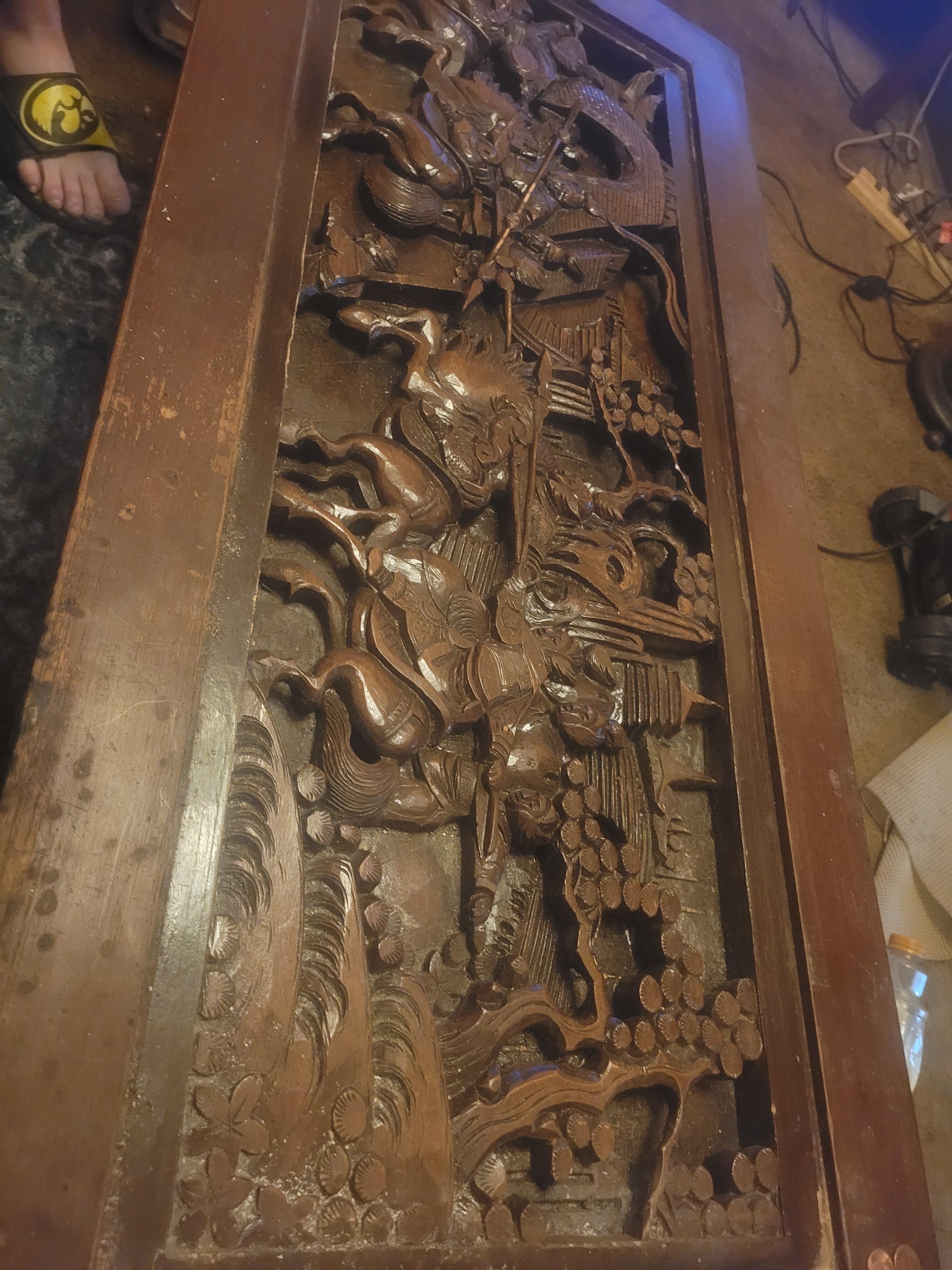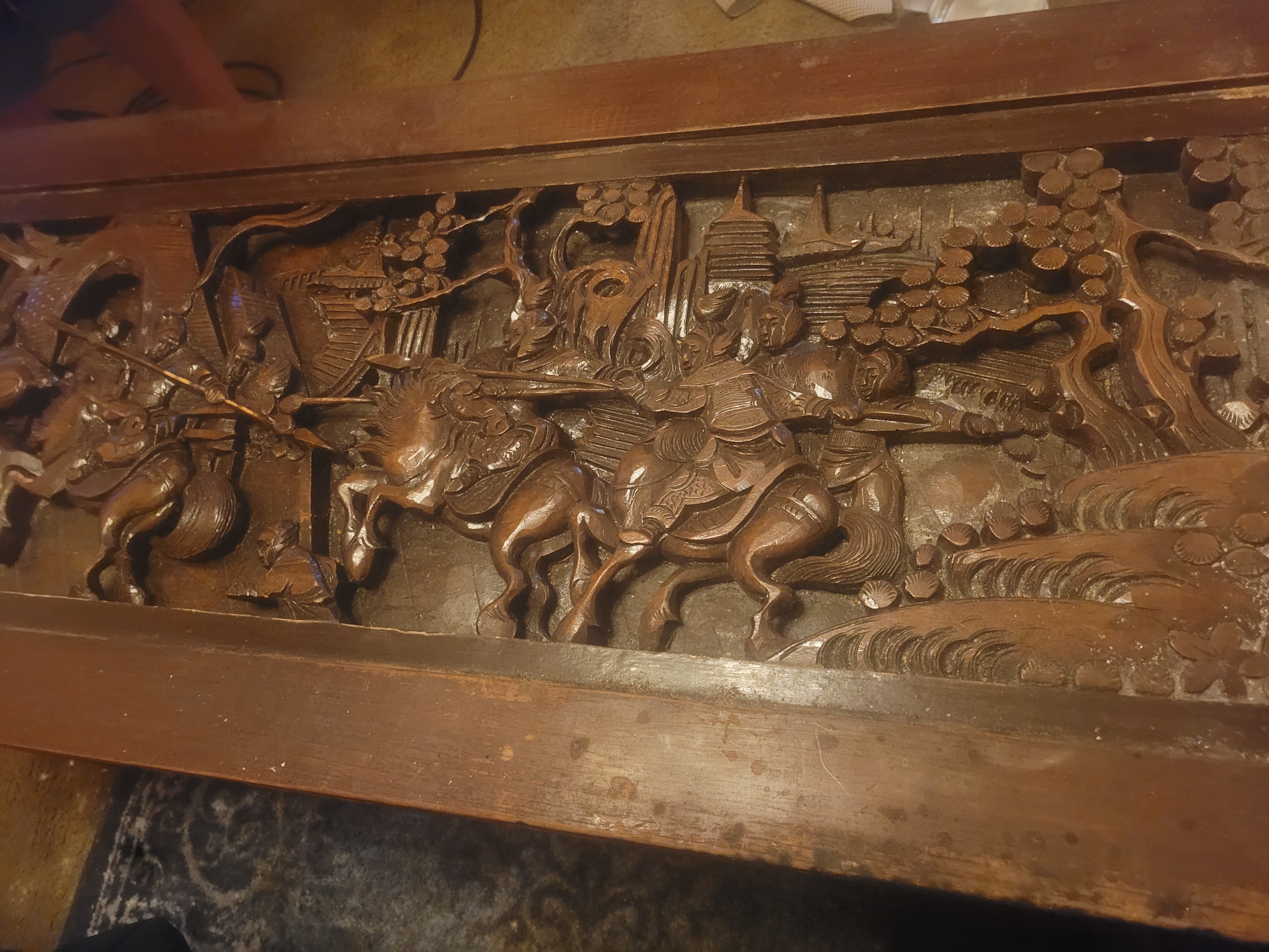 I have an antique chinese hancarved coffee table done in mahogany I believe. The carving is a depiction of some sort of battle. The details in the carving has many similarities to others I've seen but I cannot find the exact one and someone told me because they are handcrafted they are similar but somewhat unique. All of the joints on the table are all dovetail mitered joints with no metal or moder hardware, no nails or screws and no trace of any glue or any indication that any was used. The tables carving is recessed into the table so it had a piece of glass over the surface to make it flat and thankfully protect it a little bit. It has only one marking on it. The marking is a number on the underneath side but besides that nothing. I would like to maybe get an estimated value if I could please. It would be greatly appreciated. I have included photos. Thanks