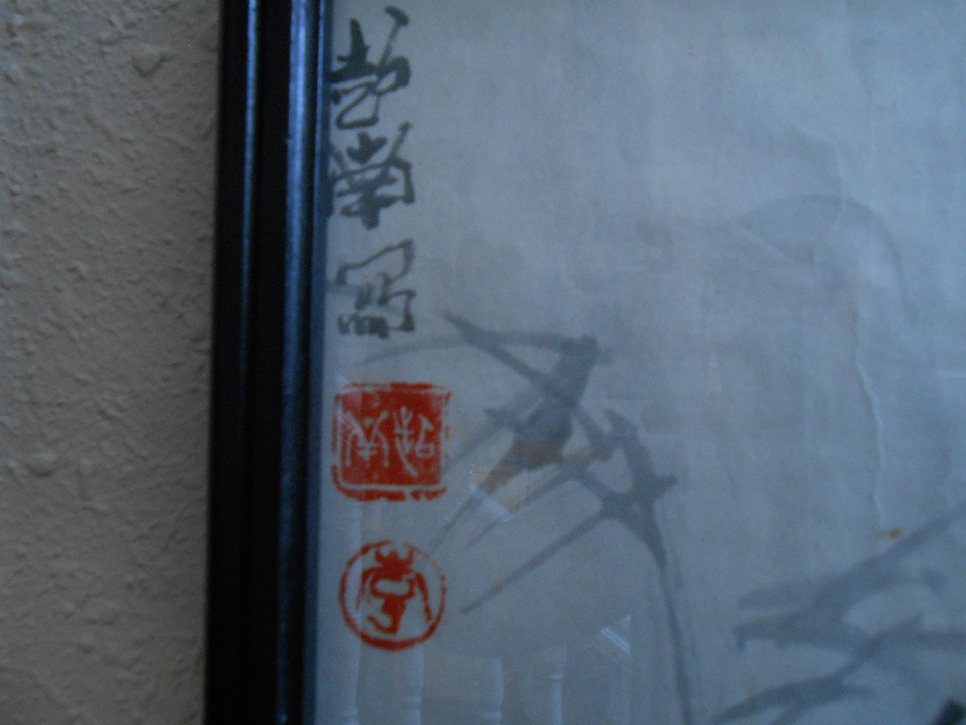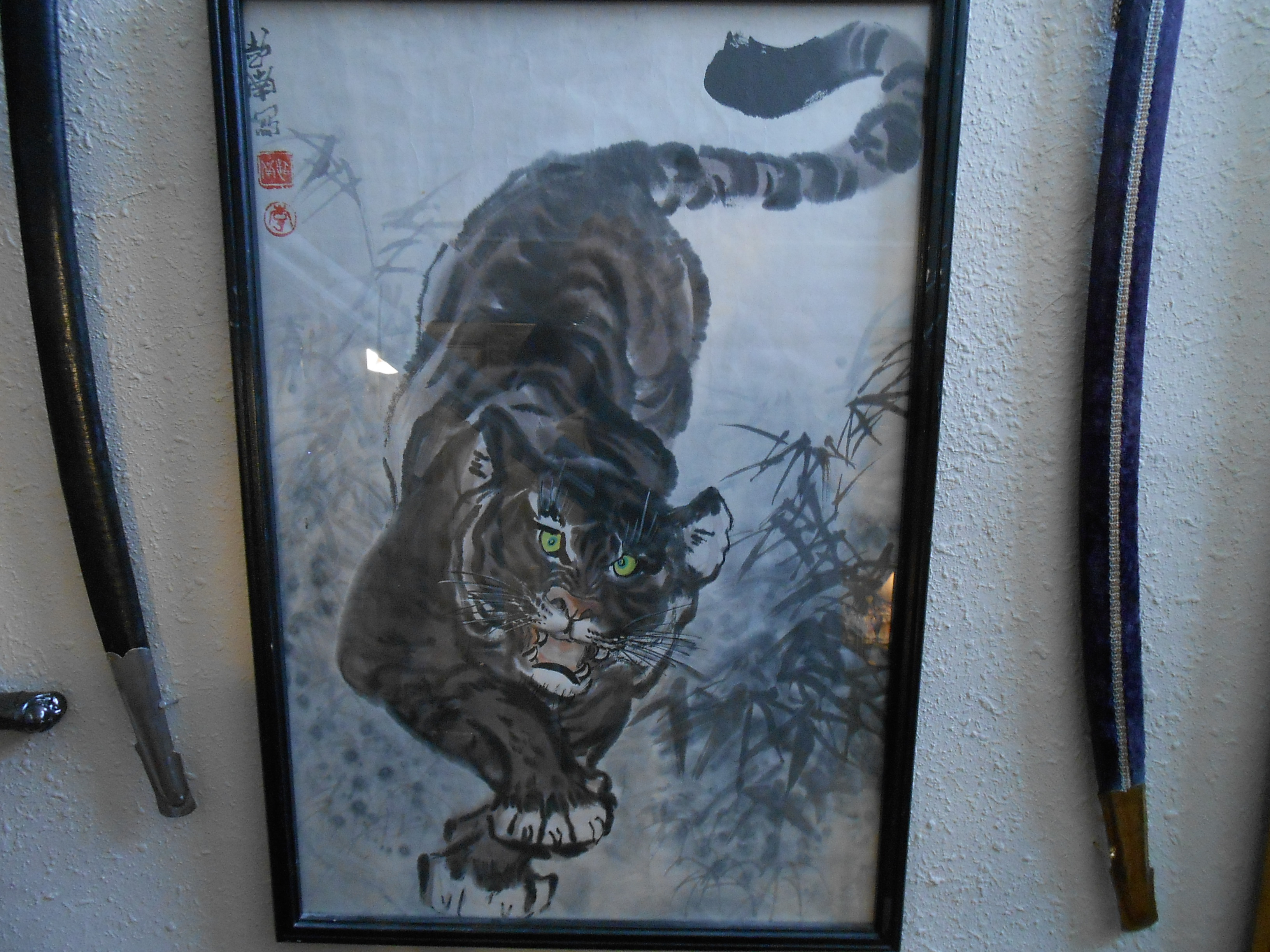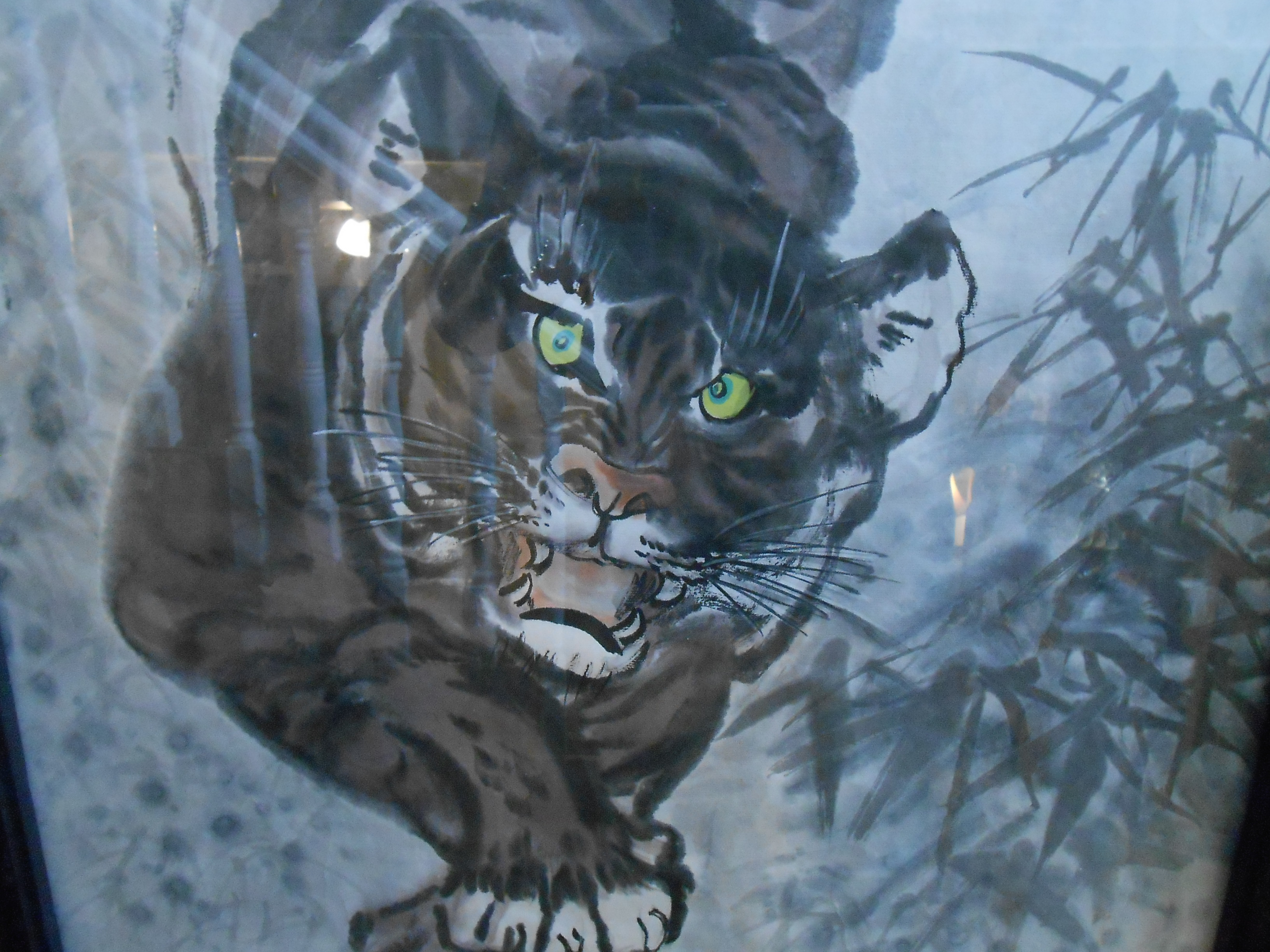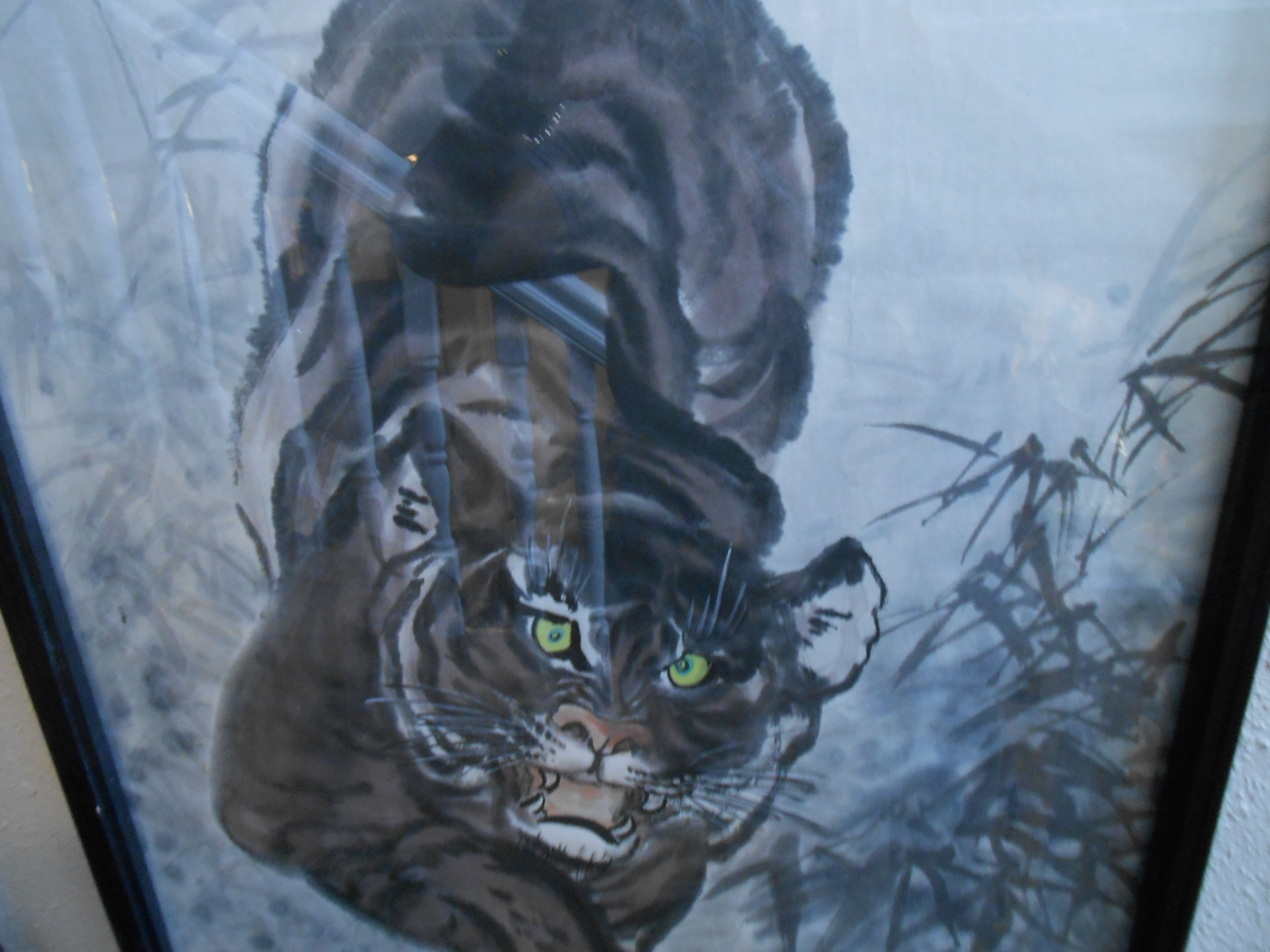 This Antique Chinese Indian_Ink Green Eyes Tiger Painting has a title and is signed, but it is in old Chinese writing, therefore no one can tell me what the title is or the signature. Can you tell me? I would also like to know the value if possible. Thank you. It measures 27" Tall x 18" Wide.