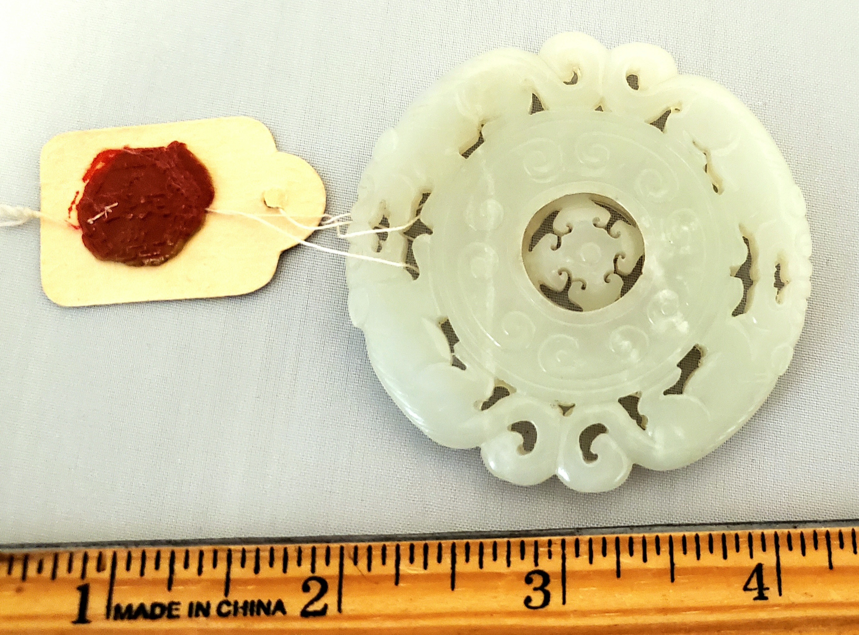 This carved jade piece has a circumference of approximately 2 1/4 inches. It depicts what I believe are large felines facing off. The center rotates.