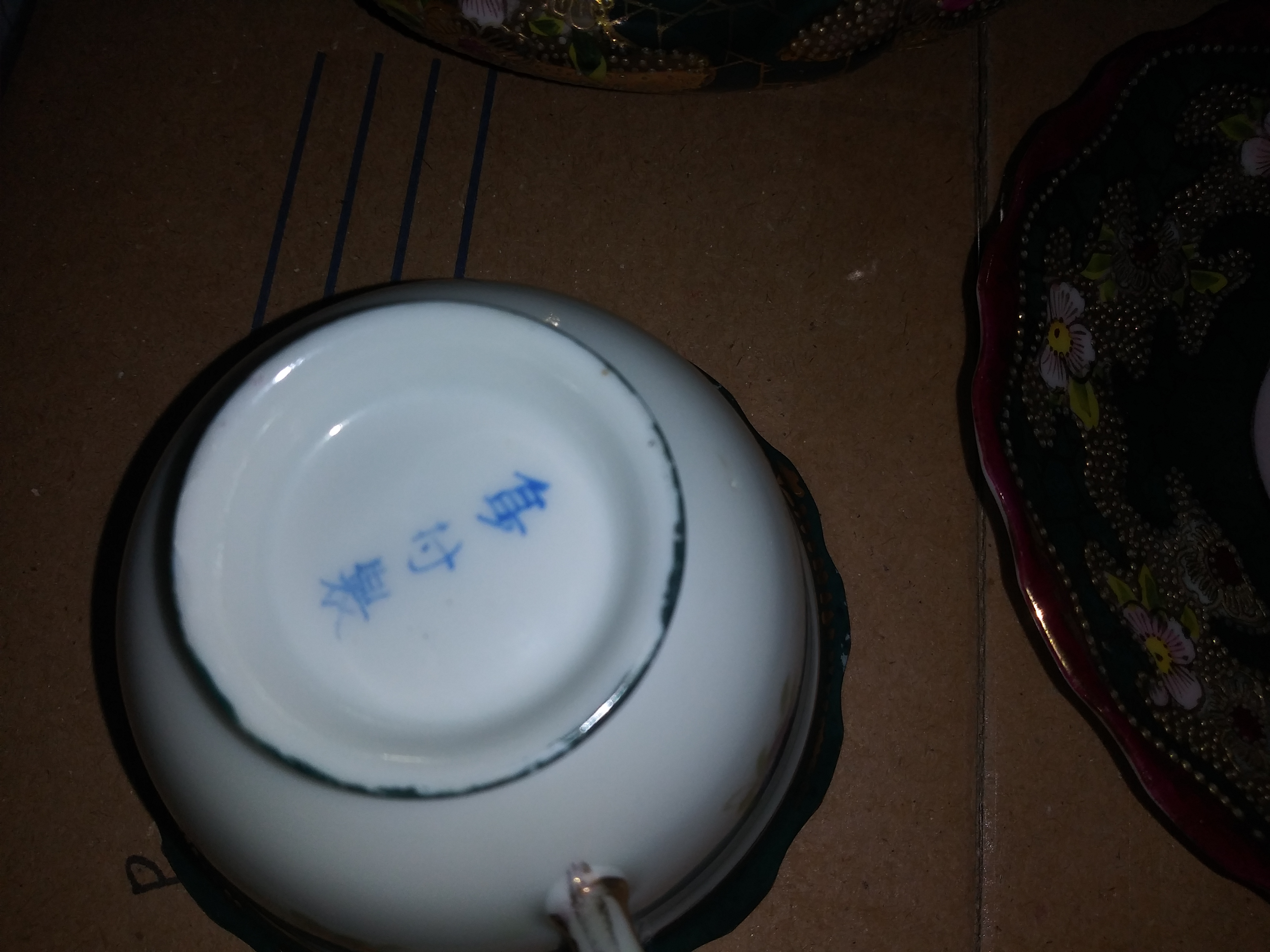 I don't know much about this item. I found and purchased this at an estate sale or thrift store a couple of years ago, and rediscovered it while moving things in my basement! I have tried to find a dynasty(?) mark or a maker's mark similar to it online, and have had zero luck. The inside at the spout has multiple holes. None of the pieces have no vivible damage that I can find. The same handpainted symbols appear on the bottom of the teapot, and the teacup. There is a lot of gold, dark green, and magenta as well. Anybody know anything, or even just recognize the marks? The teapot is approximately 5.5"x7.5"x 5.5". Thank you!