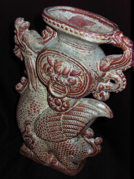 CHINESE POTTERY VASE, WINGED DRAGON WITH BALL IN MOUTH AND WITH TAOTIE LIKE ANIMAL FACES IN LOW RELIEF WHOSE MOUTHS SUPPORT RINGS. HEAVLY WEATHERED WITH ONLY TRACES OF THE ORIGINAL COBALT BLUE GLAZE REMAINING. POSSIBLE REPAIR TO THE BASE.