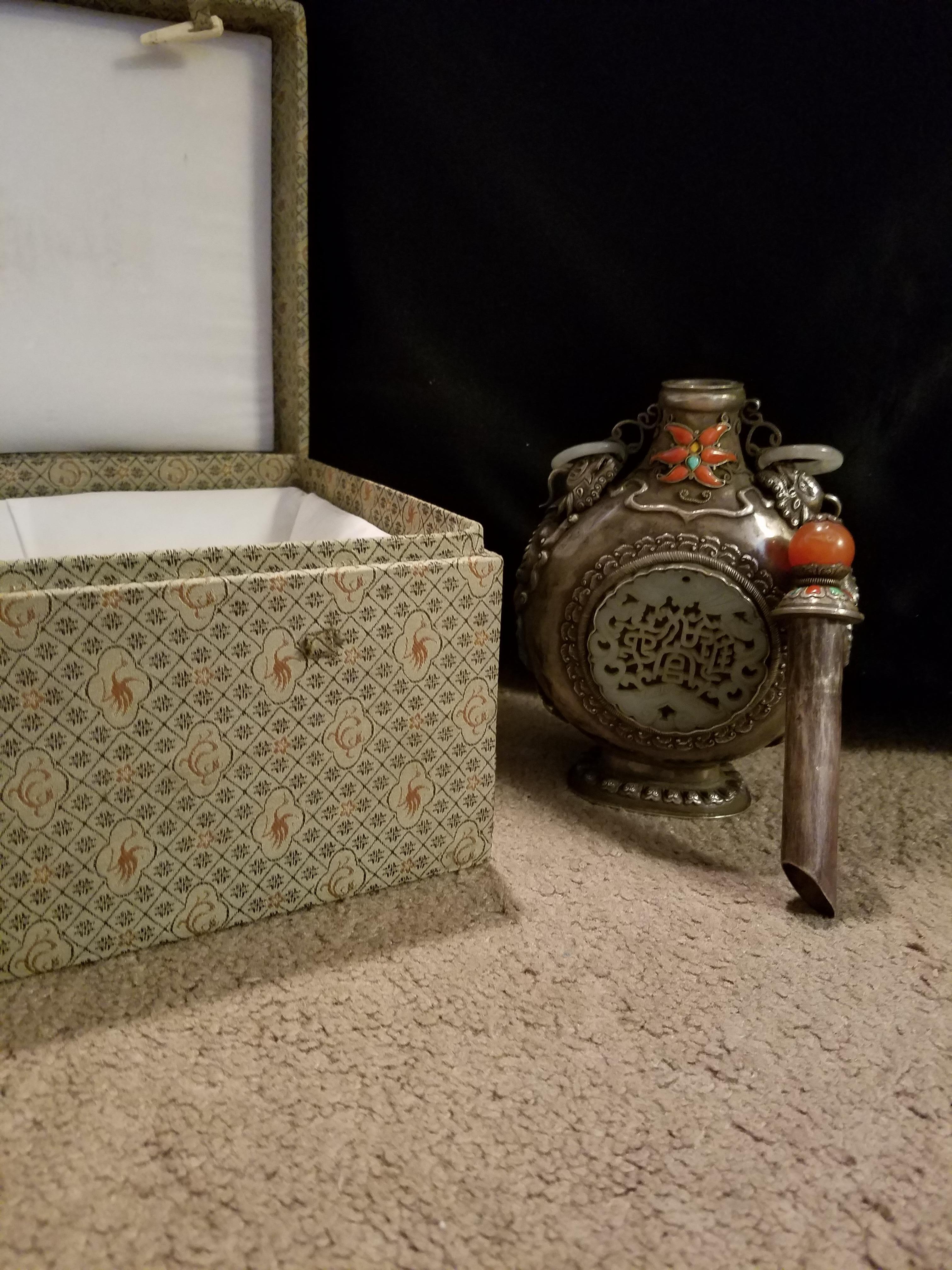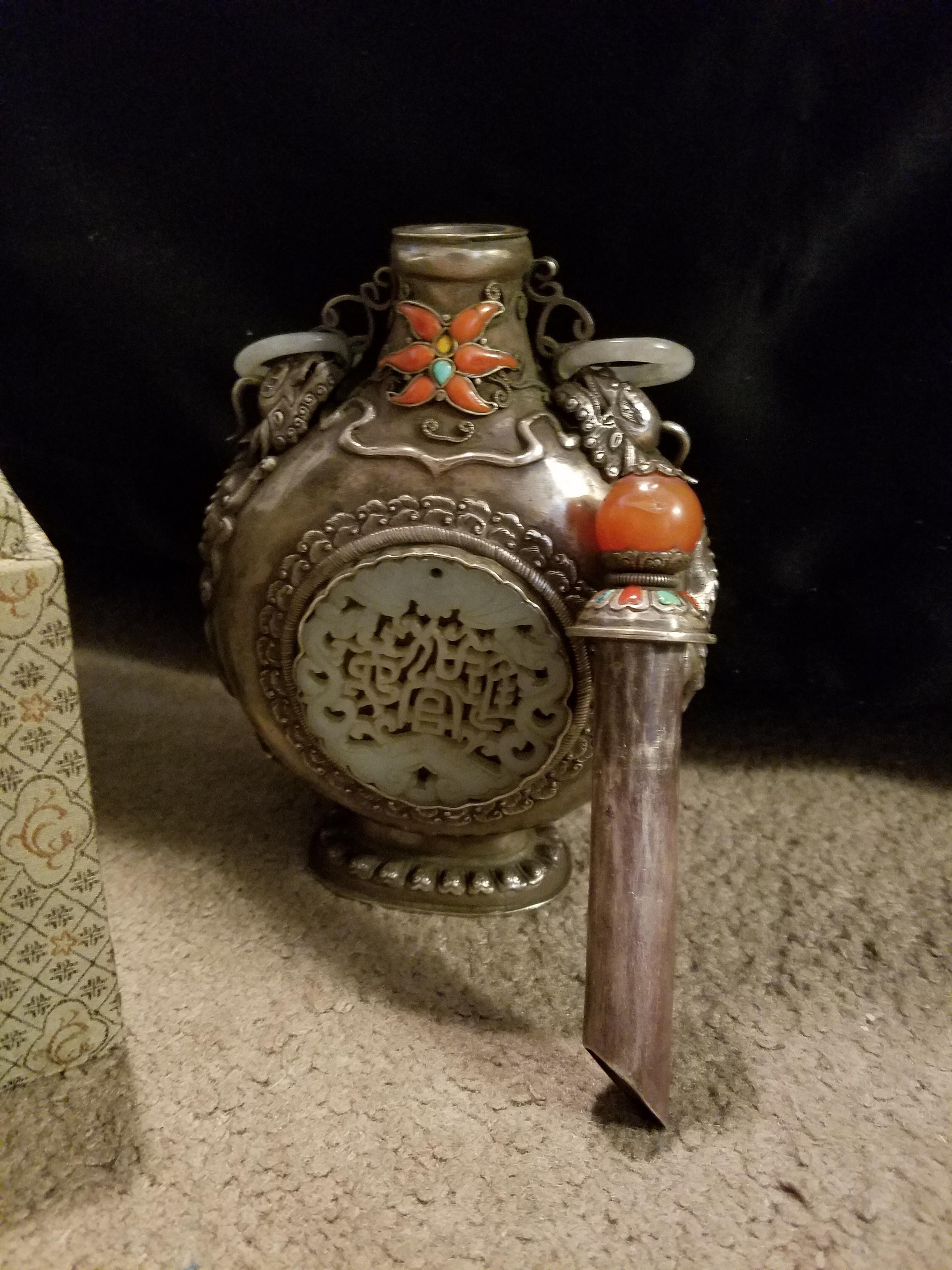 I have a Chinese Silver Bottle with Jewels which I believe to be a Snuff Bottle . It looks like jade inlaid on both sides. It measures approximately 6" and comes in a cushion box.
