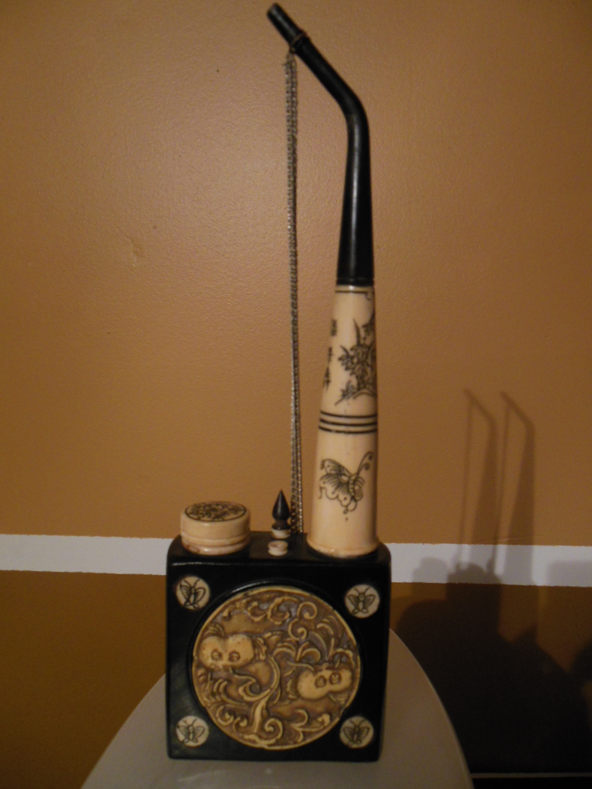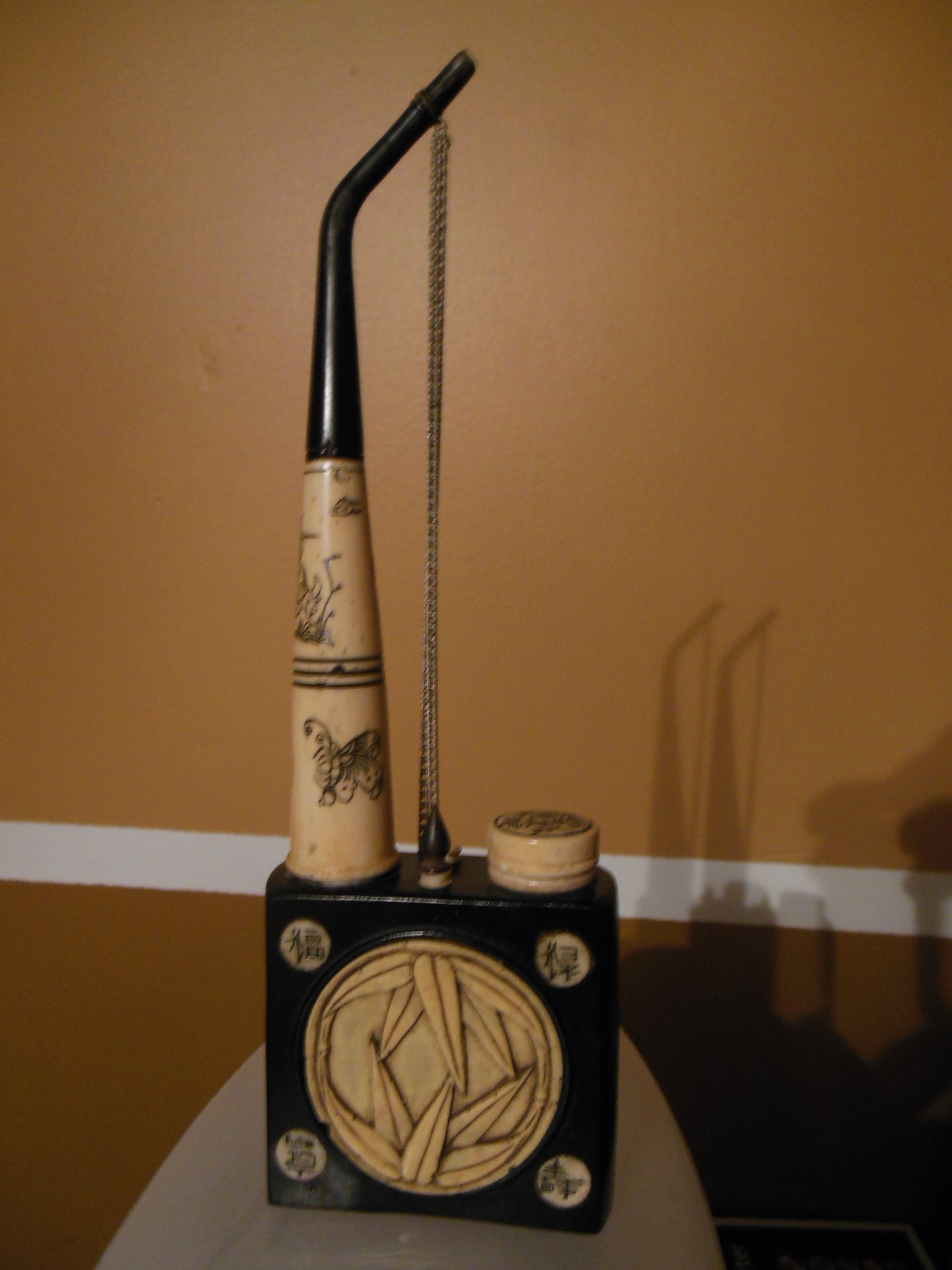 I found this pipe at a Swap Meet, and have been trying unsuccessfully to find where it’s from and what it might be worth. It is very detailed and I believe is made of bone and has bone inlay. It has a removable pick in the middle, a removable cap one side and the pipe itself also can be taken off.