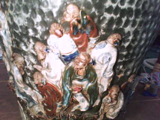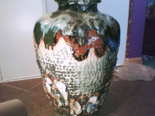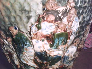 The vase incased with hand-made Chinese characters that have been molded to it. the Chinese characters are dressed in robes and have their hair pulled back as if they are Chinese monks. they are in an outside setting around the entire vase and they seem to be doing different things. The mountains and the sky have been "fingered in" throughout the vase as well. Very one of a kind, unique vase. I have never seen another one like it.