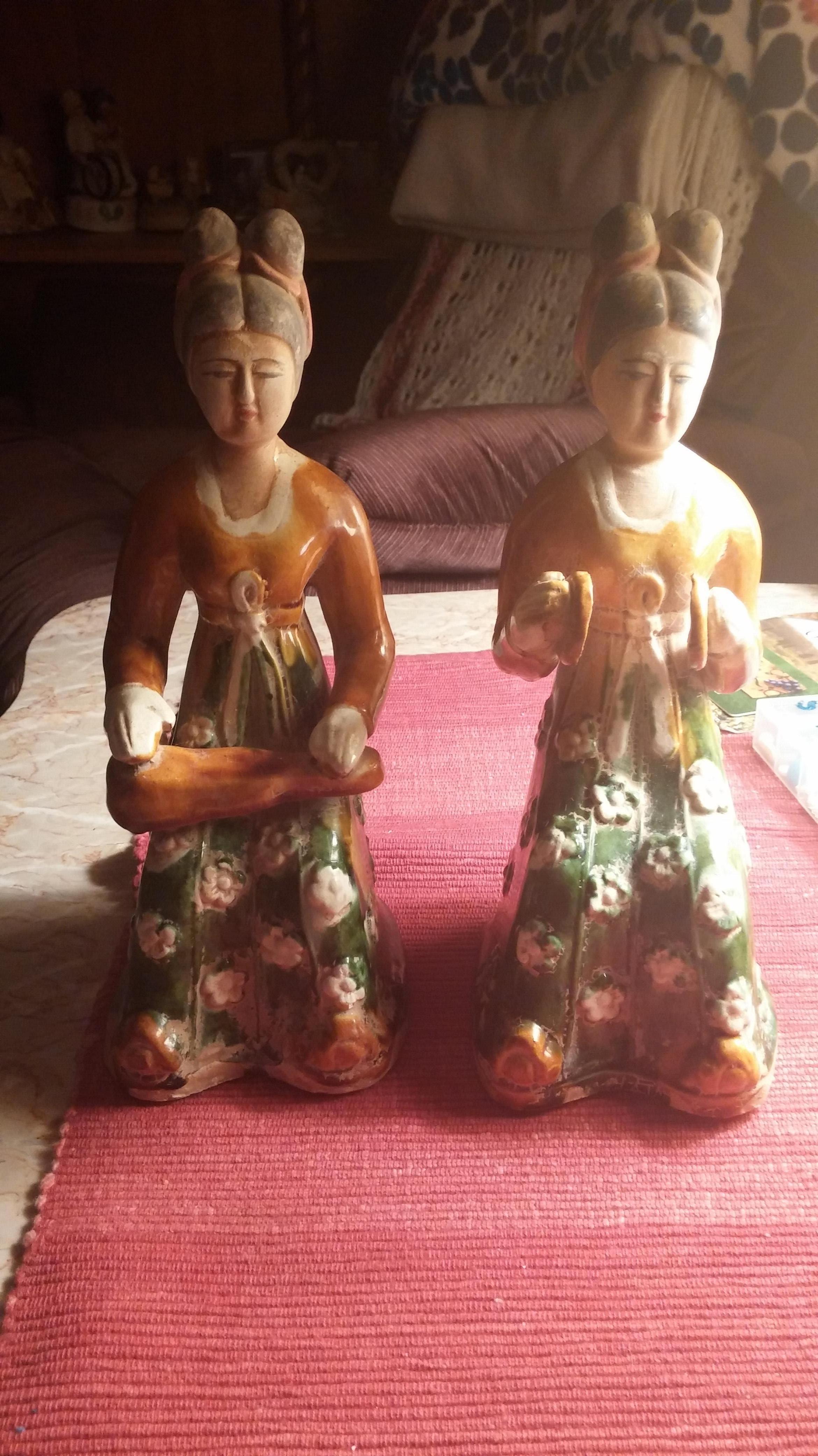 These are two antique Tang Dynasty tri-colored music playing females. In very good condition with no chips. hey measure 9 inches in height. Any ideas or suggestions as to worth or what I should do with them would be greatly appreciated.