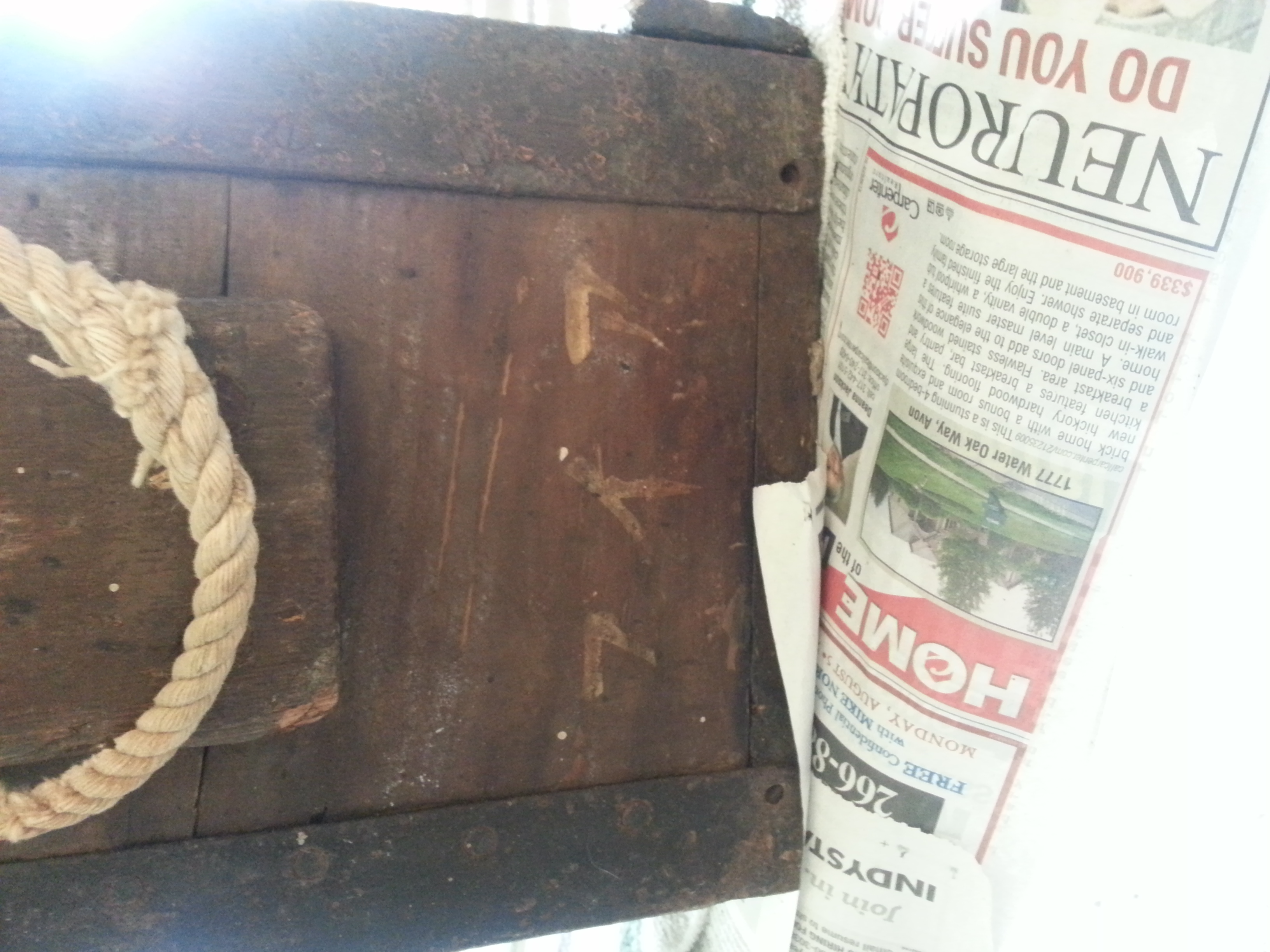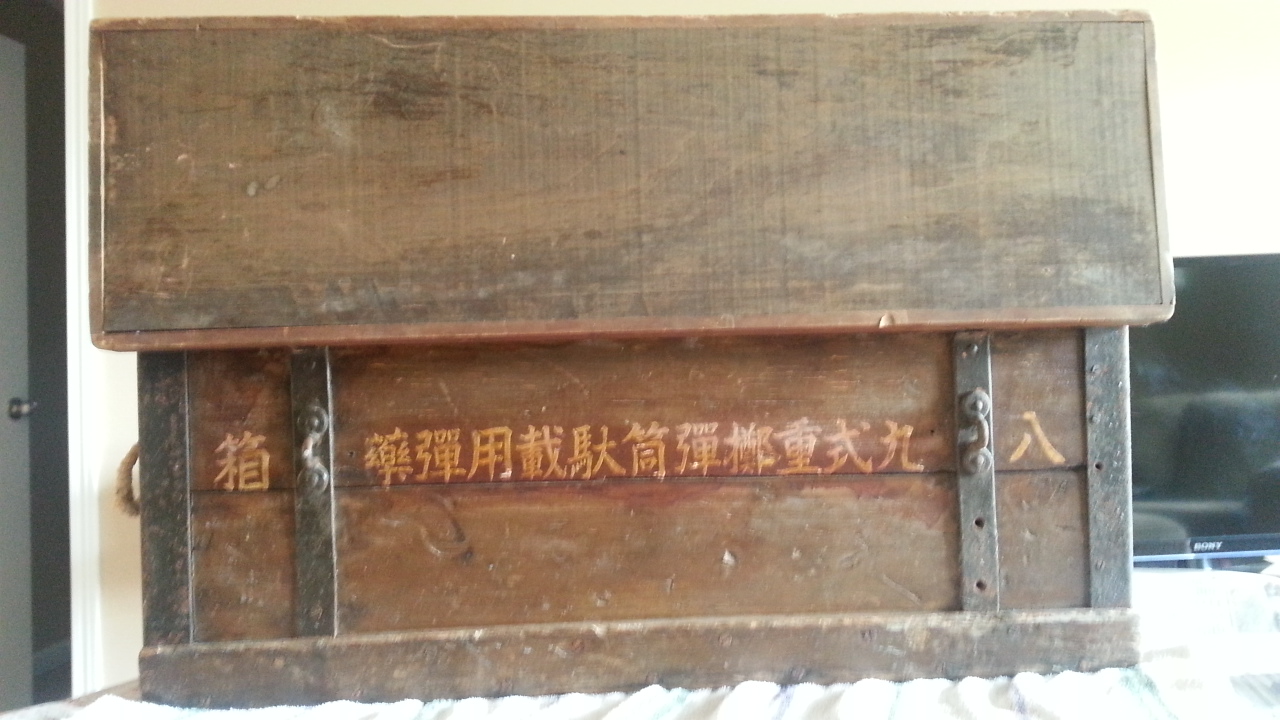 My uncle gave me this trunk the other day. I have no idea how old it is, what it is worth, or what it says. Inside of it was a dish or a bowl and a bunch old newspapers. Some of the headlines were about the Kennedy Assination, the first man on the moon, and etc.  Any help will be greatly appreciated.
