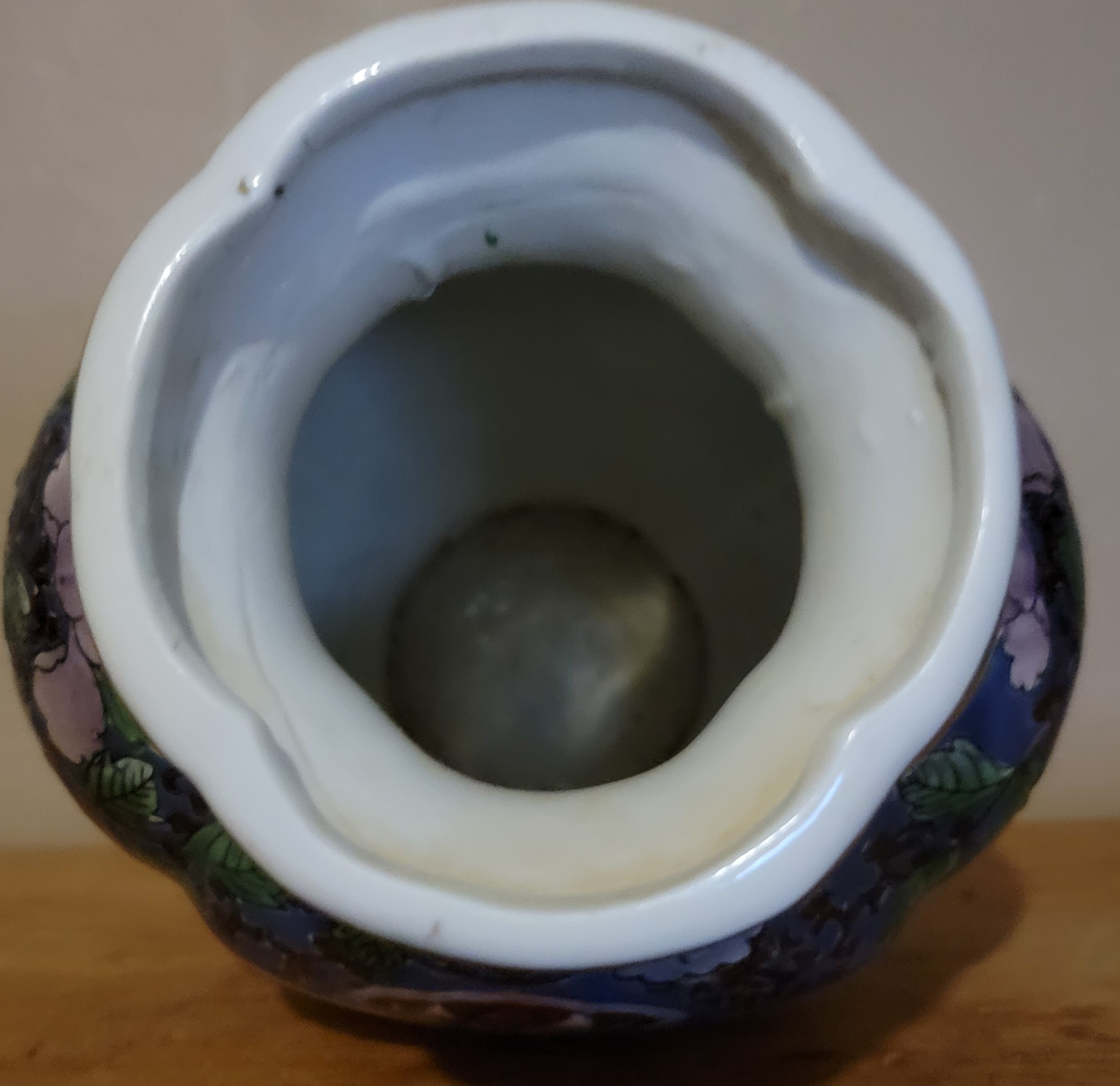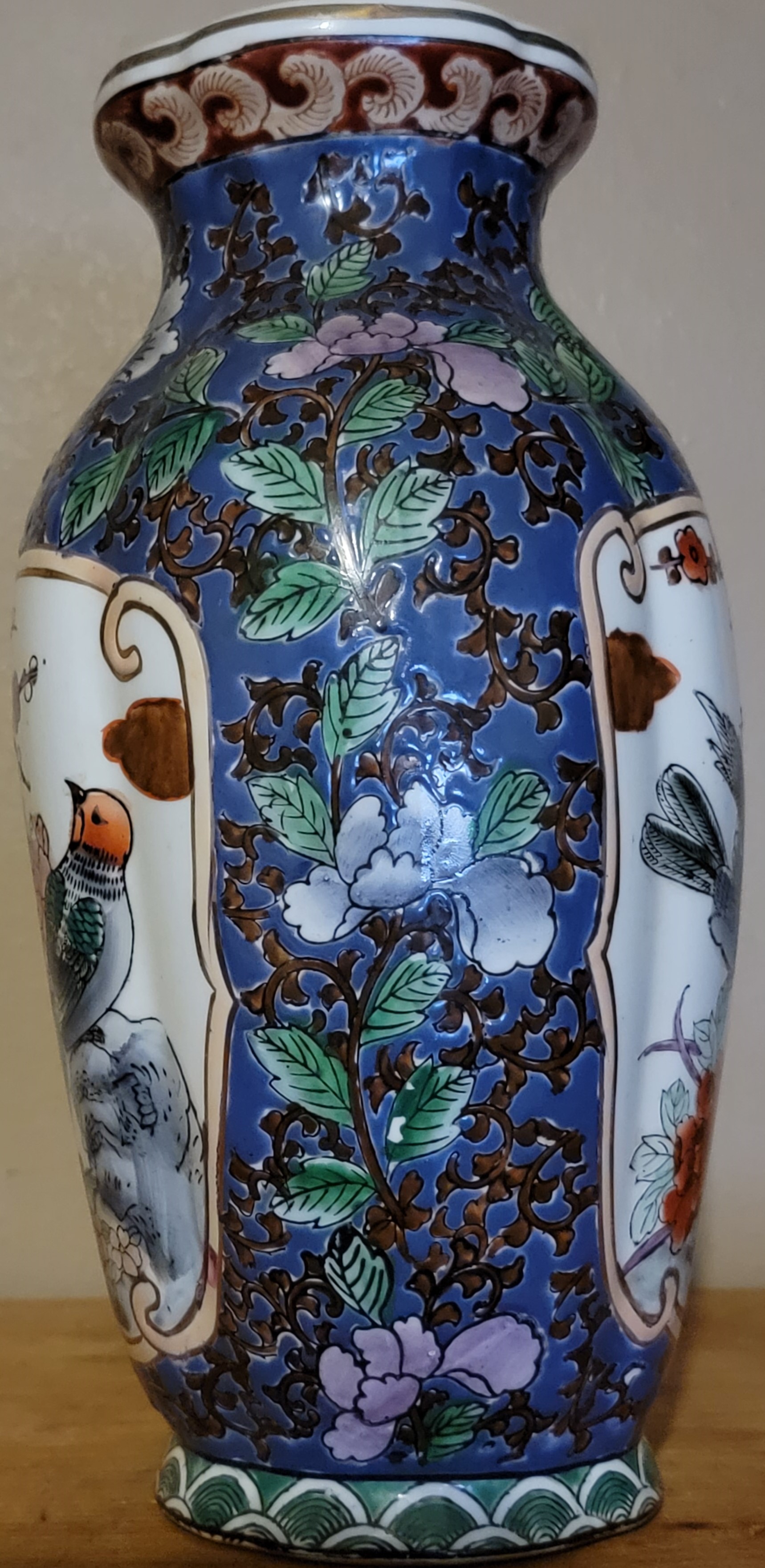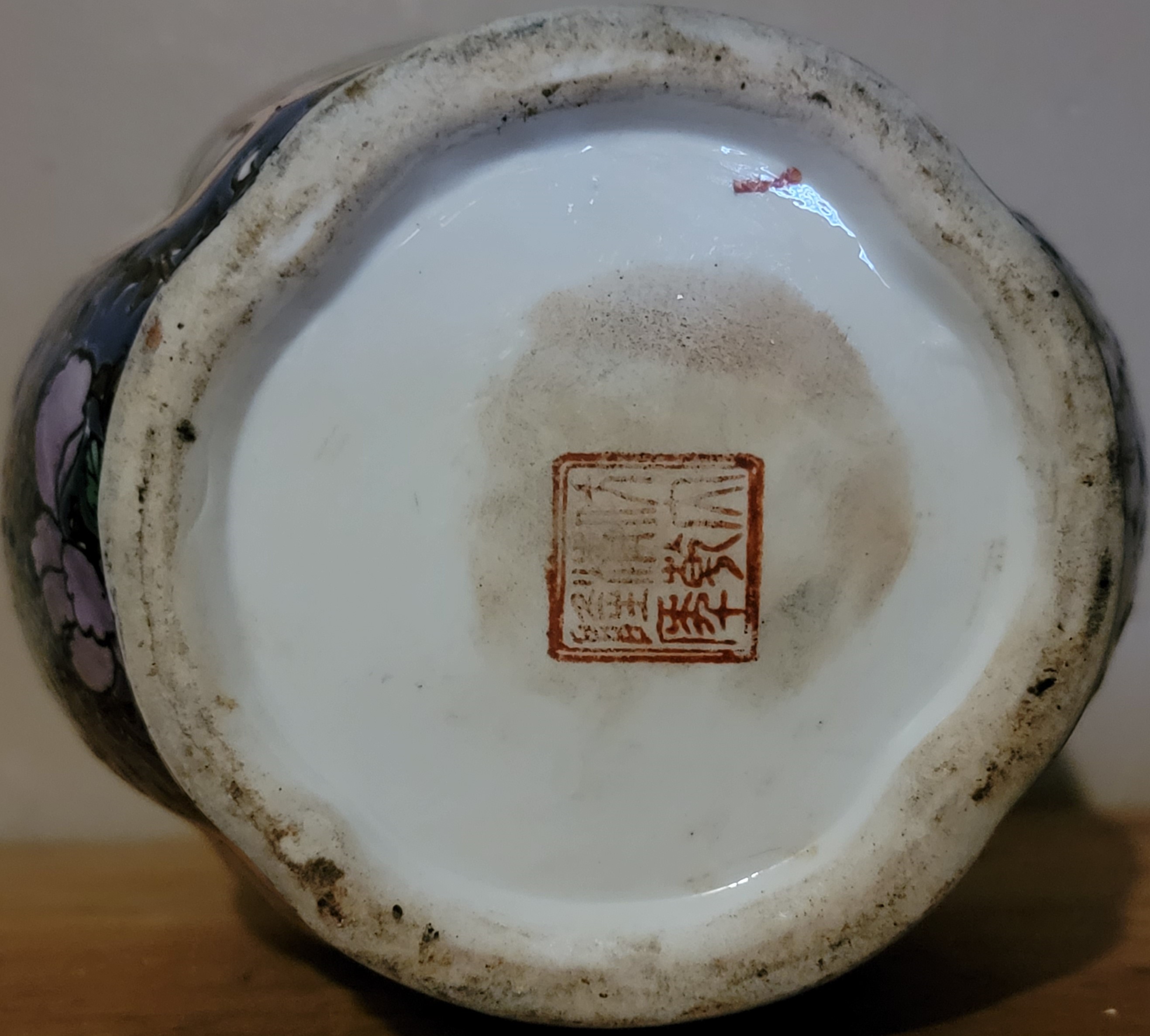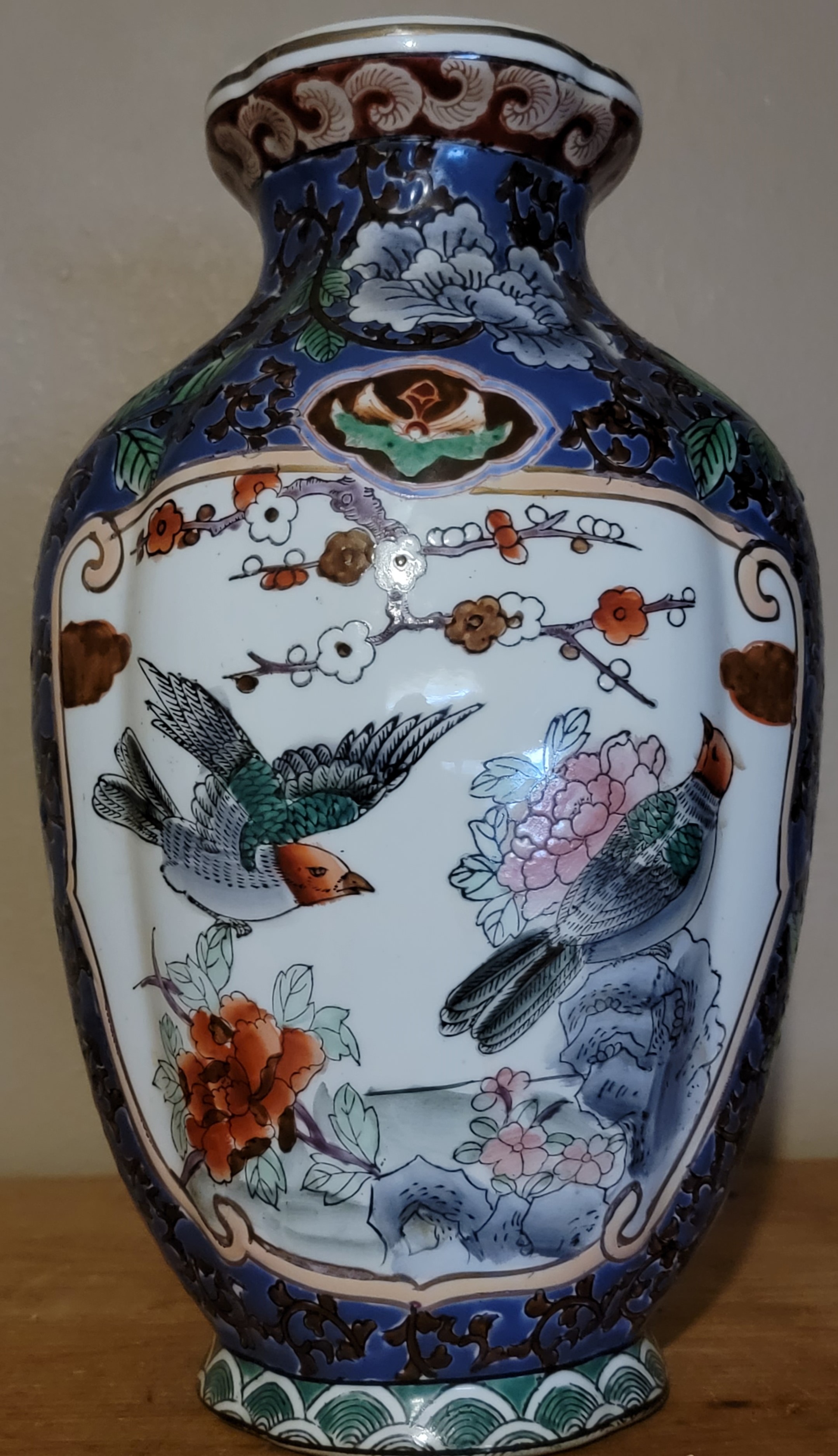 Appears to be a ceramic or porcelain vase with the same painting of birds and flowers on each of the wider sides. On the base is a red stamp with what appear to be Chinese characters. Unfortunately, that is the extend of my knowledge of the piece.